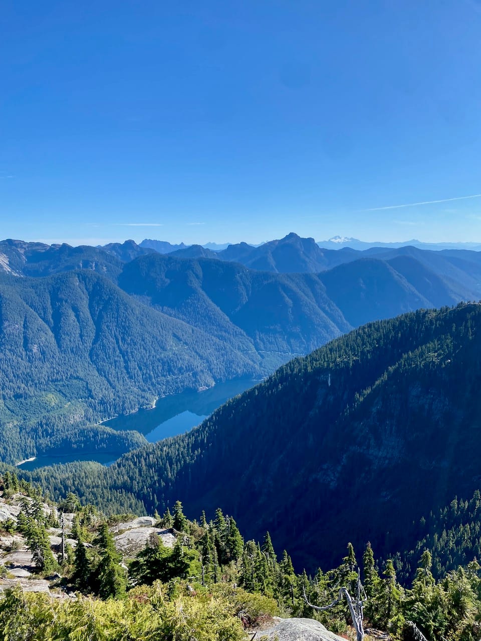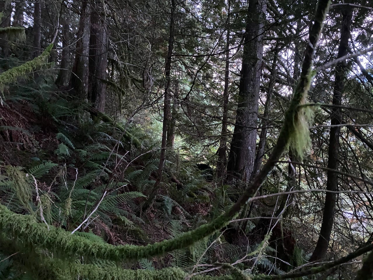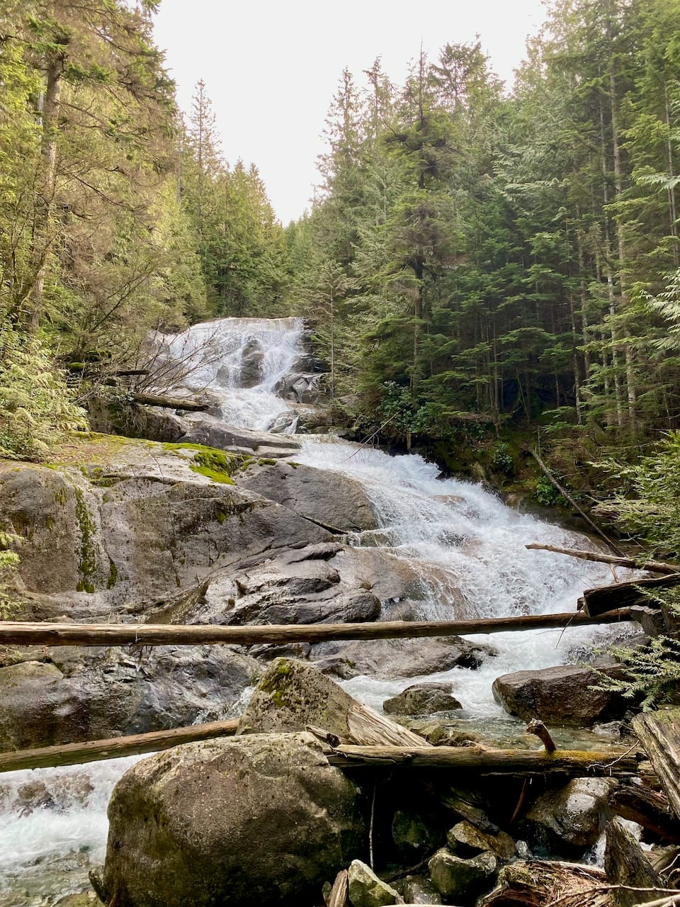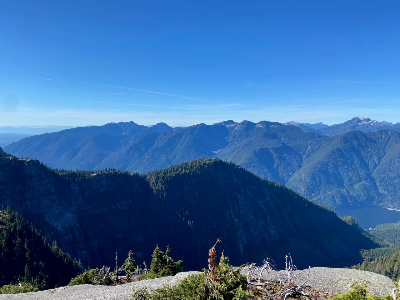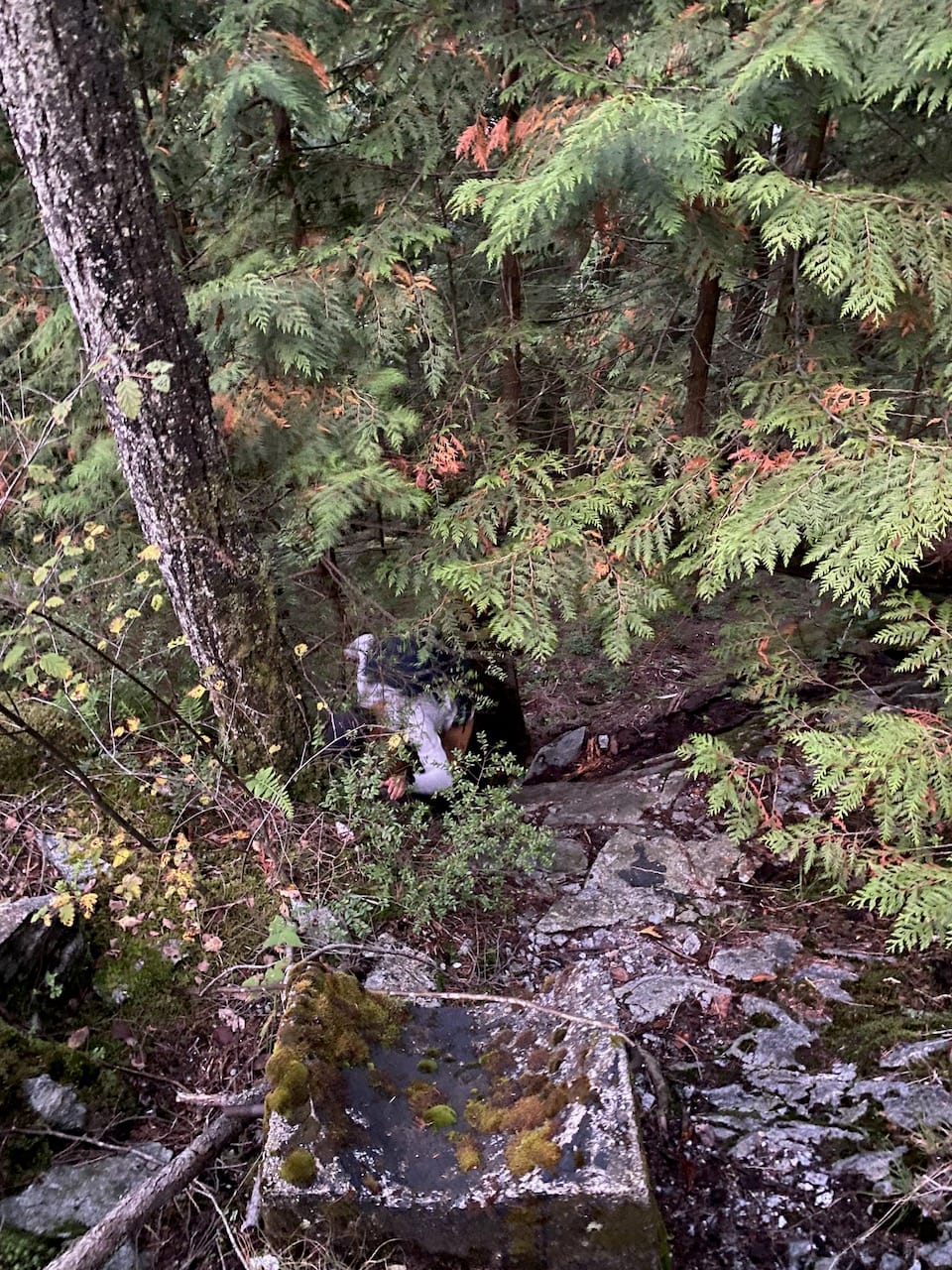 We returned to the Indian Arm Trail at a relatively rushed pace. At one point, we climbed down a tree to descend a cliff, and my phone fell out of my pocket. Luckily I retrieved it. The descent to Grand Creek went quickly.