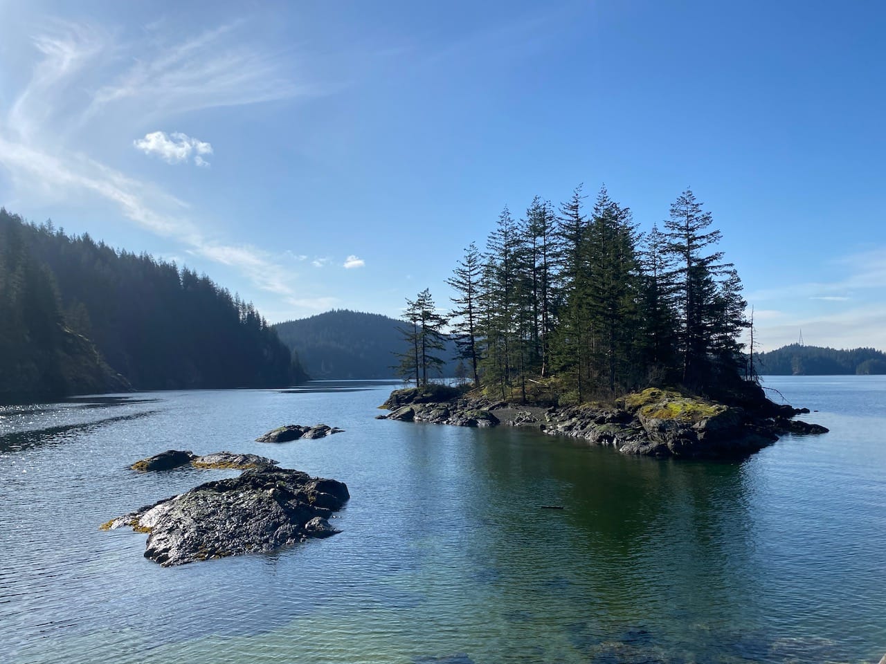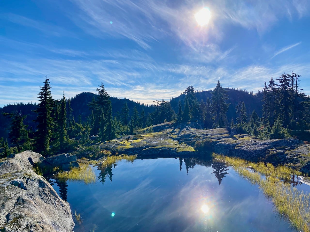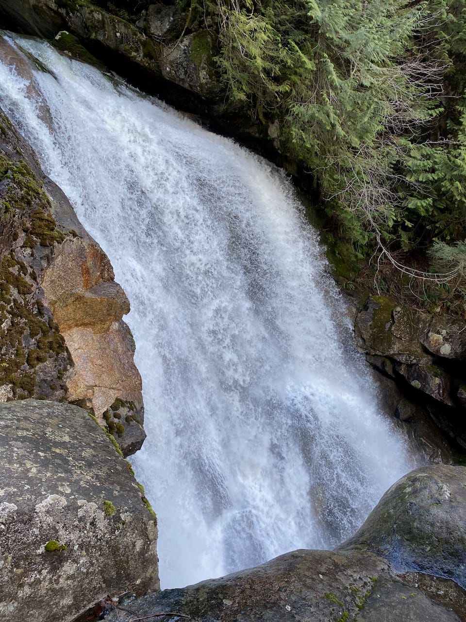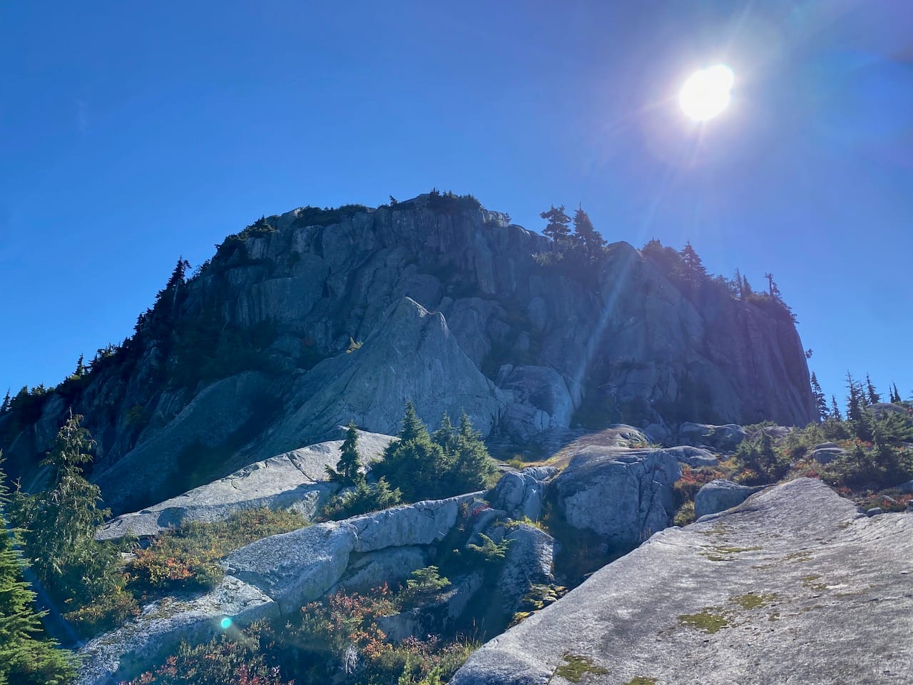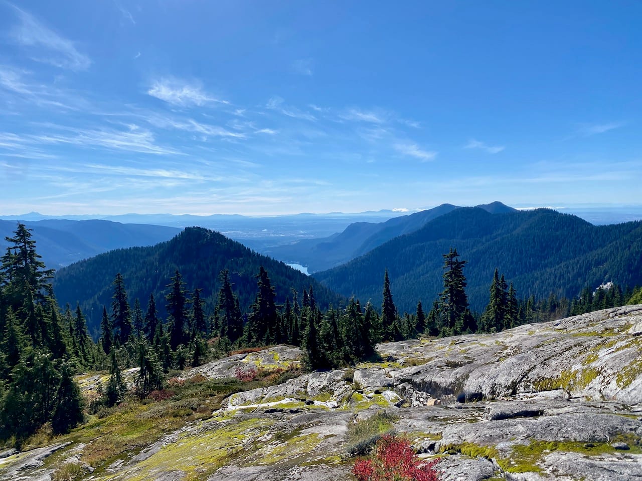 We returned to the Indian Arm Trail at a relatively rushed pace. At one point, we climbed down a tree to descend a cliff, and my phone fell out of my pocket. Luckily I retrieved it. The descent to Grand Creek went quickly.