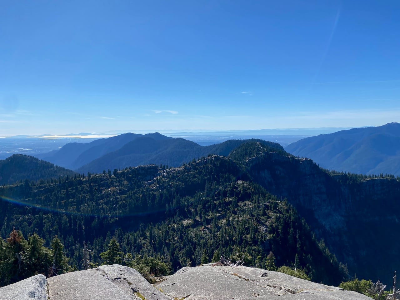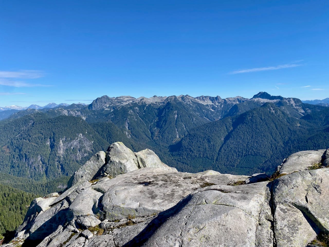 The view was spectacular. Meslilloet and Garibaldi to the north were highlights. Parts of Greater Vancouver could be seen to the south behind Eagle Ridge. To the east and west, cliffs guarded Grand Creek and the forbidden Coquitlam watershed. Interestingly, we could only see a small portion of Indian Arm itself. There was a collapsed cairn on the highest point, but no summit register.