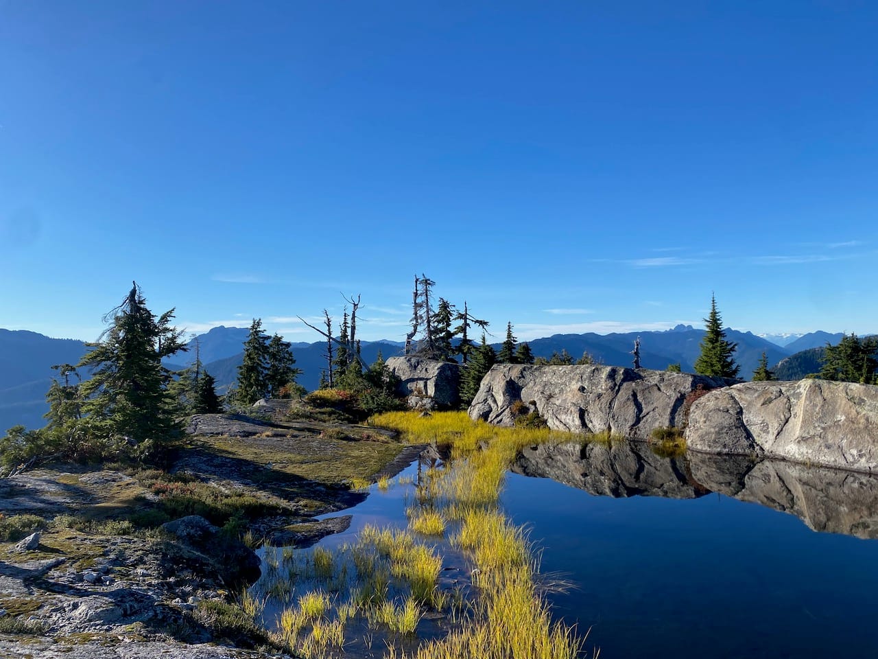 The trail leaves the ridge and enters a gully, where flagging briefly resumed, then emerges onto a small bump on Eagle Ridge, next to a deep tarn. At this point we left the Indian Arm Trail, continuing north along the ridge. Almost immediately, we found ourselves at the top of a large cliff with no obvious way down.
