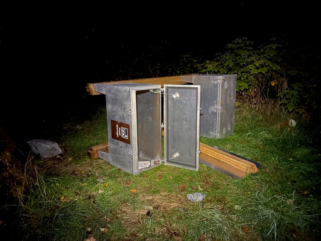 At sunrise we searched again. Drag marks in the dirt led in the direction of the forest. More alarmingly, something had knocked the bear cache over in an attempt to get at our food. Thankfully the container held.
