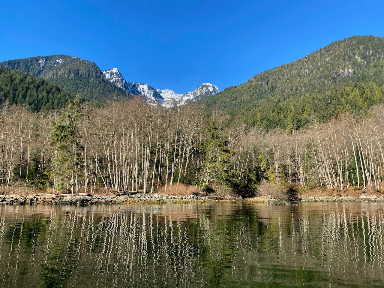 Paul and I left Deep Cove at sunrise and canoed north to Granite Falls. I’d been to Indian Arm many times, but never in spring. It was even more peaceful than in the fall, with snow blanketing the mountains and almost no other marine traffic. After a short stop at Berg’s Landing, we reached Granite Falls.
