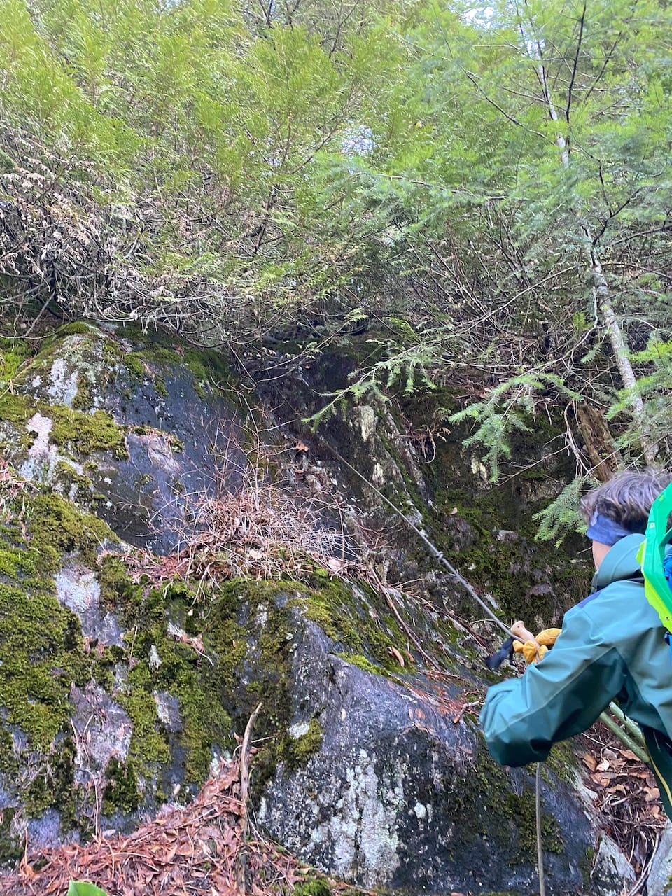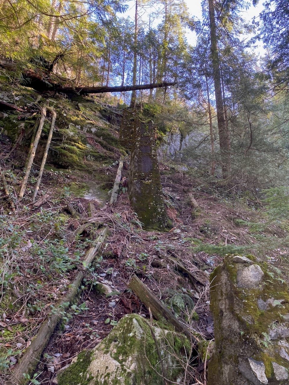 Our first task was to climb above the waterfall. From the 1880s to early 1960s, Granite Falls was the site of a quarry (see Ralph Drew’s website for a detailed history). The excavations made the natural topography even steeper, creating cliffs requiring some scrambling. I’d seen references to a “faint trail” on the north side of the falls, and we did find one, but it headed north and dead-ended at a flat area marked with rocks where structures had once stood. We bushwhacked closer to the falls and found another faint trail heading up the bluffs. There was one very slippery section with a fixed rope of uncertain quality. (There’s another trail a bit closer to the falls, with another sketchy slippery section and fixed rope. Be very careful on either trail).