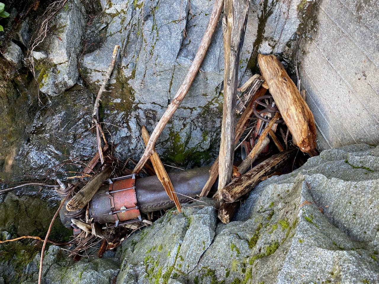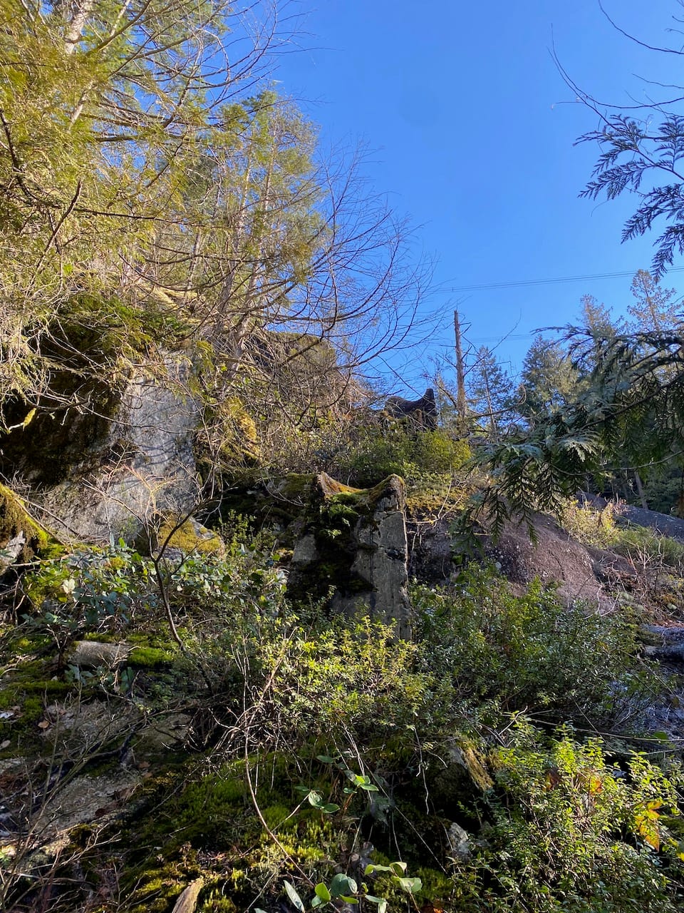 We hiked/scrambled upward, partly though the forest and partly over bare granite beside the creek. Granite Falls is just the final drop in a long series of beautiful cascades and pools carved into the granite by the water. The falls were the site of a resort in the 1960s, and some artifacts from that time remain. Eventually we reached the Indian Arm Trail, which initially follows a logging road.
