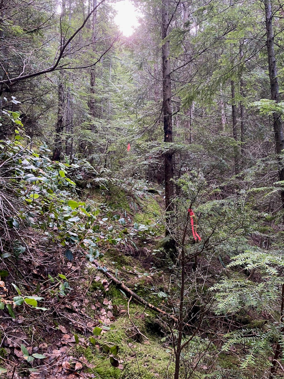 At 500m we reached another long-abandoned logging road which crosses Flume Creek. From here the IAT was surprisingly well-flagged! At eye level, there were flags every few metres in most places. Underfoot, since this trail sees so few visitors, it was hard to tell that anyone had walked here. It felt somewhat surreal.