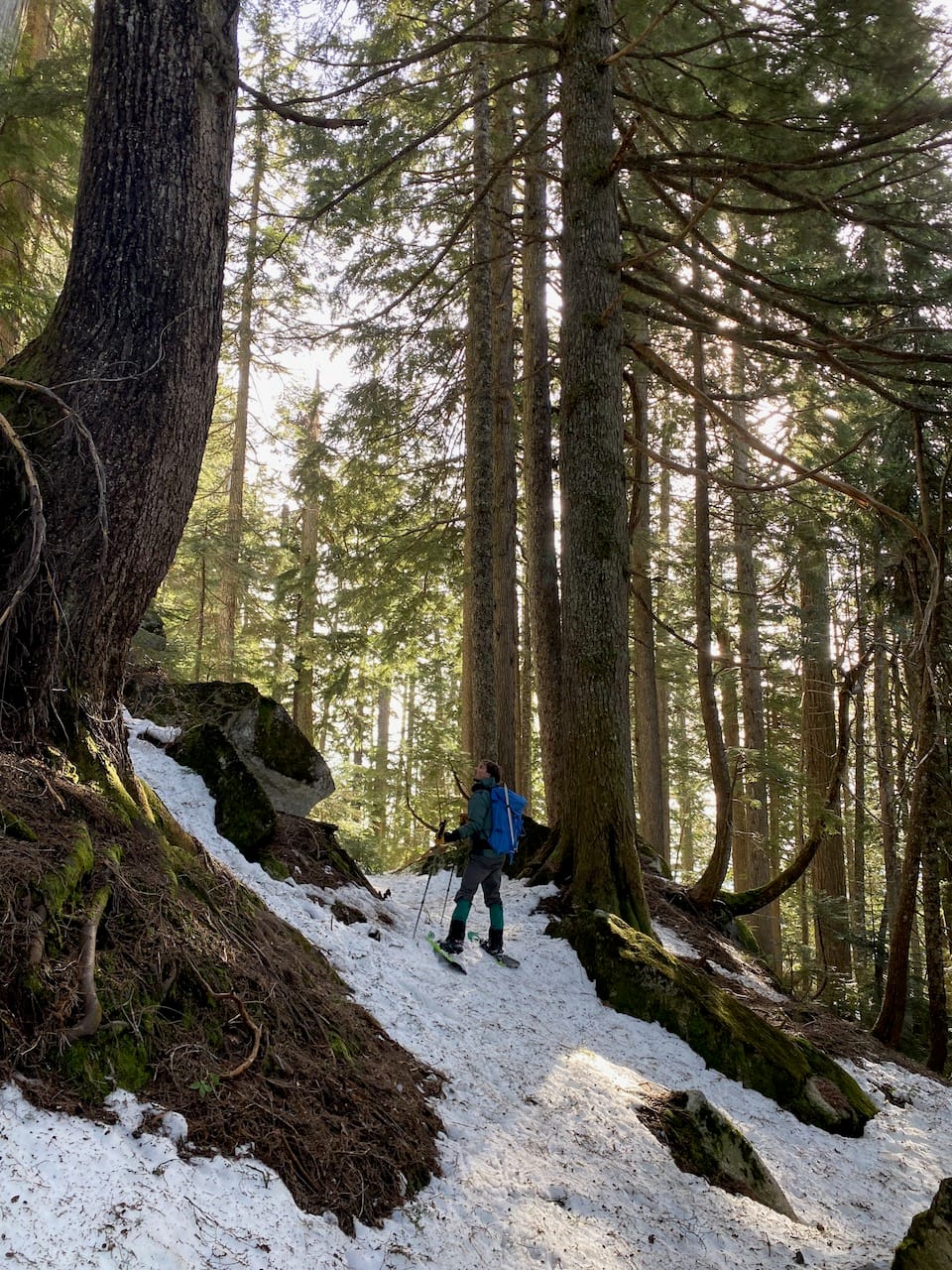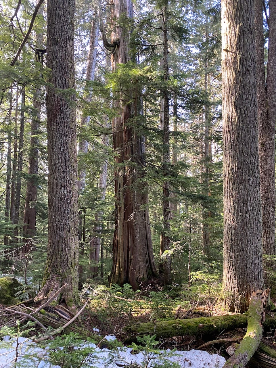 We reached the remains of the end of yet another abandoned FSR, now a minefield of deadfall. Snow made this section more treacherous and I often found myself postholing through dead wood. Around here, the snowshoes came on. Soon after this, the claustrophobic third-growth forest gave way to a much more open ancient forest with massive trees, much more pleasant to walk through.