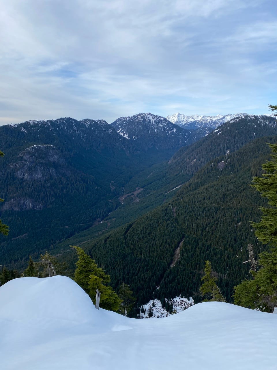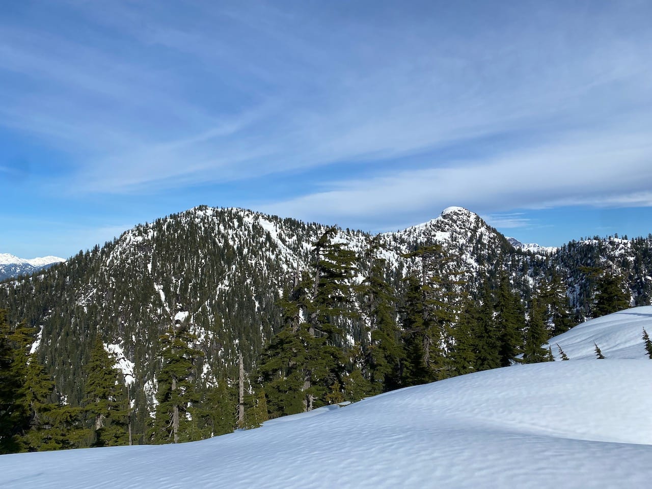 The trail emerged onto the summit of Grand Ridge, a snow-covered bluff with excellent views, especially down Indian Arm to Burnaby. We took a break here and admired the scenery. Our objective was finally in sight! We noticed that there were steeper slopes and more cliffs than we’d anticipated…