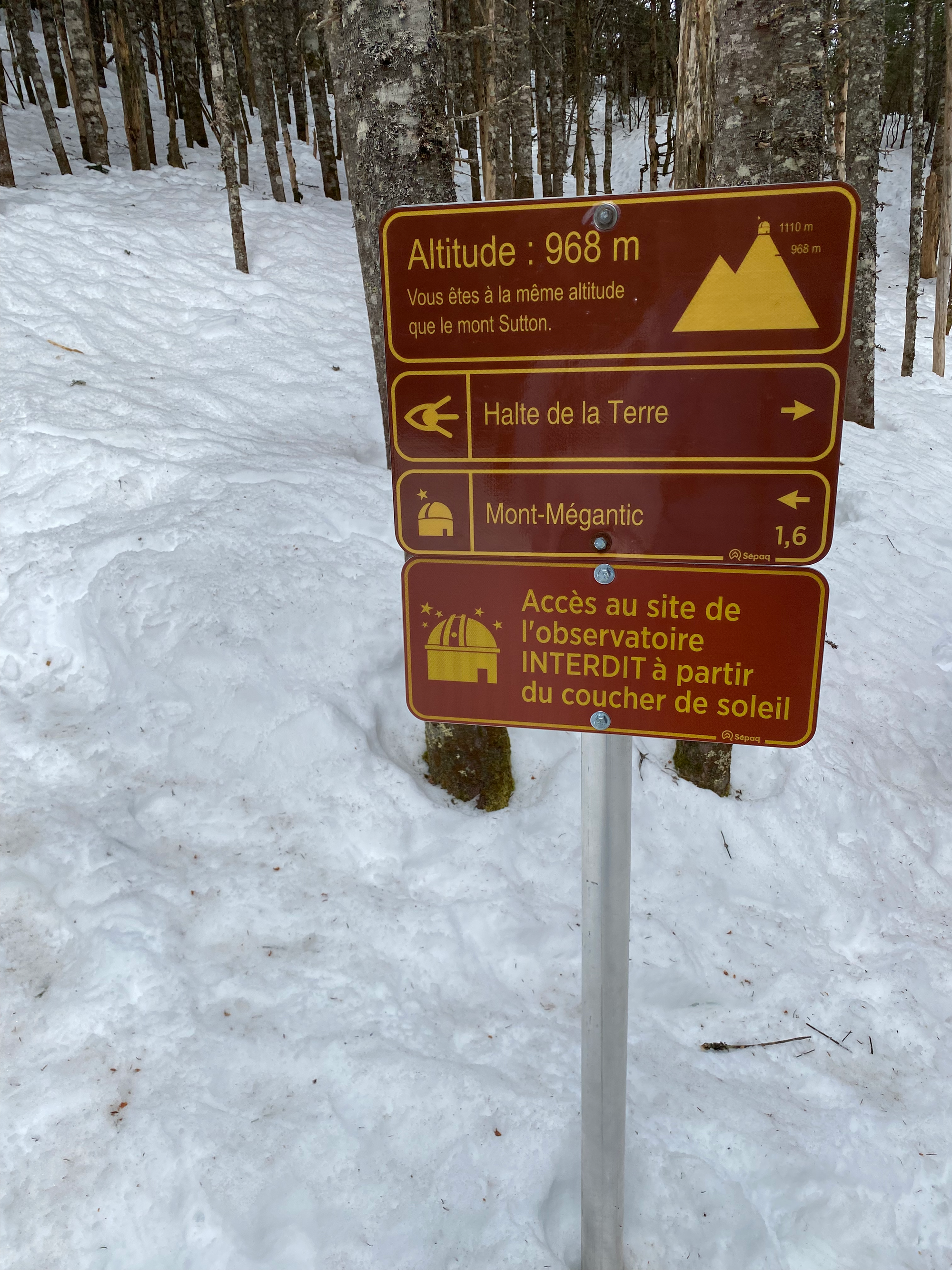 We followed the Sentier du Mont-Mégantic along a creek, then up the slope. Along the trail, signs marked the elevations of other Quebec mountains. The trail meets the road at 950m, then heads northwest through a plateau, then climbs to the summit, which is crowned with a telescope. A platform provides views to the west and north.