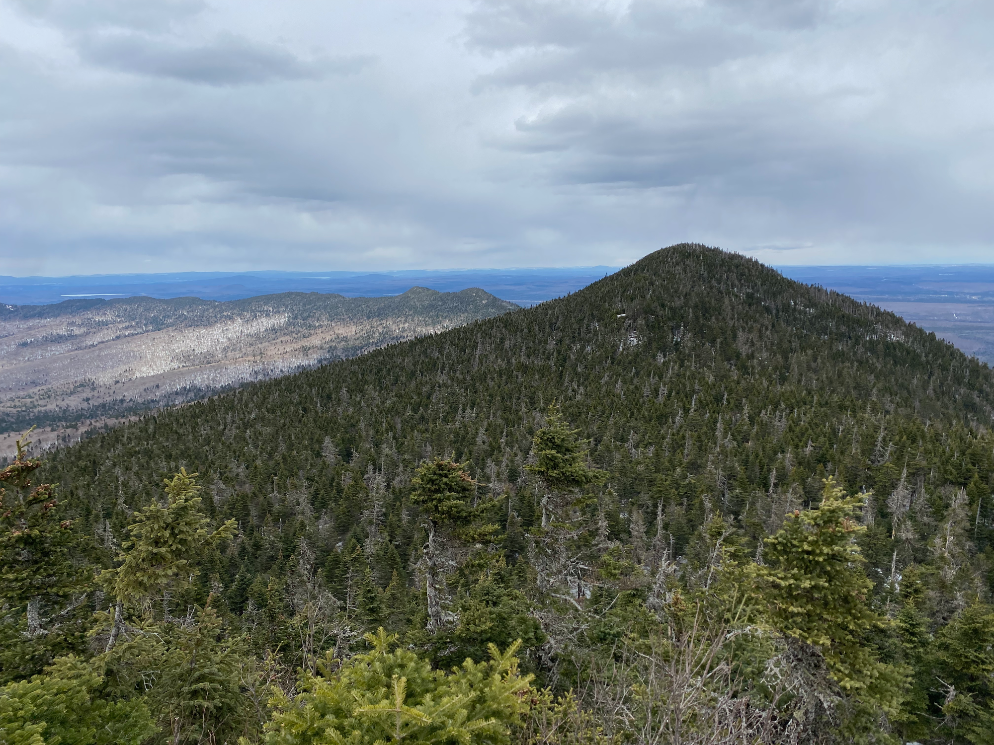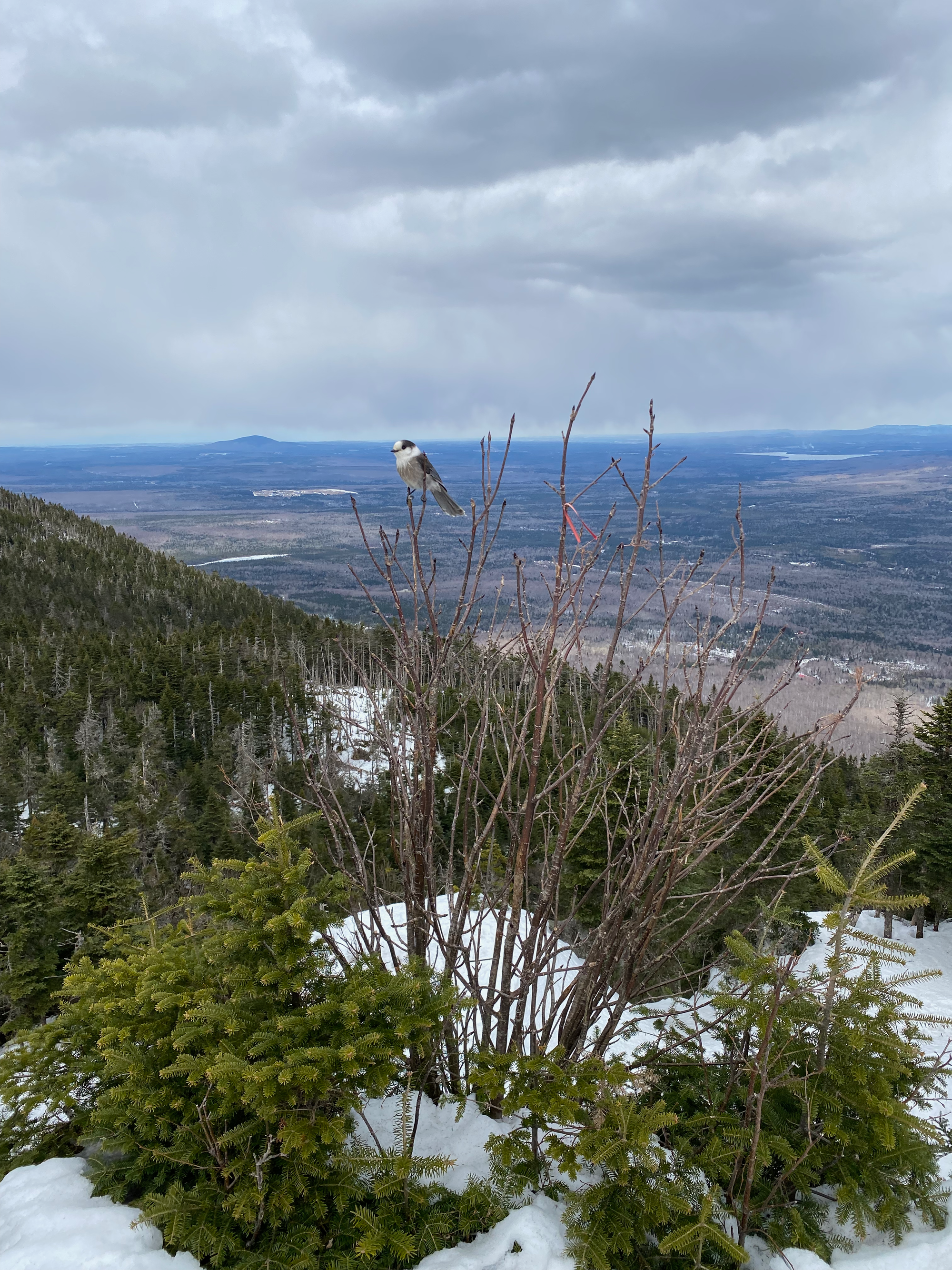 From the summit, we followed the Sentier du Col along the road, then south to another telescope, where we had lunch. After that, the trail descended the slopes of Mont-Megantic to arrive at the Col des Trois Sommets, which has one of several huts that can be stayed in. We headed east, ascending the “outer ring” of the Mont-Megantic massif. Our next stop was Pic des Crépuscules, the best view of our trip, with 180 degree views to the north, east, and west, including into Maine. As we rested, whiskeyjacks threatened to eat our lunch.