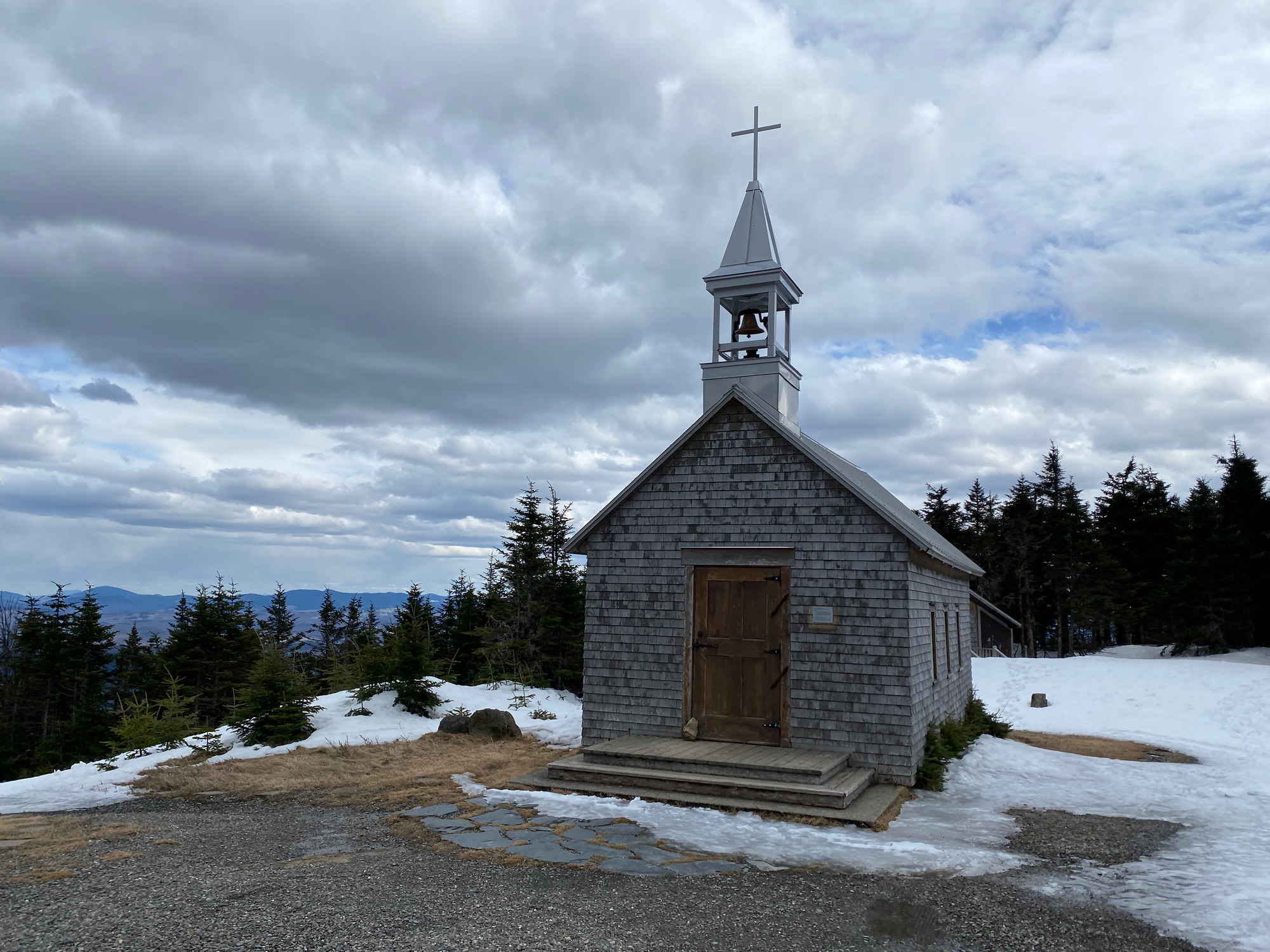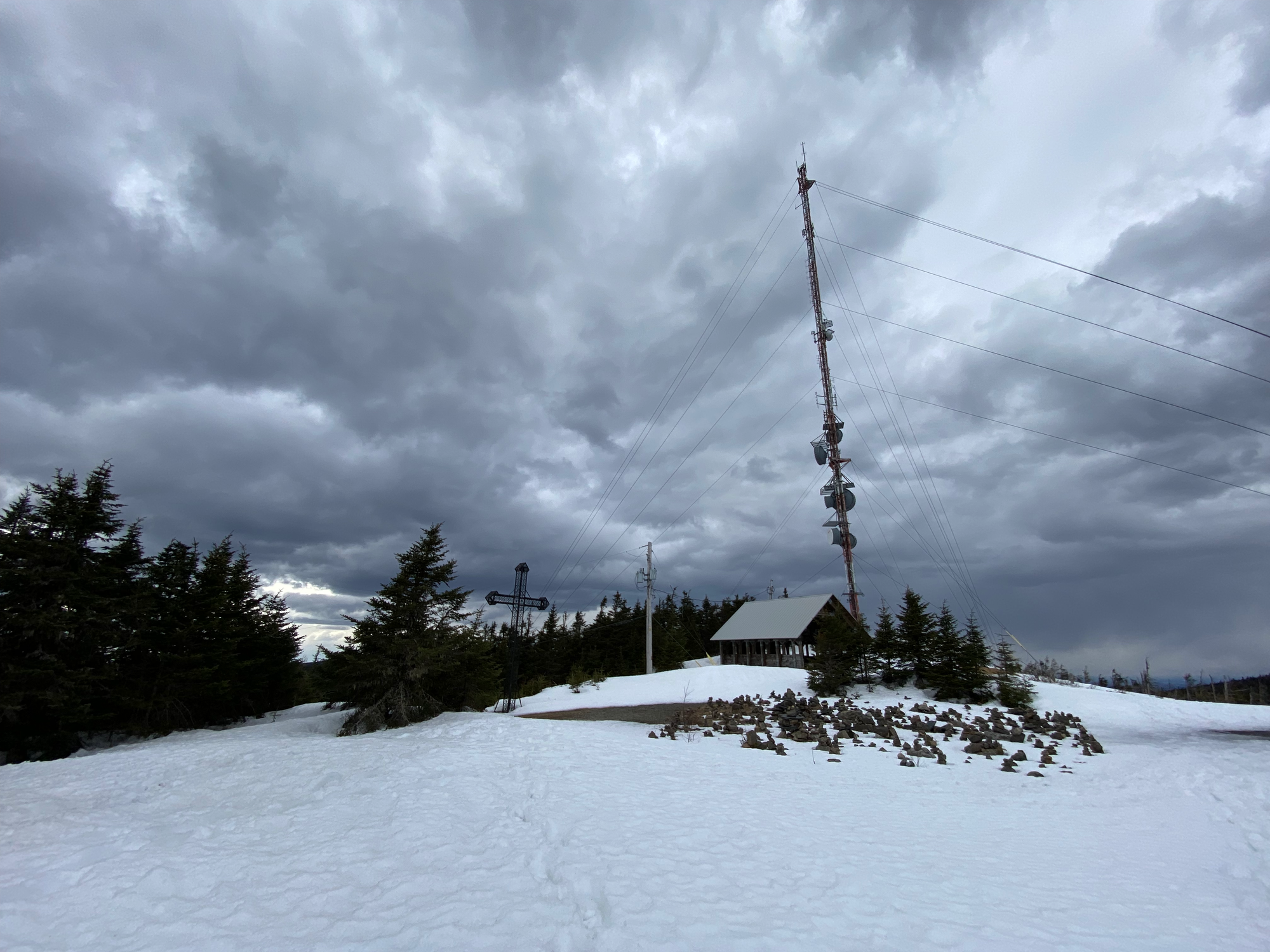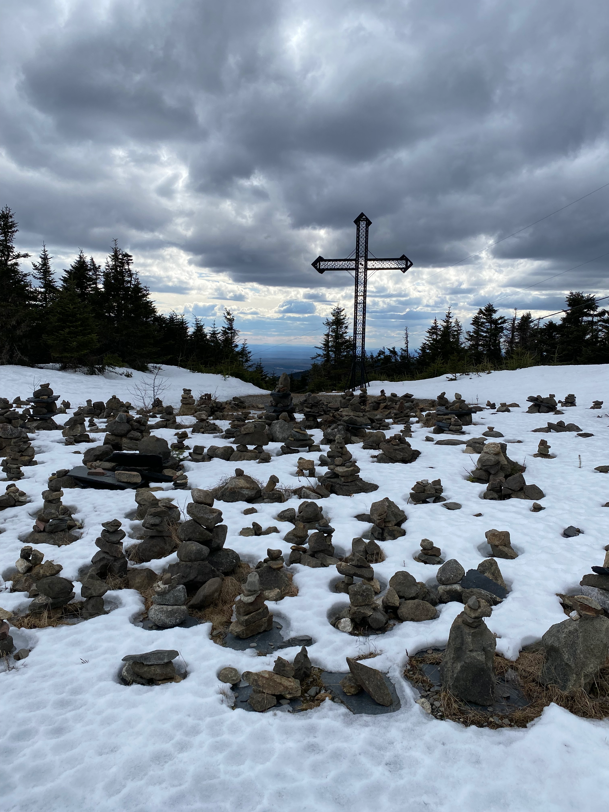 We continued south along the ridge, passing another cabin (Refuge Saint-Joseph) and stopping at Mont Saint-Joseph. This mountain has a cross and chapel dating to 1878 and 1880, respectively, as well as a statue of Jesus and a rock garden. It’s a common pilgrimage site on Sundays in the summer. There is also a tall antenna, which somewhat interferes with the effect.