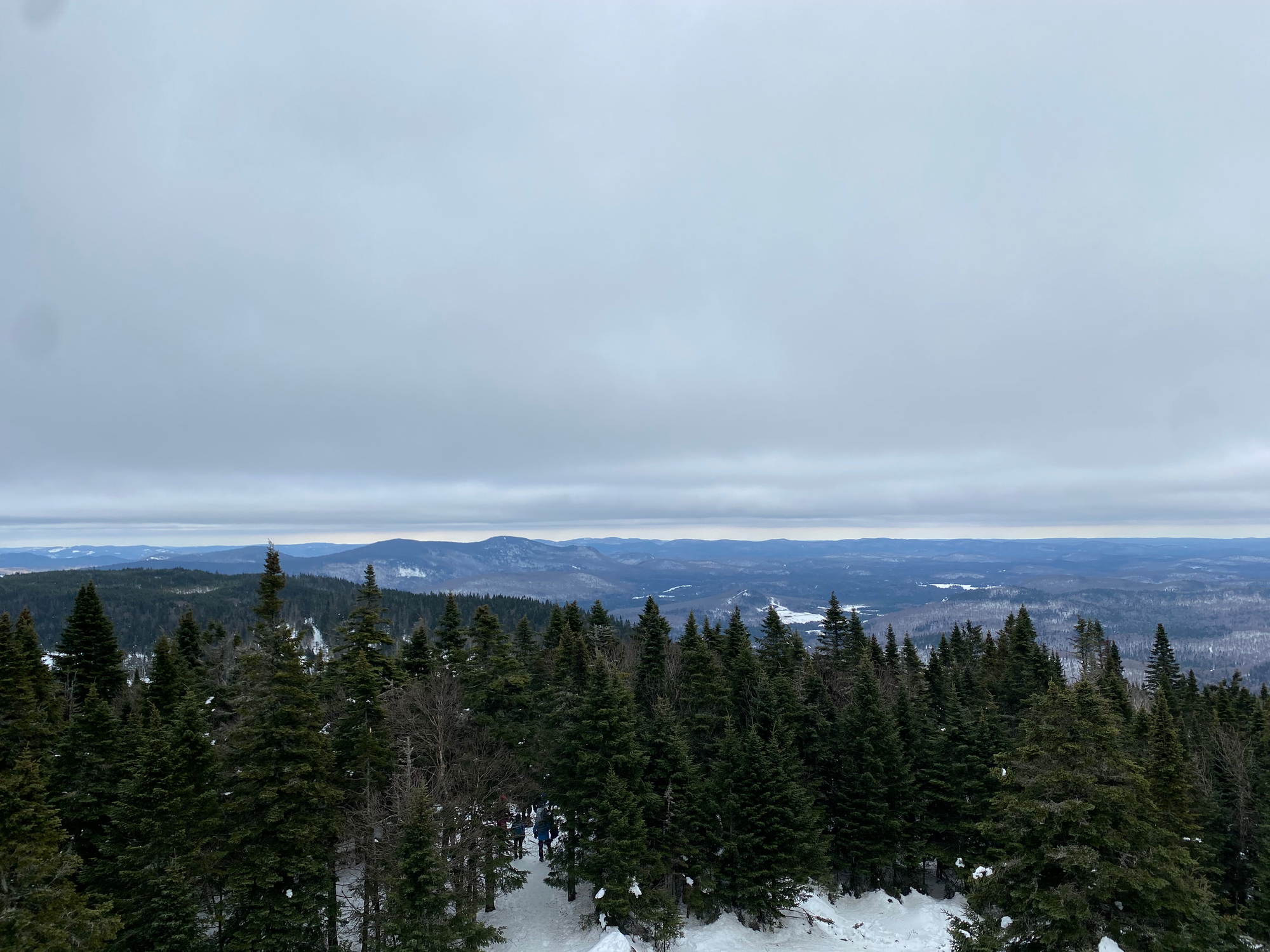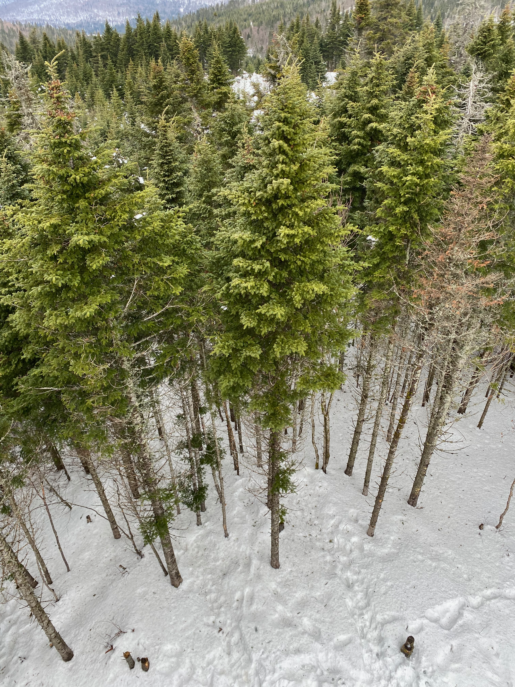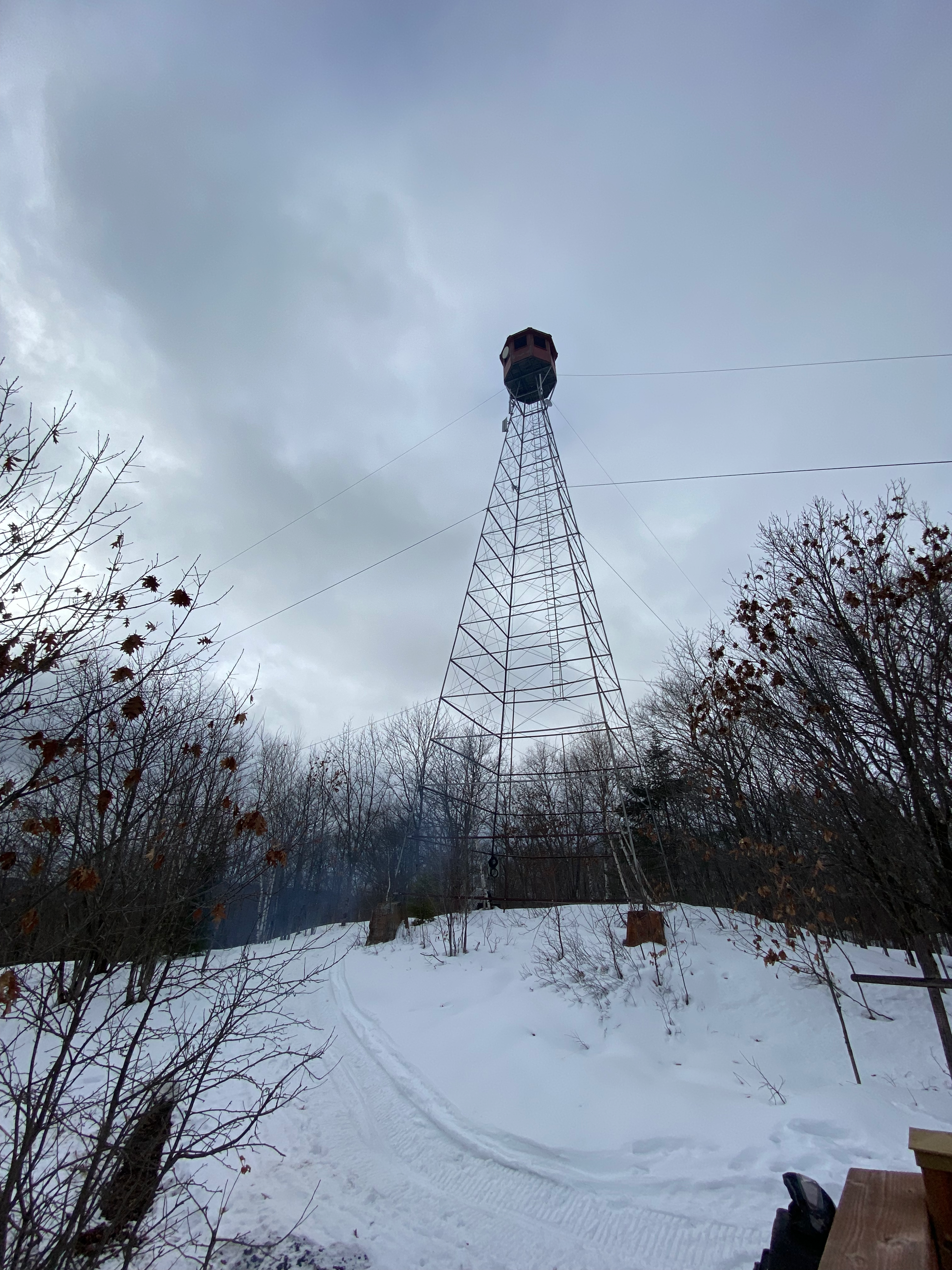 We wanted a shorter hike for the next day and I spotted Montagne de la Tour on Peakbagger. The short trail (1.5km one way) crossed a creek then switchbacked up a steep slope which was slippery in places. The trail ends at a sketchy-looking decommissioned fire tower. The base of the ladder has been removed so it can’t be climbed. There is also a platform with nice views to the east and south. This is a popular snowmobiling spot and a few snowmobilers were also there.