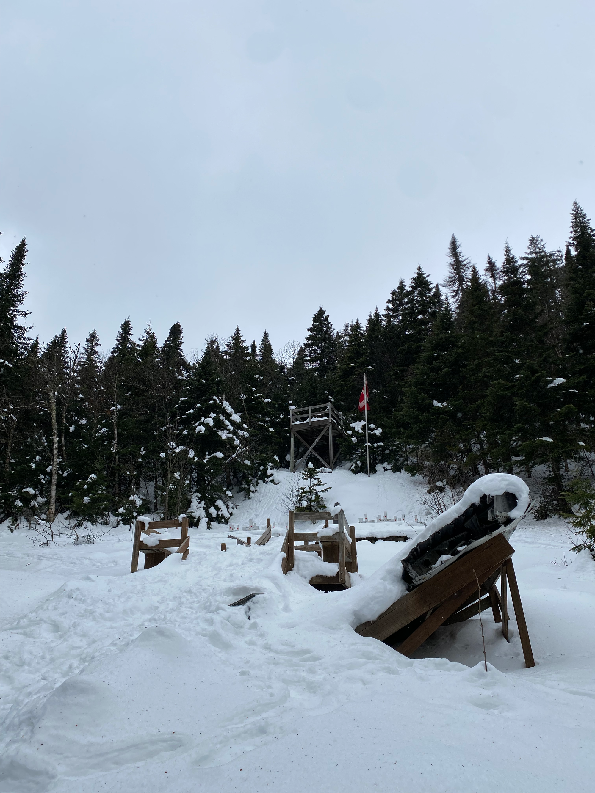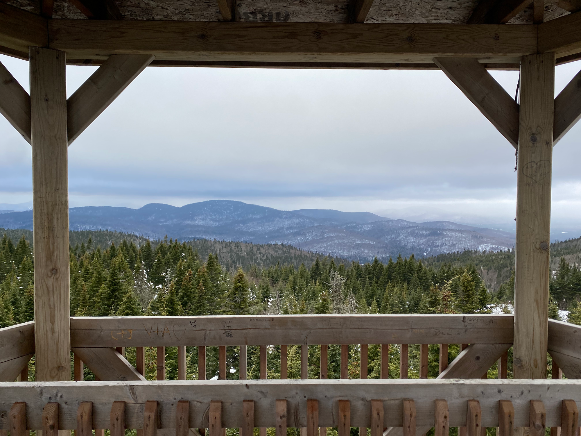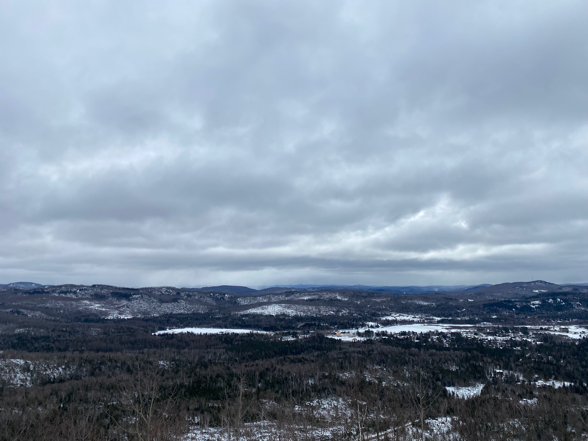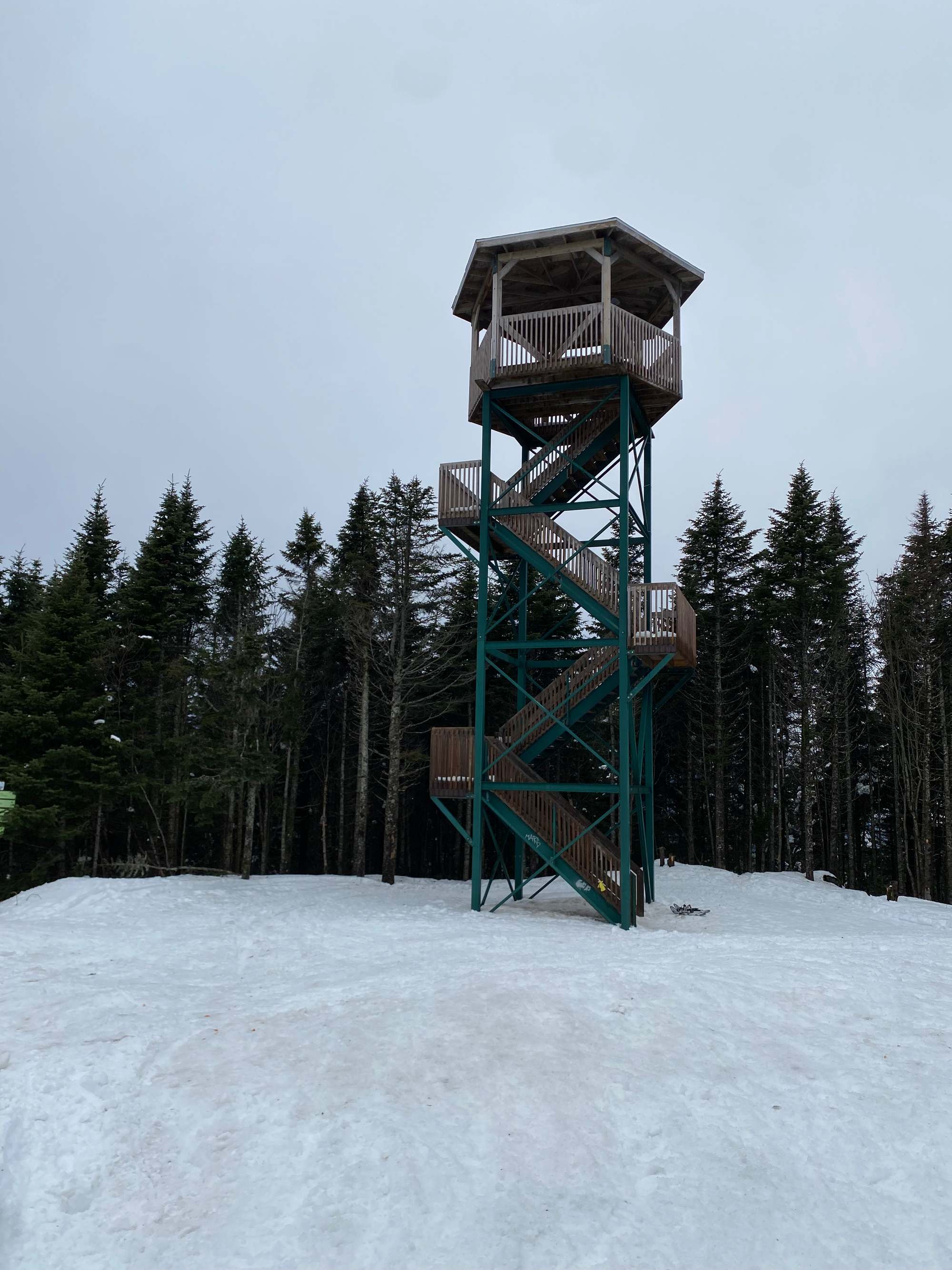 We wanted a shorter hike for the next day and I spotted Montagne de la Tour on Peakbagger. The short trail (1.5km one way) crossed a creek then switchbacked up a steep slope which was slippery in places. The trail ends at a sketchy-looking decommissioned fire tower. The base of the ladder has been removed so it can’t be climbed. There is also a platform with nice views to the east and south. This is a popular snowmobiling spot and a few snowmobilers were also there.