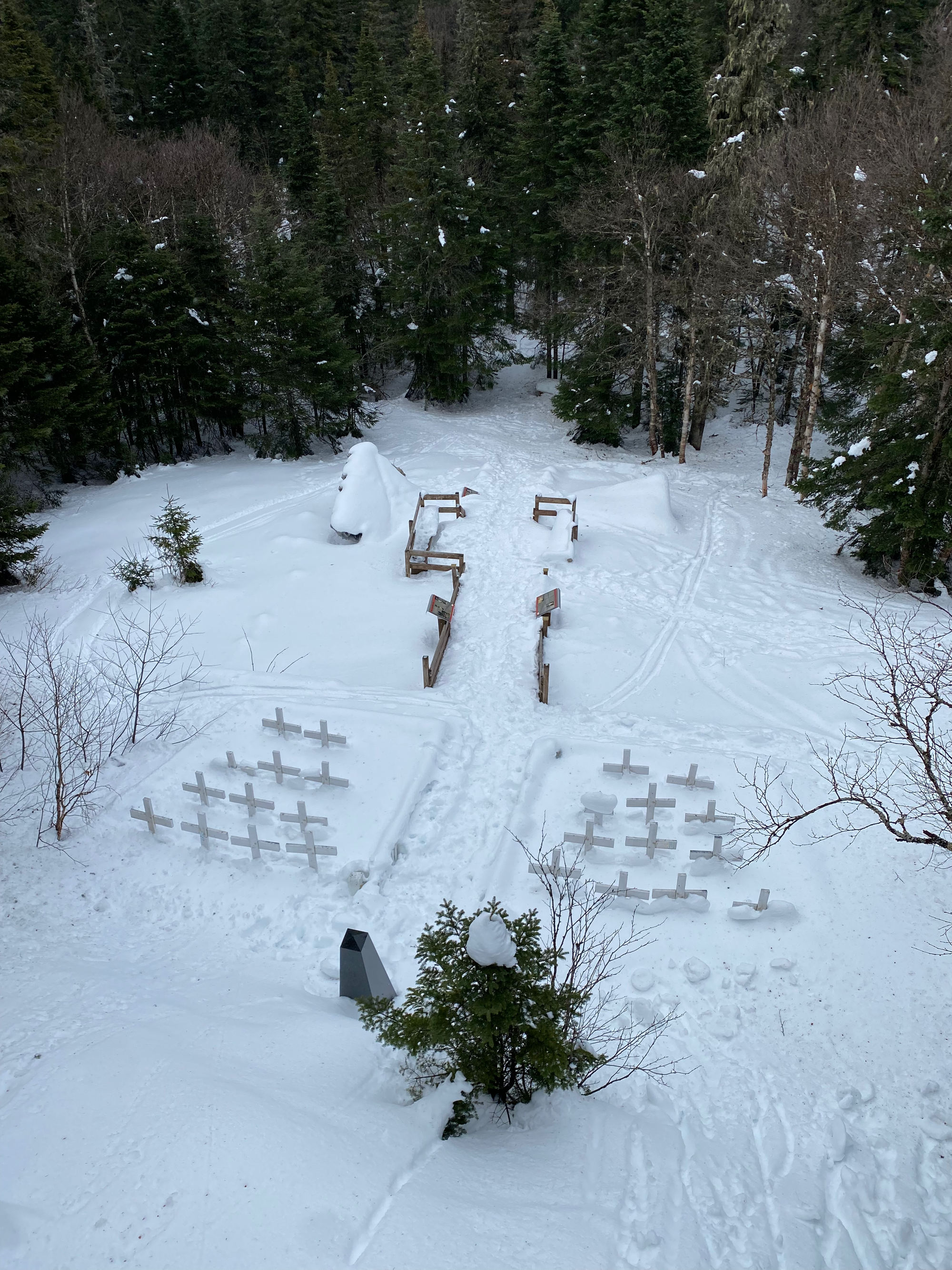 We took the long way back, taking the Inter centre trail to the plane crash site. Enough snow had melted for the grave markers and some of the plane to be visible.