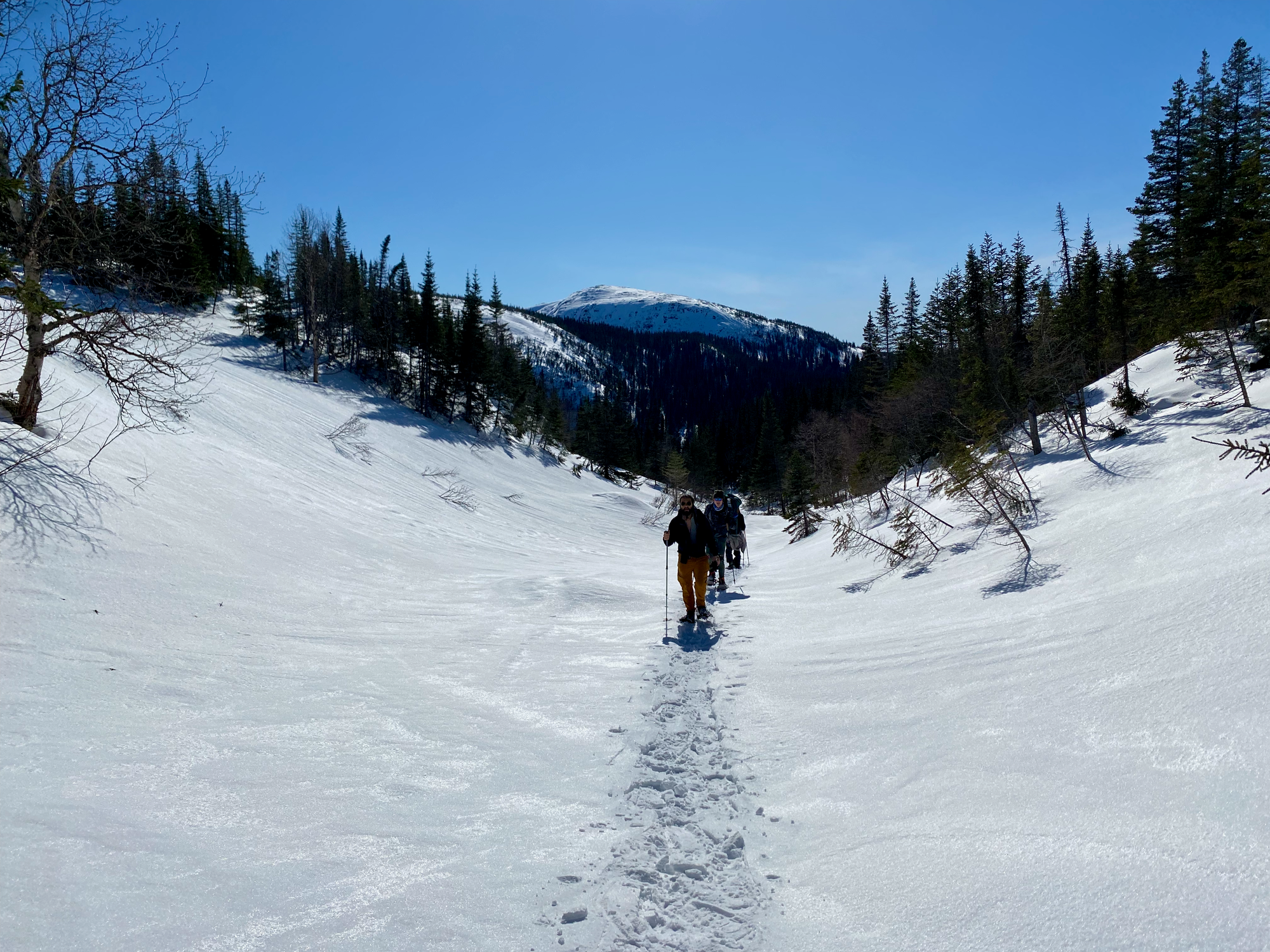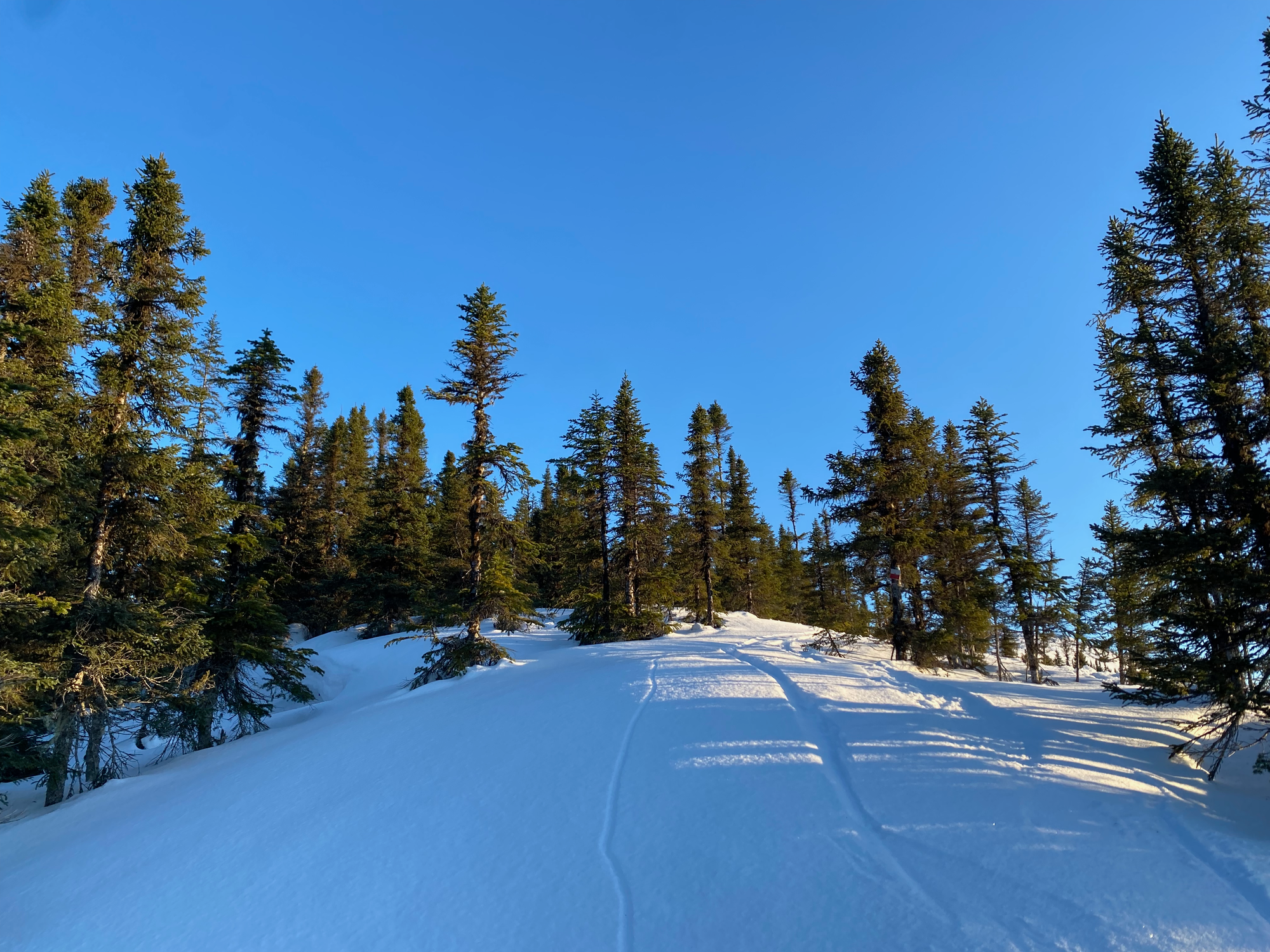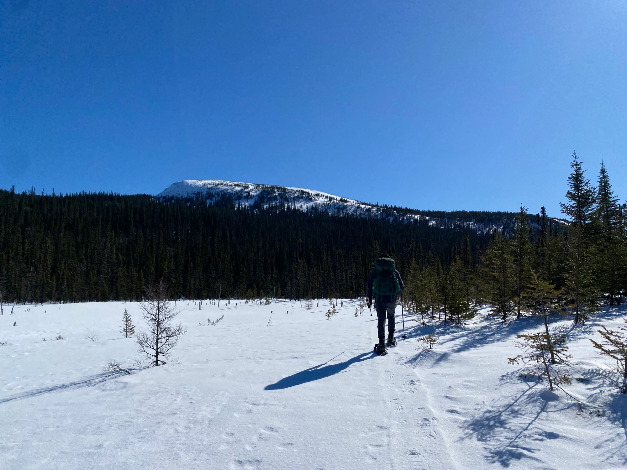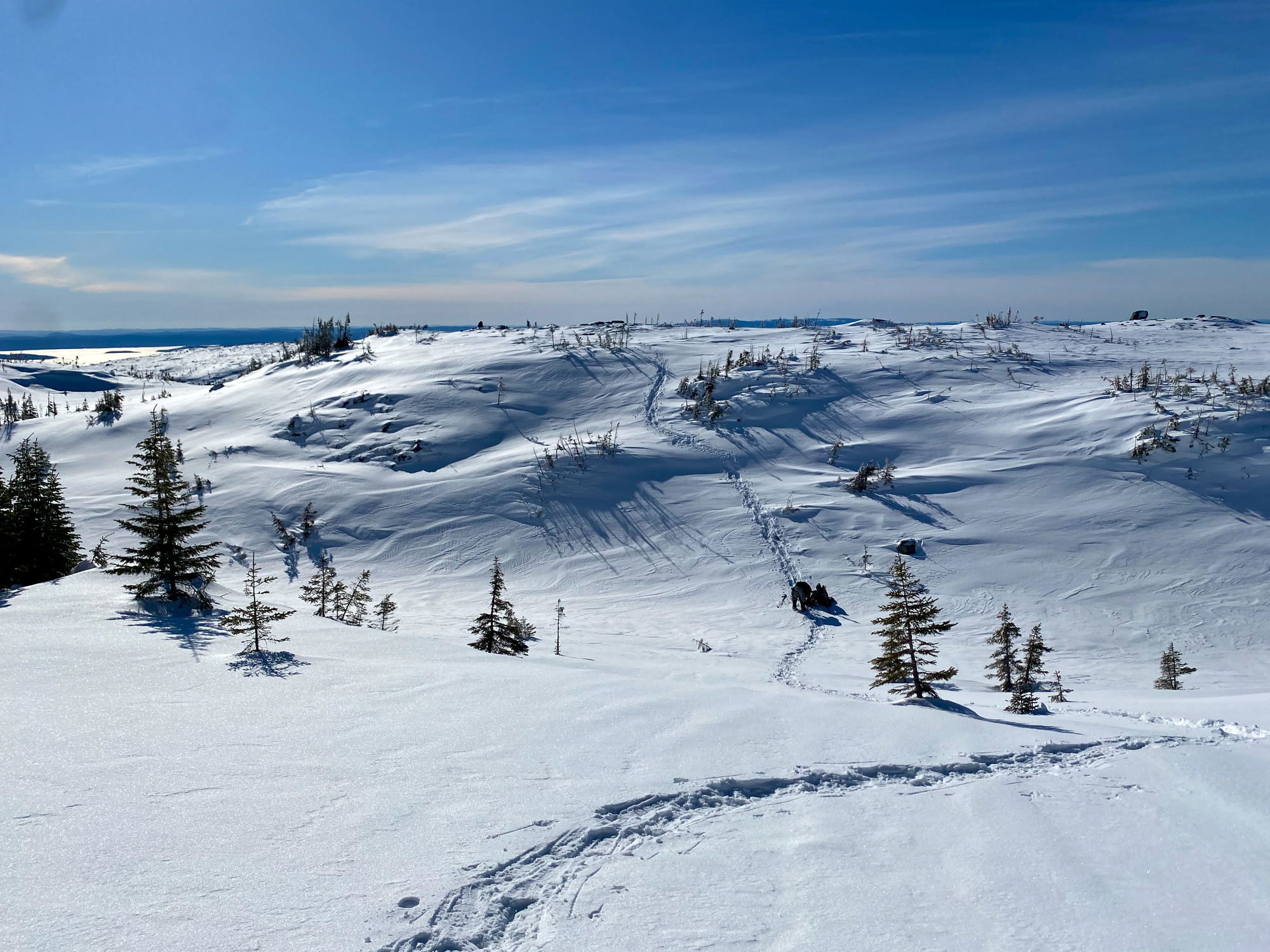 The trail curves southwest. Our paper map was showing a connector trail between the winter and summer routes, but it’s not shown on most online routes, so we weren’t sure if it would be broken out (the ‘official’ winter route continues up the creek and ends up nowhere near the summit). At a flat area that would probably be marshy in the summer, we spent some time looking for routes up, but the connector trail turned out to be broken, making things much easier. After a short steep slog, we rejoined the summer route at Lac du Castor, and walked east through a gully.