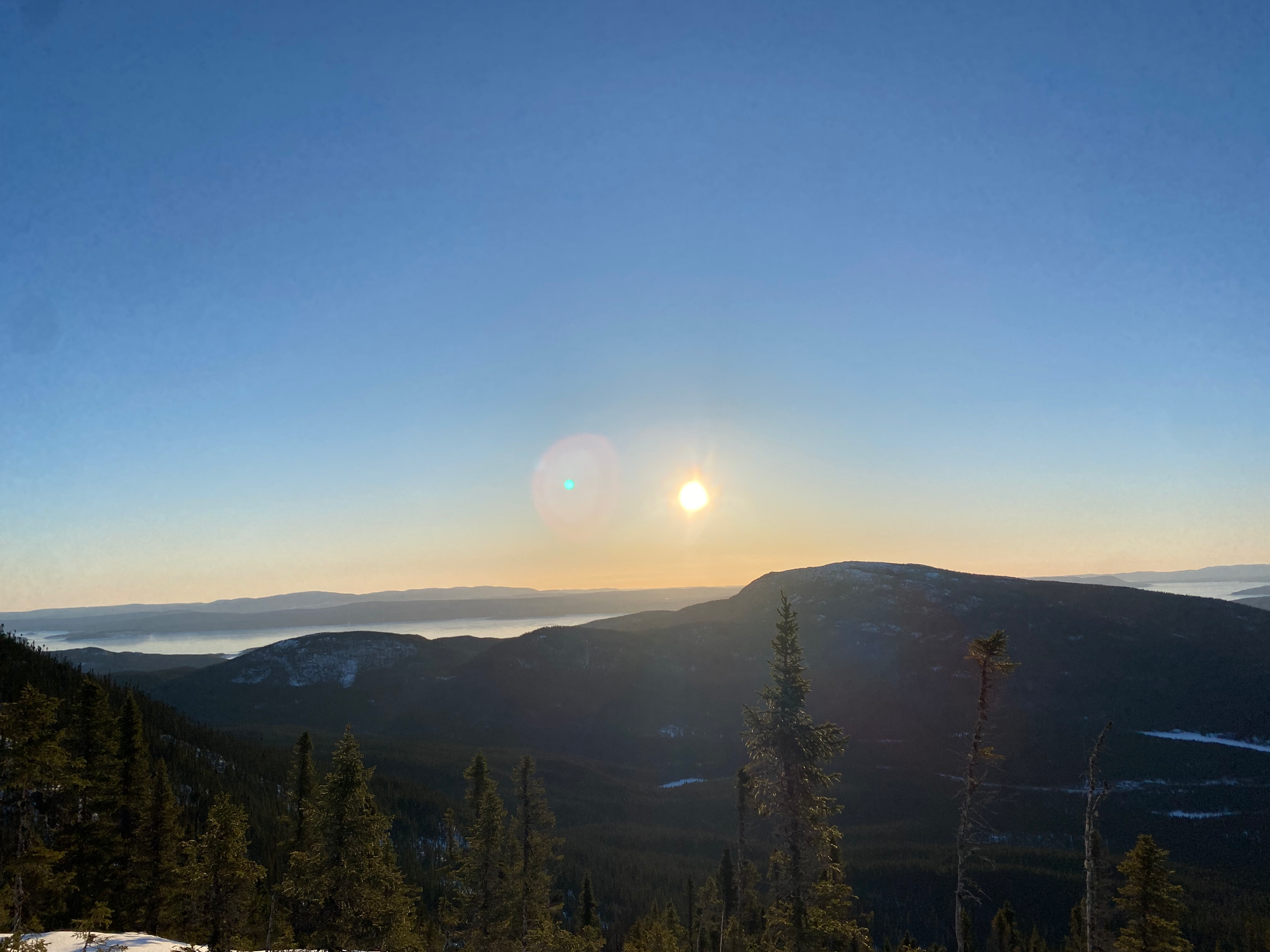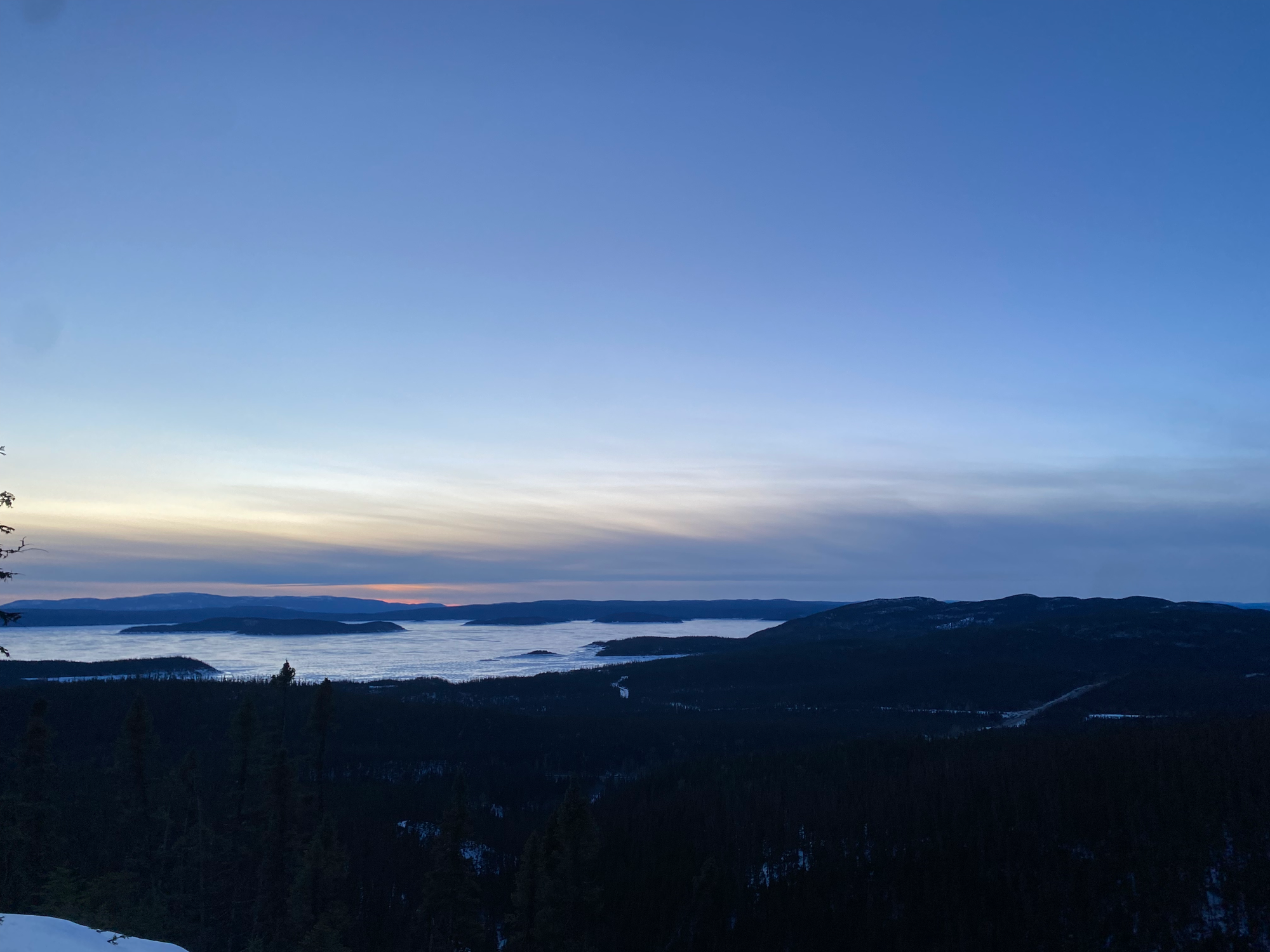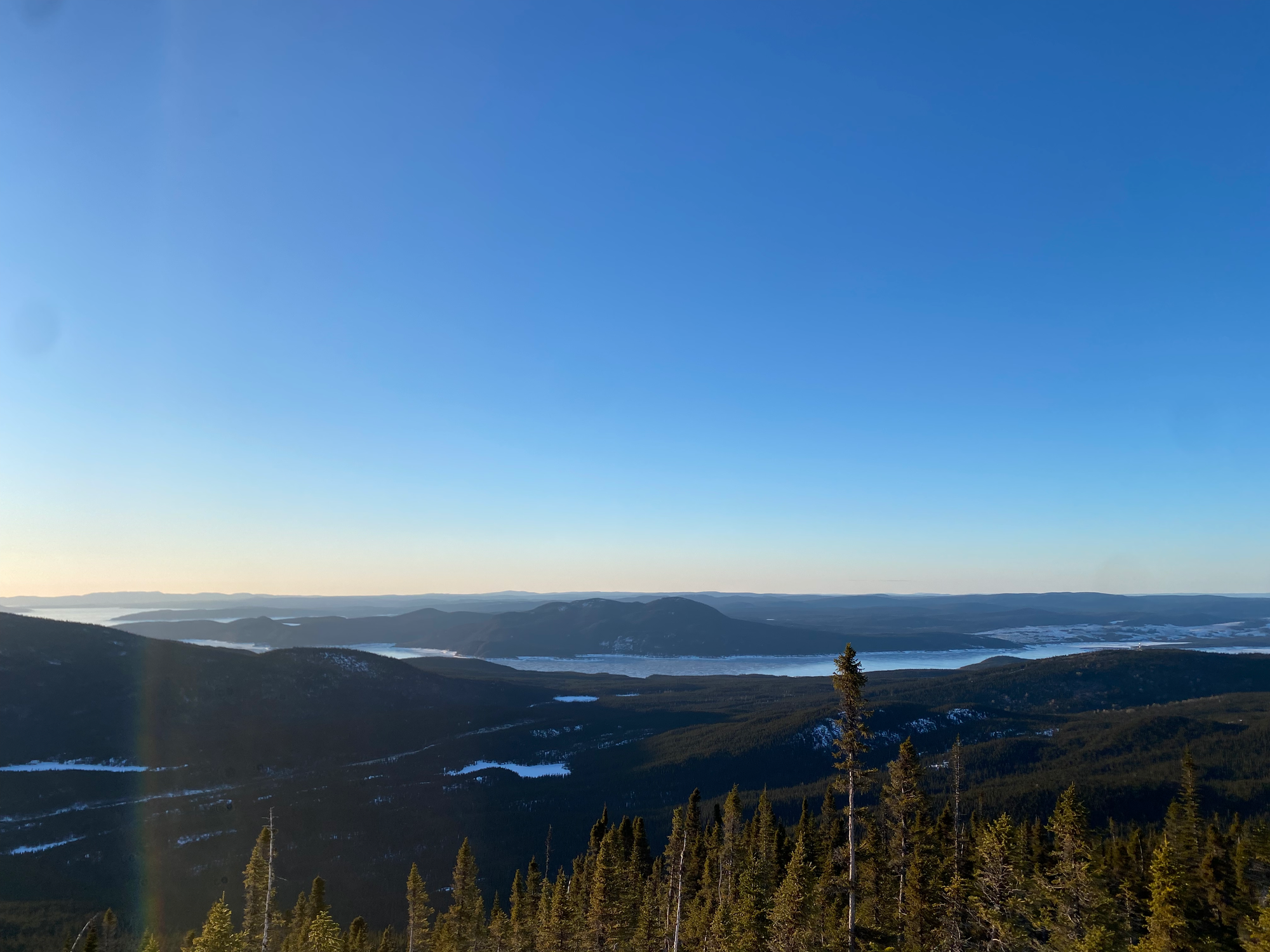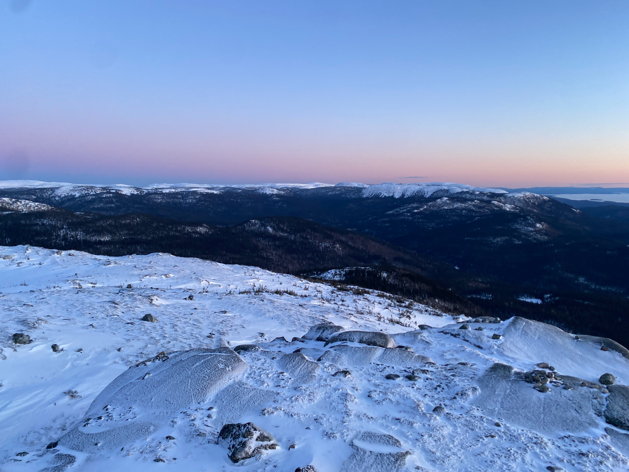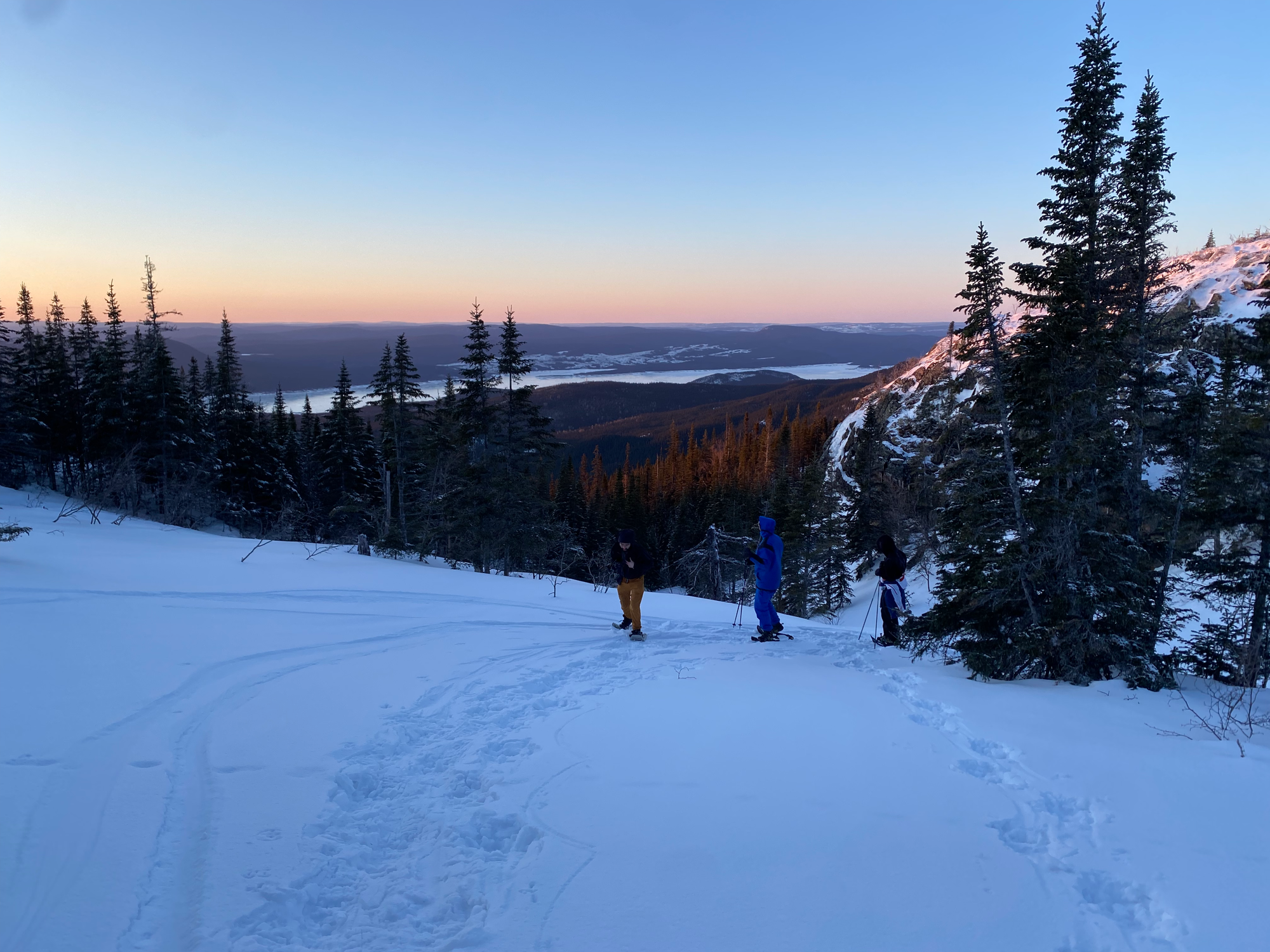 We climbed up the edge of the hollow to a plateau, which we traversed to the gully we’d hiked on the way up. As we left the plateau, we encountered tracks left by some skiers who’d done the full traverse a couple days earlier, making things easier. Once we reached the gully, the descent was fast and uneventful. R. was in danger of catching frostbite for the second time on this trip, so we switched spikes and snowshoes and I rediscovered the joys of constant postholing. At Lac du Castor, we headed down the summer trail, descending a ridge and pausing at a viewpoint where we watched the sunset. The trail was extremely well marked and we’re very grateful to the volunteers who built it.