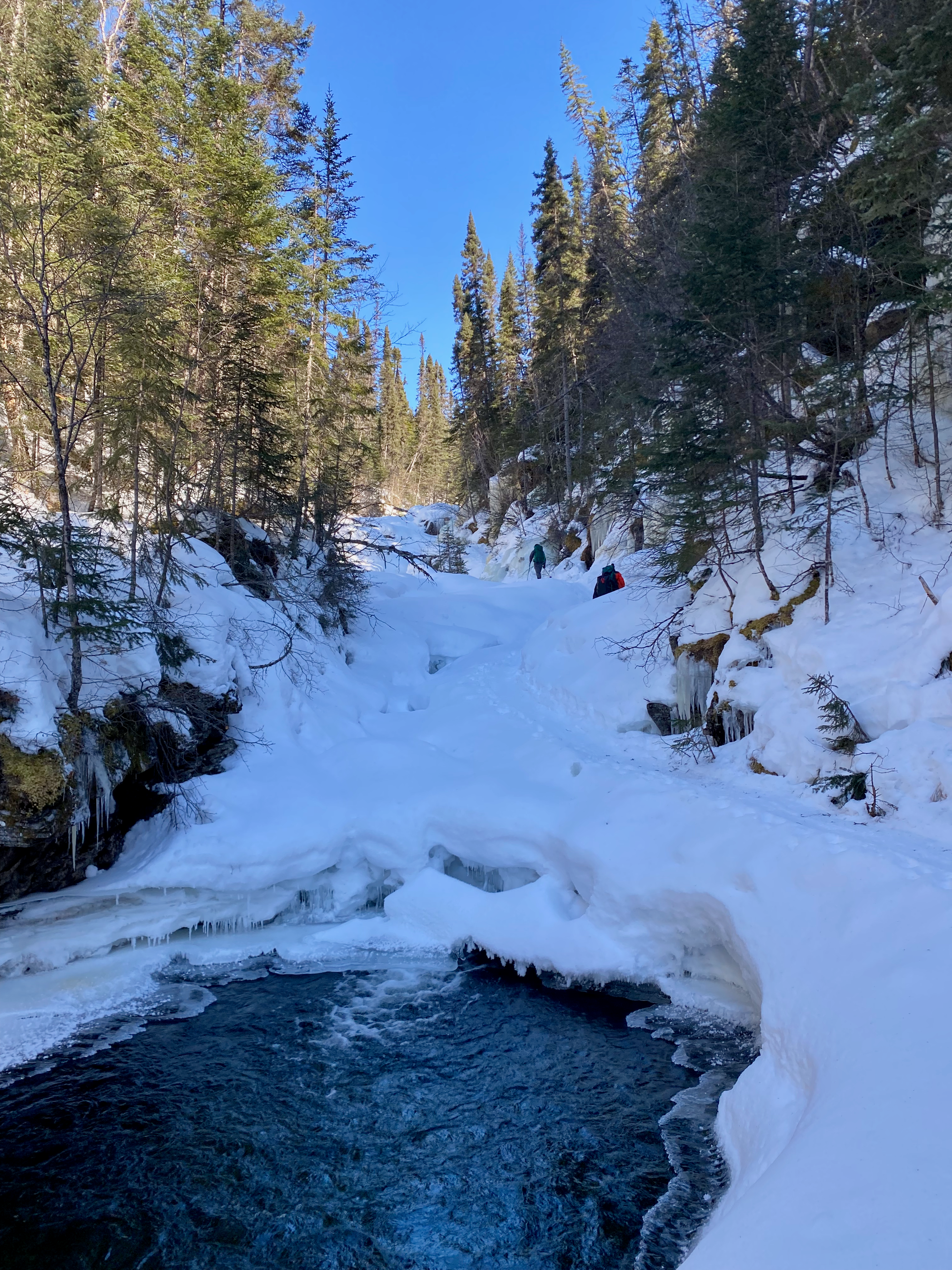 The Provencher trailhead is a parking lot on the side of the highway about 1km south of the Station Uapishka turnoff. There are two main trails: a winter route that follows the Ruisseau Provencher through a canyon, and a summer route that climbs up a ridge and bypasses the canyon. Confusingly, two trails head east from the Provencher parking lot, but the summer trail is not one of them. We took the northern trail, which leads to a campsite and wasn’t broken out past that, turned around, and took another trail marked as “Cul-de-sac” which was actually the winter trail. (The summer trail is accessed by heading south along the highway, crossing the creek. It’s very well-marked from there).