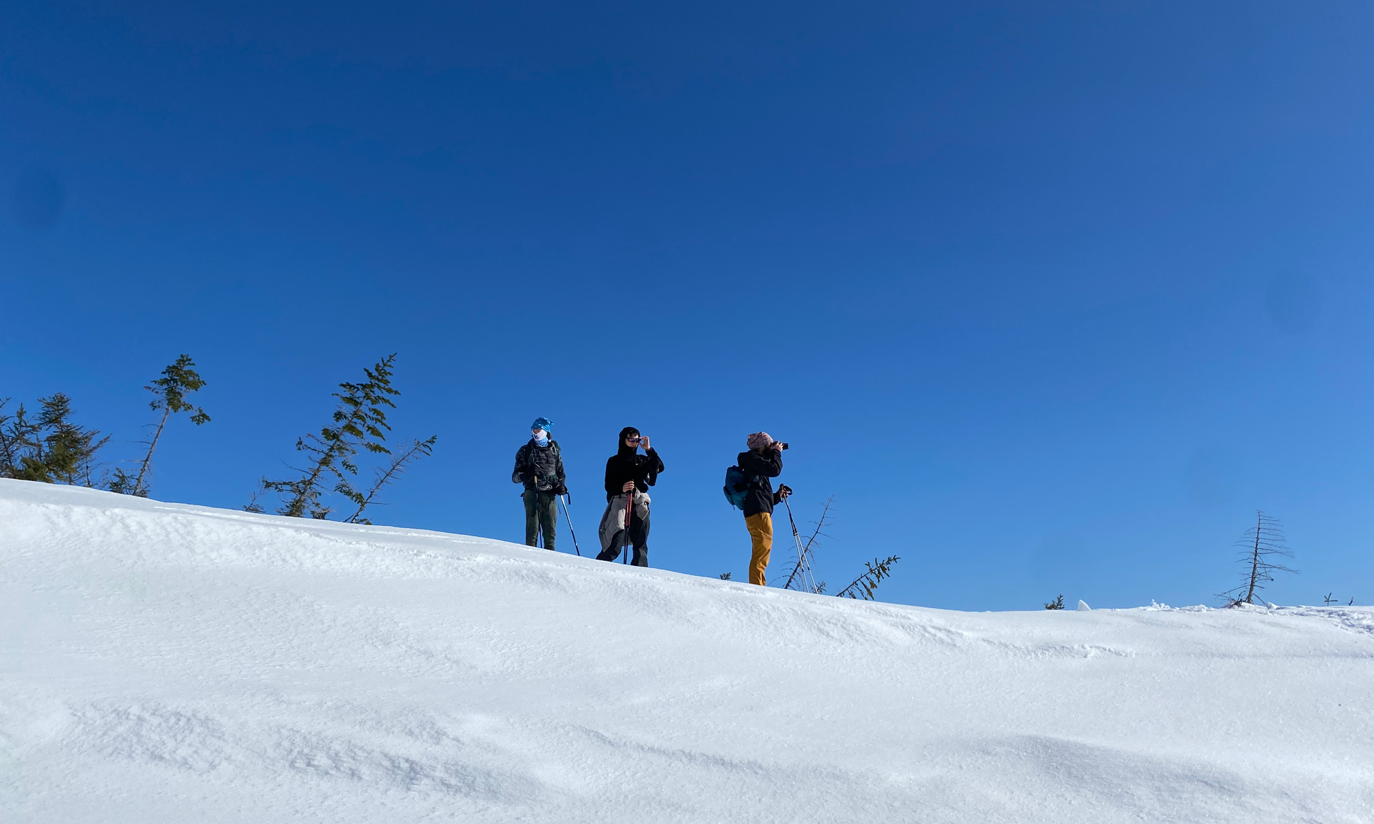 As the easterners in the group discovered the joys of being above treeline, a problem became apparent. Someone had forgotten sunglasses and was in danger of going snow-blind. The solution: musical sunglasses. One person would wear a buff over their eyes and be led around by others. Once their eyes started hurting, we’d give them someone else’s sunglasses, pass the buff around, and repeat.