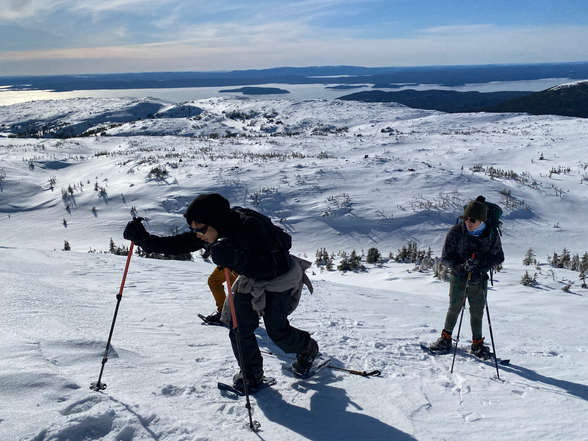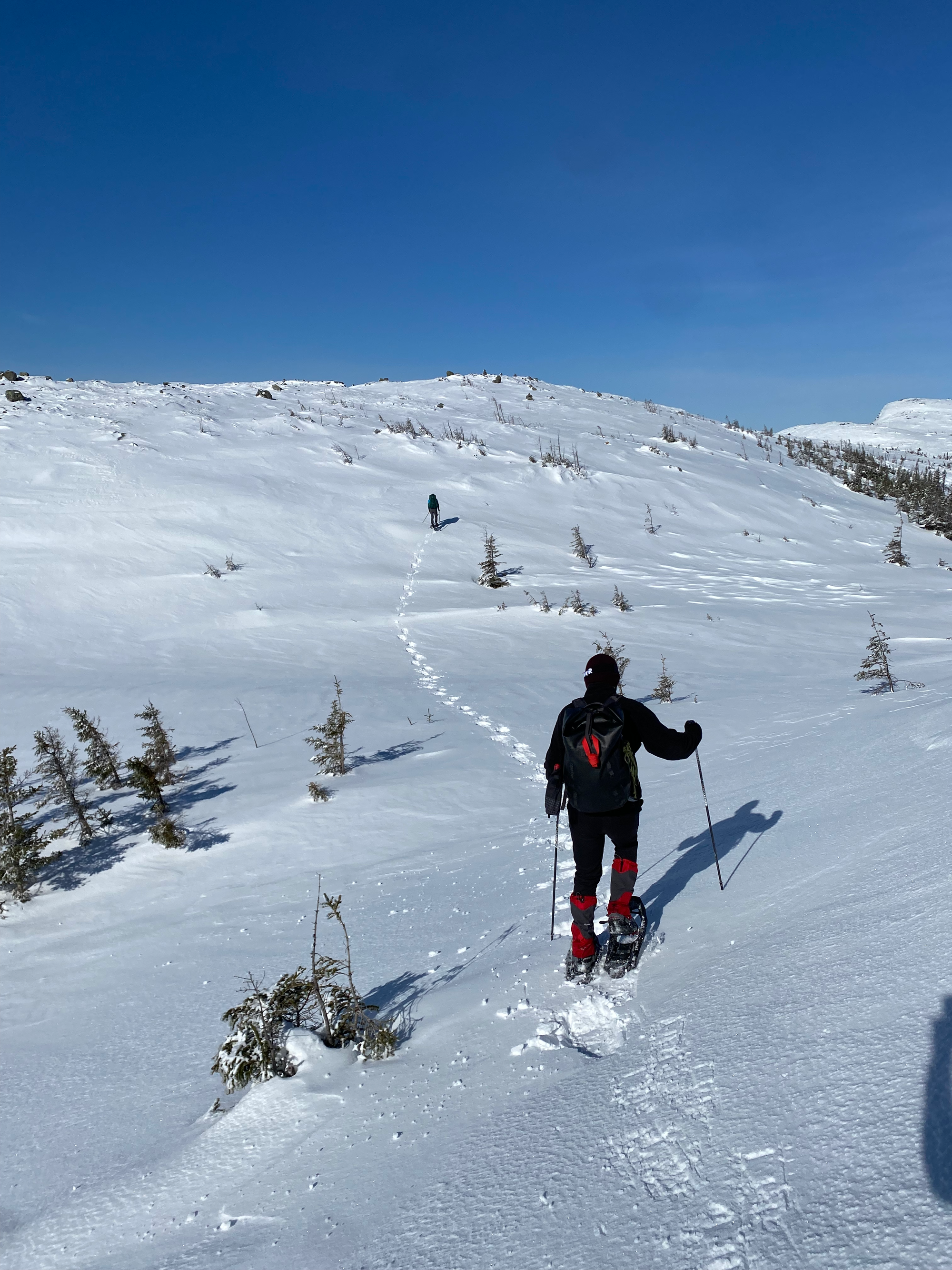 We decided to quickly ascend Mont Harfang in the afternoon, then do a longer hike to Mont Provencher with some of the hitchhikers the next day. To avoid walking along the road, we did an out-and-back from the northern Harfang trailhead. We all strapped our snowshoes on, except for one group member who wanted to bring his new crampons, which he would end up regretting!
