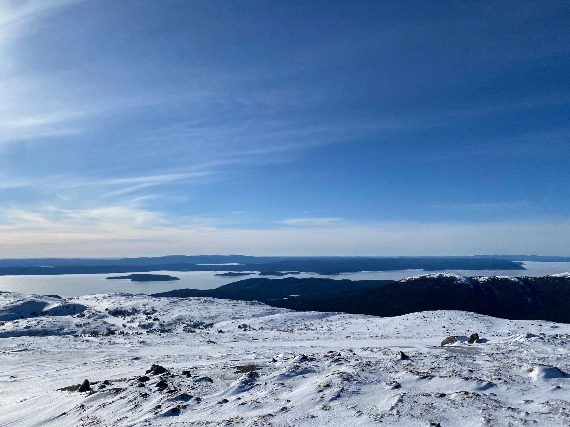 A note to peakbaggers: all maps and guides say that the north summit (accessed by the cairned route) is the highpoint of Mont Provencher, but a note on Peakbagger.com says that one group’s GPS suggested that the south summit was slightly higher. They looked about the same to me, but there is a cairn on the south summit. Google Maps also shows “Sommet du Mont Provencher” at a random spot on the ridge to the SW, and “Mont Provencher” at a point slightly below the north summit, while Gaia shows “Massif Provencher” at another random spot on the bench to the NW of the north summit. It’s clear that either the north summit or the south summit is the highpoint.