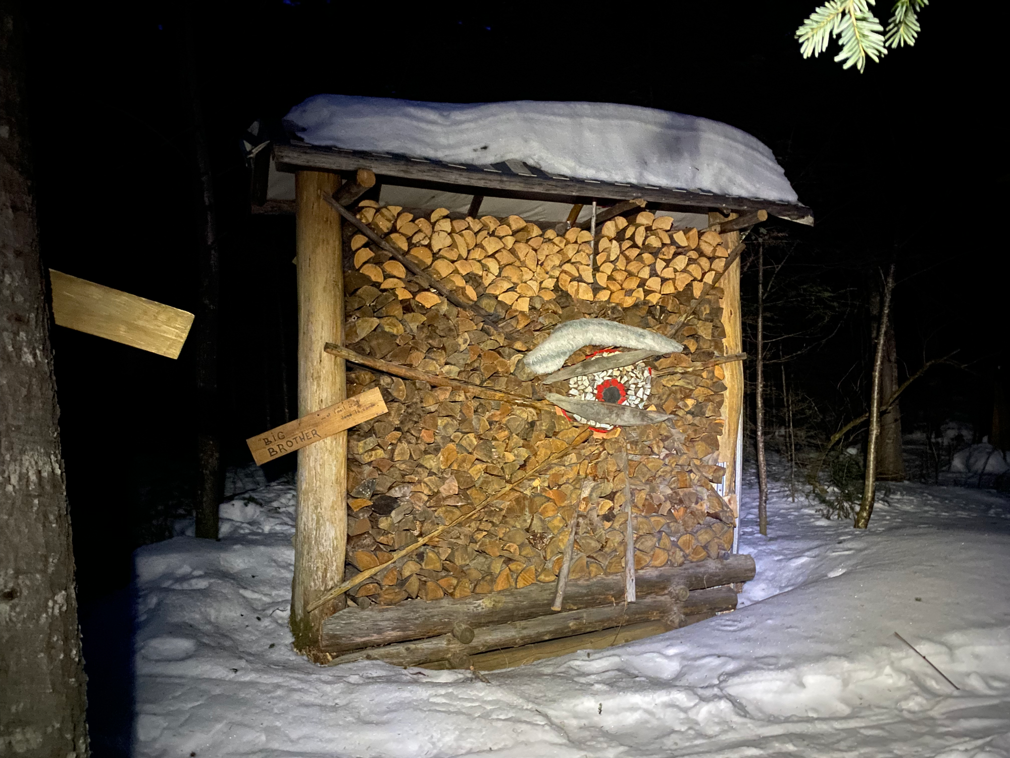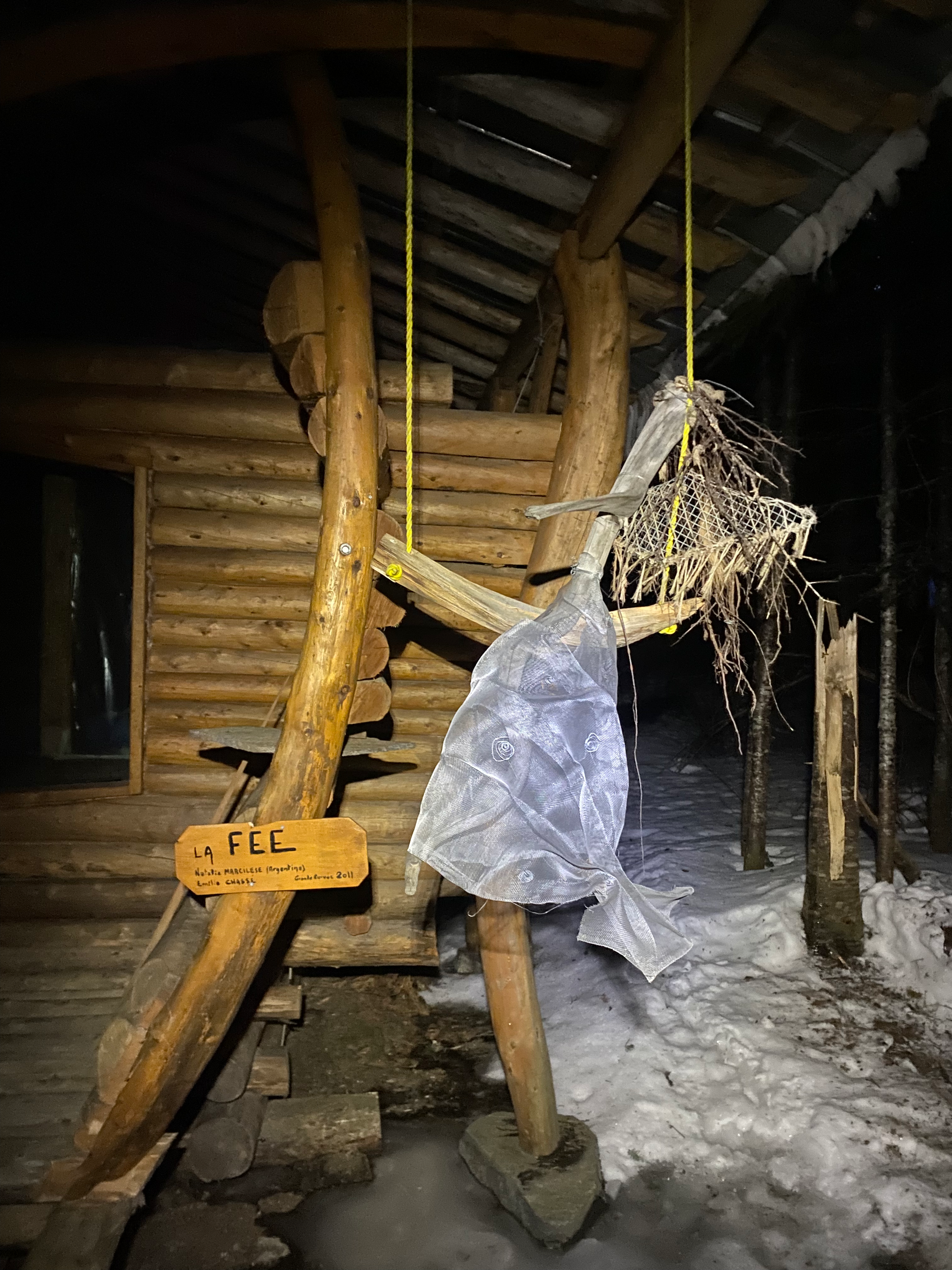 Near the trailhead, we passed some whimsical art installations at Camp Nomade, accidentally startling someone living there. After admiring the art we soon emerged at the trailhead, running into W. and C. who had hiked some of the winter trail after we left. Back to the station.