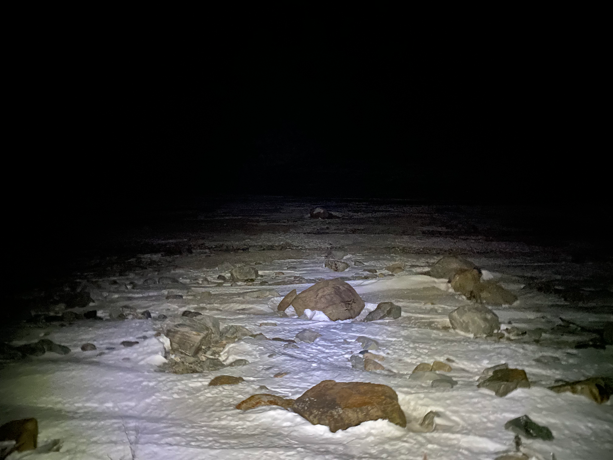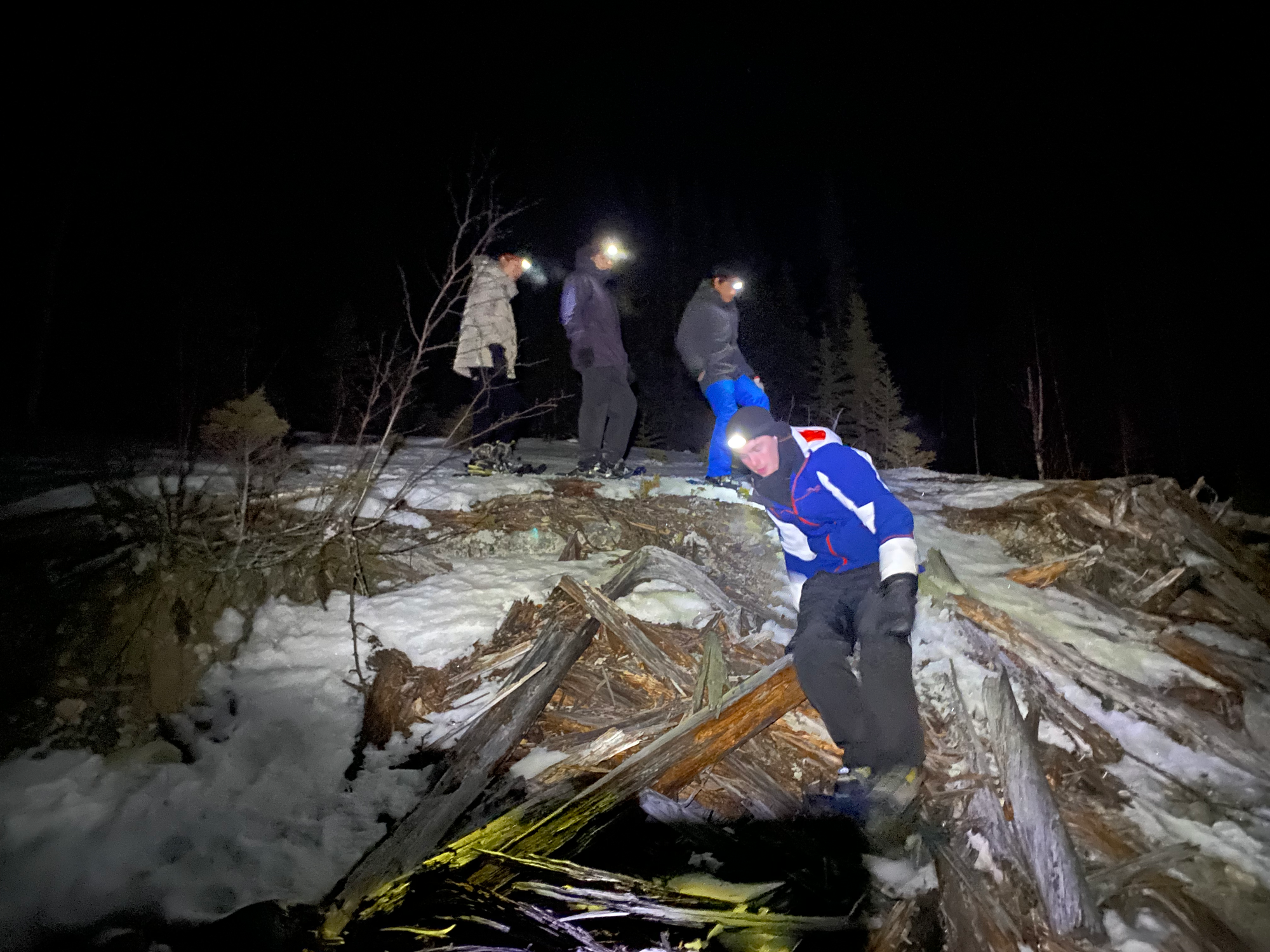 To wrap up our time at Station Uapishka, a few of us explored the lake. There was no defined trail, so we walked into the forest behind our cabin, chose a promising route, and dropped 200m to the lakeshore. Five minutes later we were below the tree line, looking out on a rocky and icy moonscape. The water had been lowered recently, and massive slabs of ice sloped to the new water level. Every few minutes we heard loud booming sounds as ice cracked in the distance. We ventured onto the lake, admired the stars, took a few group photos, then headed back up to safety and the warm fire.