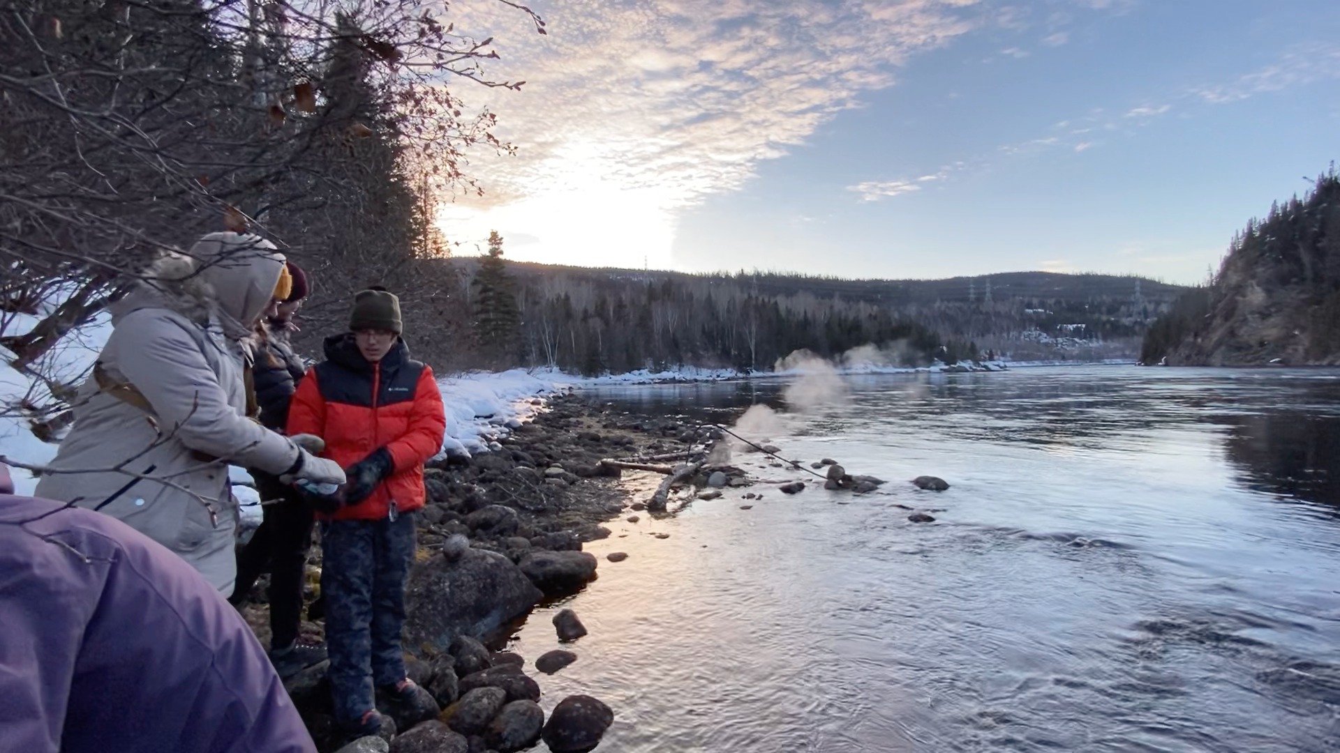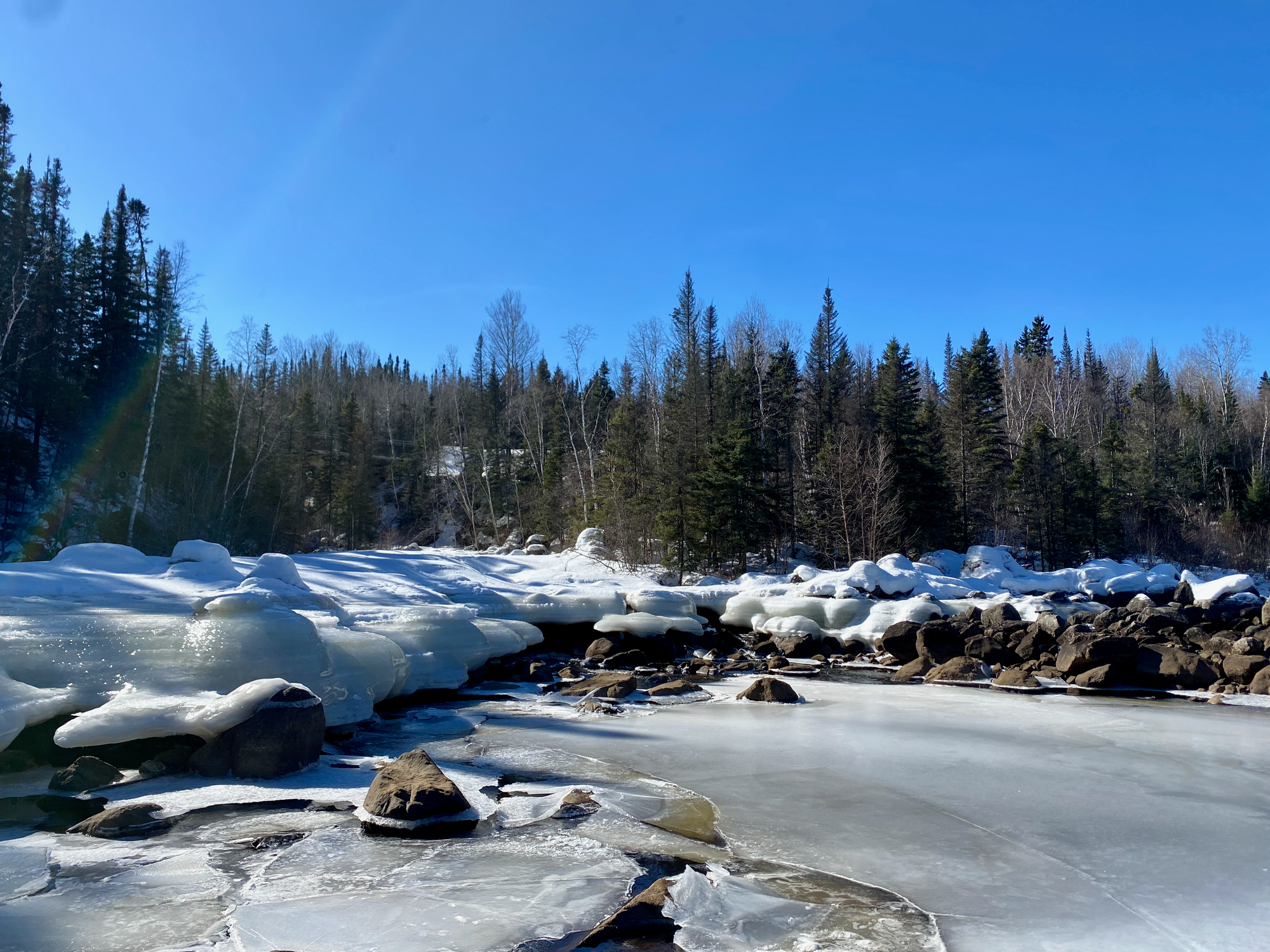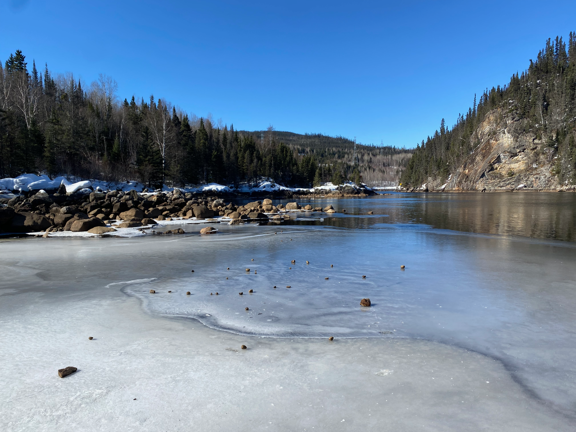 Another day at Manic-5. Today’s weather was pretty much perfect (sunny, just below 0 degrees) and we had a great time hanging out at our campsite. We built another campfire, toasted some bagels, skipped rocks on the ice, and explored the mouth of the Anita River. J. and R. tried to use a sharp rock to cut down a dead tree for a bench, and actually got pretty far. I was unaware of this when I walked up to the tree next to them, effortlessly breaking a few branches for firewood. I got some angry looks.