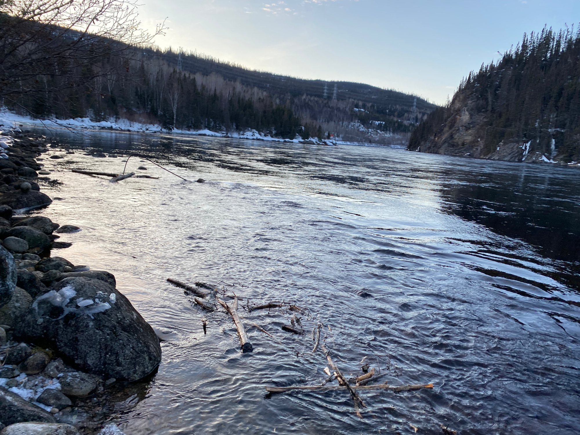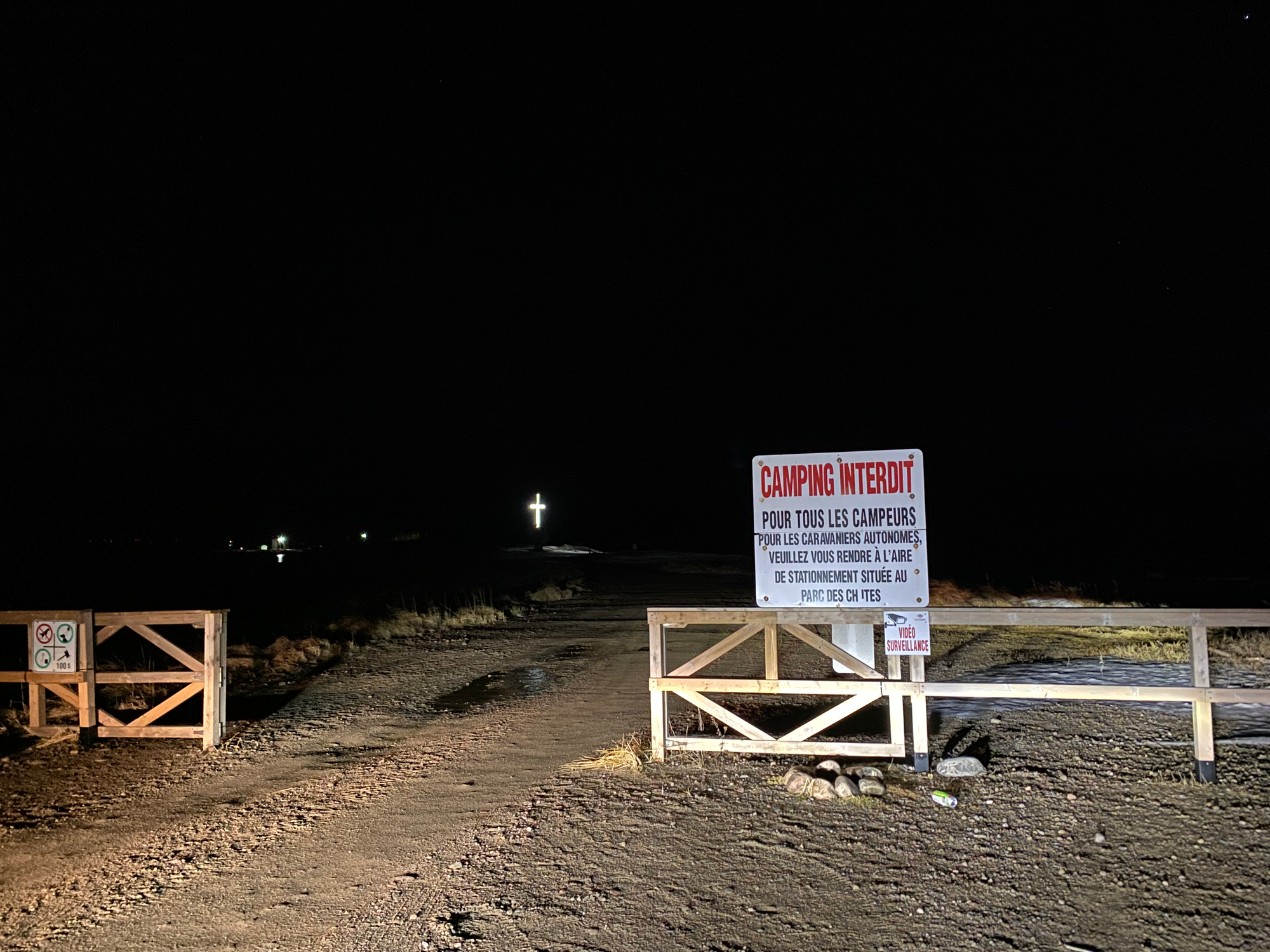 Around sunset, we headed east along the Fjord du Saguenay, arriving at our planned campsite near Tadoussac. It turned out not to be suitable for camping, and the Tesla’s alarm was unintentionally activated, alerting the neighbours, who did not approve. We quickly got out of town. Even this far north, there weren’t many good winter camping sites, stealth or otherwise; all forest service roads were gated or iced over, and all official campsites were closed for the season. Along we went up the coast, stopping at other potential campsites like the beach near Les Escoumins, but camping was clearly not allowed anywhere.