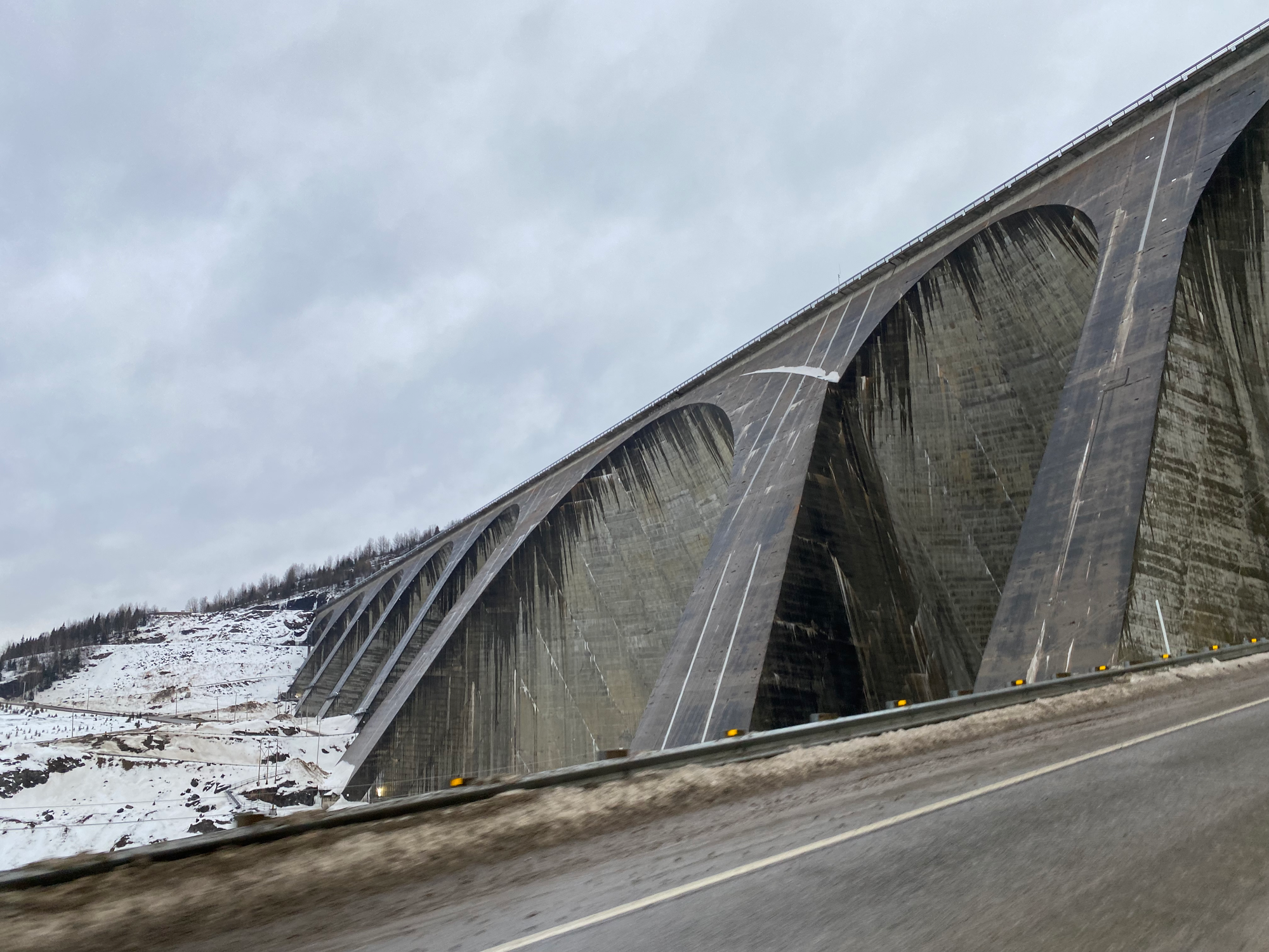 We passed several hydroelectric dams, which provide a large percentage of Quebec’s electricity: Manic-1, Manic-2, Manic-3, and Manic-5 (there is no Manic-4). Each dam was separated by vast expanses of boreal forest. Around 12:30, we arrived at the awe-inspiring Manic-5 dam, the largest multiple-arch buttress dam in the world. It was striking to see such a massive wall somewhere this remote.