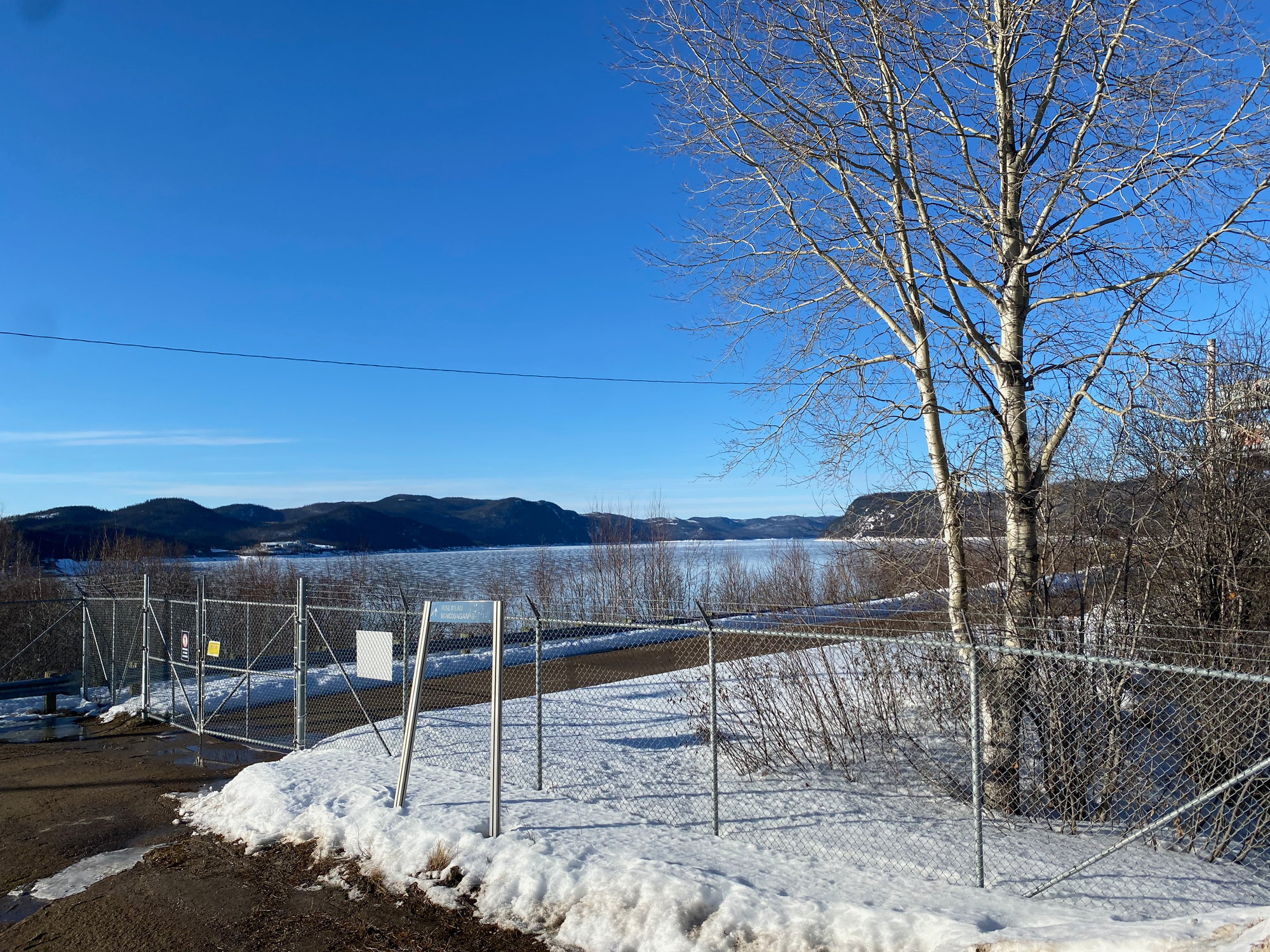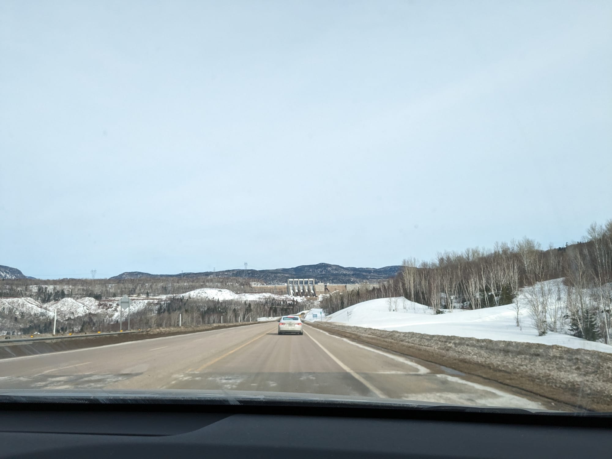 On the way back, we explored the area past the dam. The road switchbacks uphill then reaches a parking lot where the dam meets the hillside (unfortunately, the actual dam is gated off). A mound of snow provided our first view of the actual Manicouagan reservoir. We walked around the parking lot, unintentionally interrupting a meeting Y. and M. were having in the Tesla.