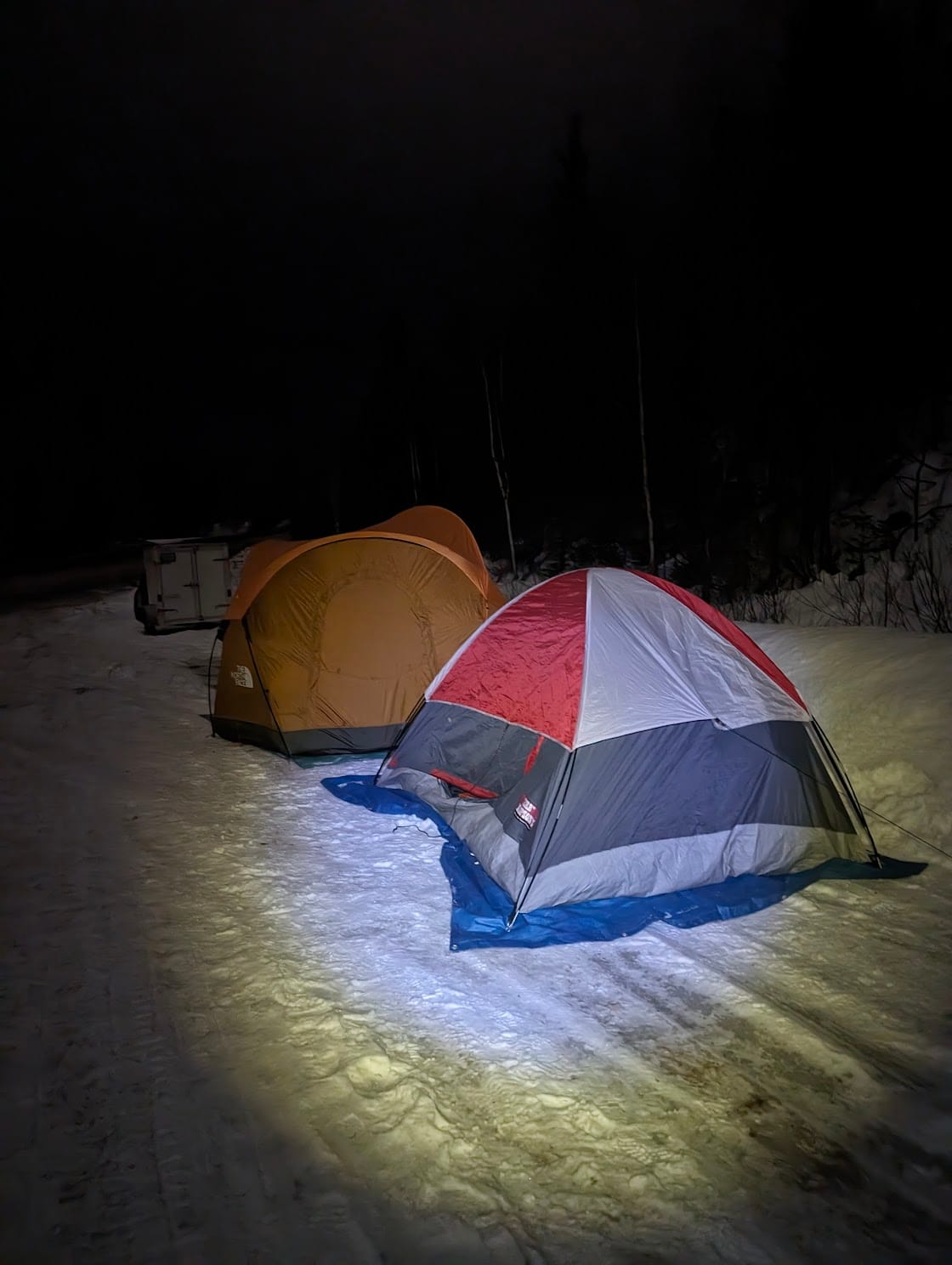 The spur road was covered in ice and rose up at a slight incline, but it was gentle enough for us to set up tents. The other drivers and I shuttled people back and forth between the parking lot and the tents. Someone had parked a snowmobile trailer next to the entrance, so we ran the gauntlet up the icy road between the trailer and the snow bank.