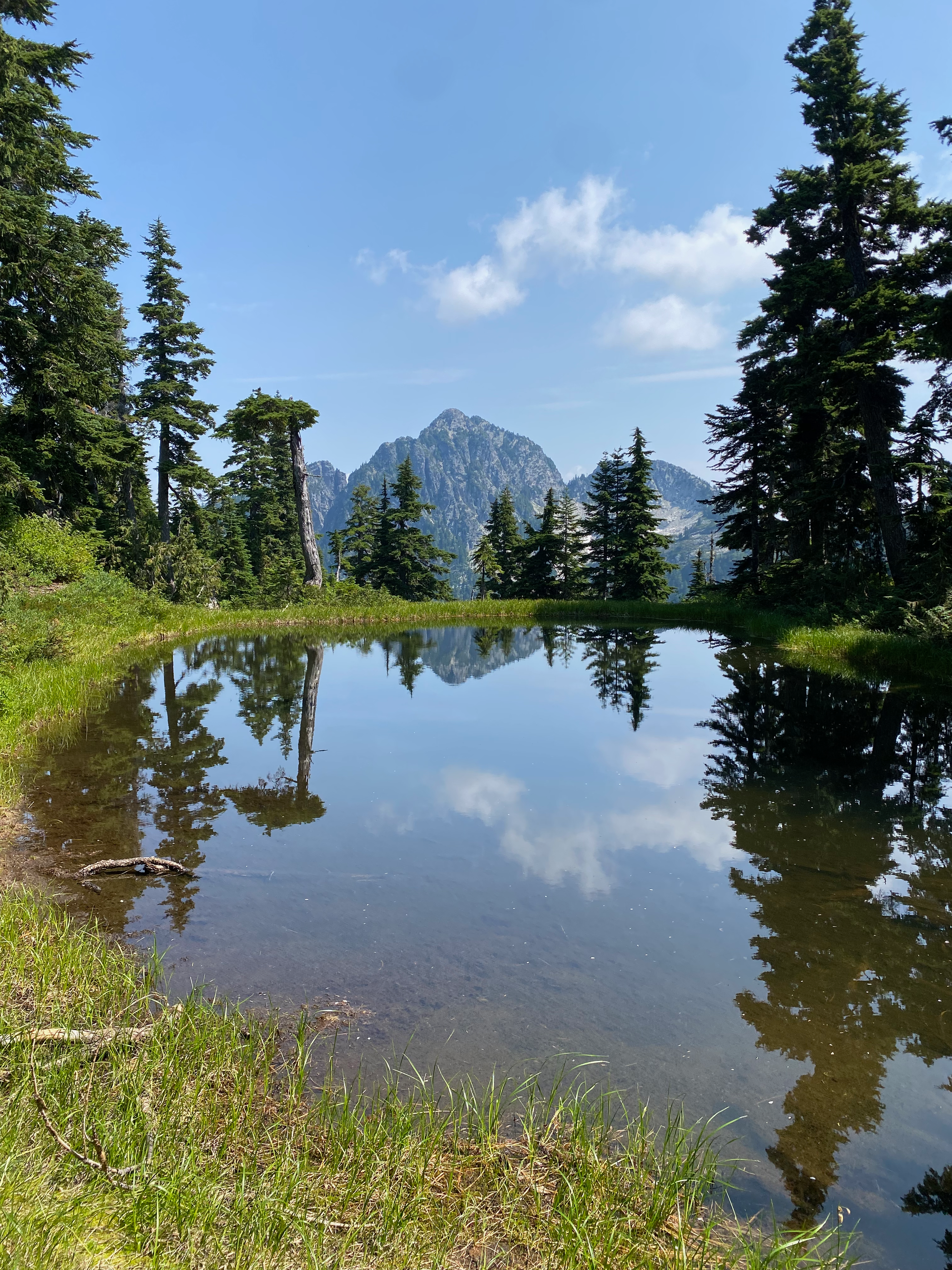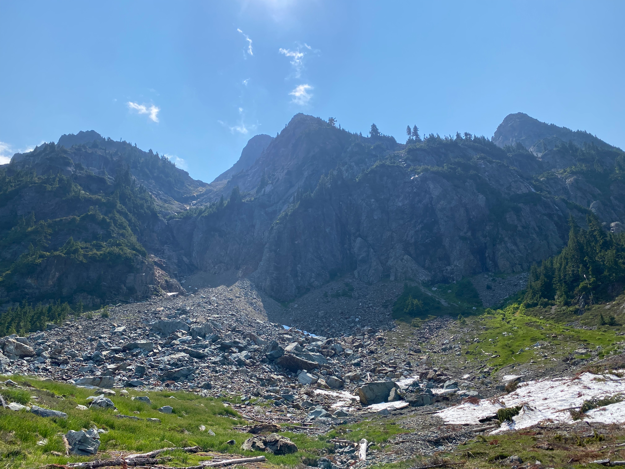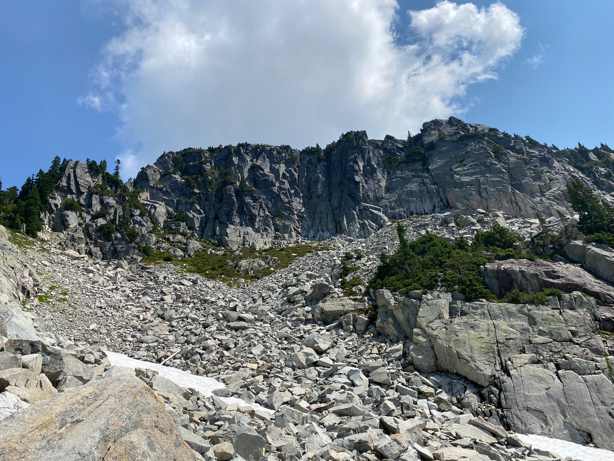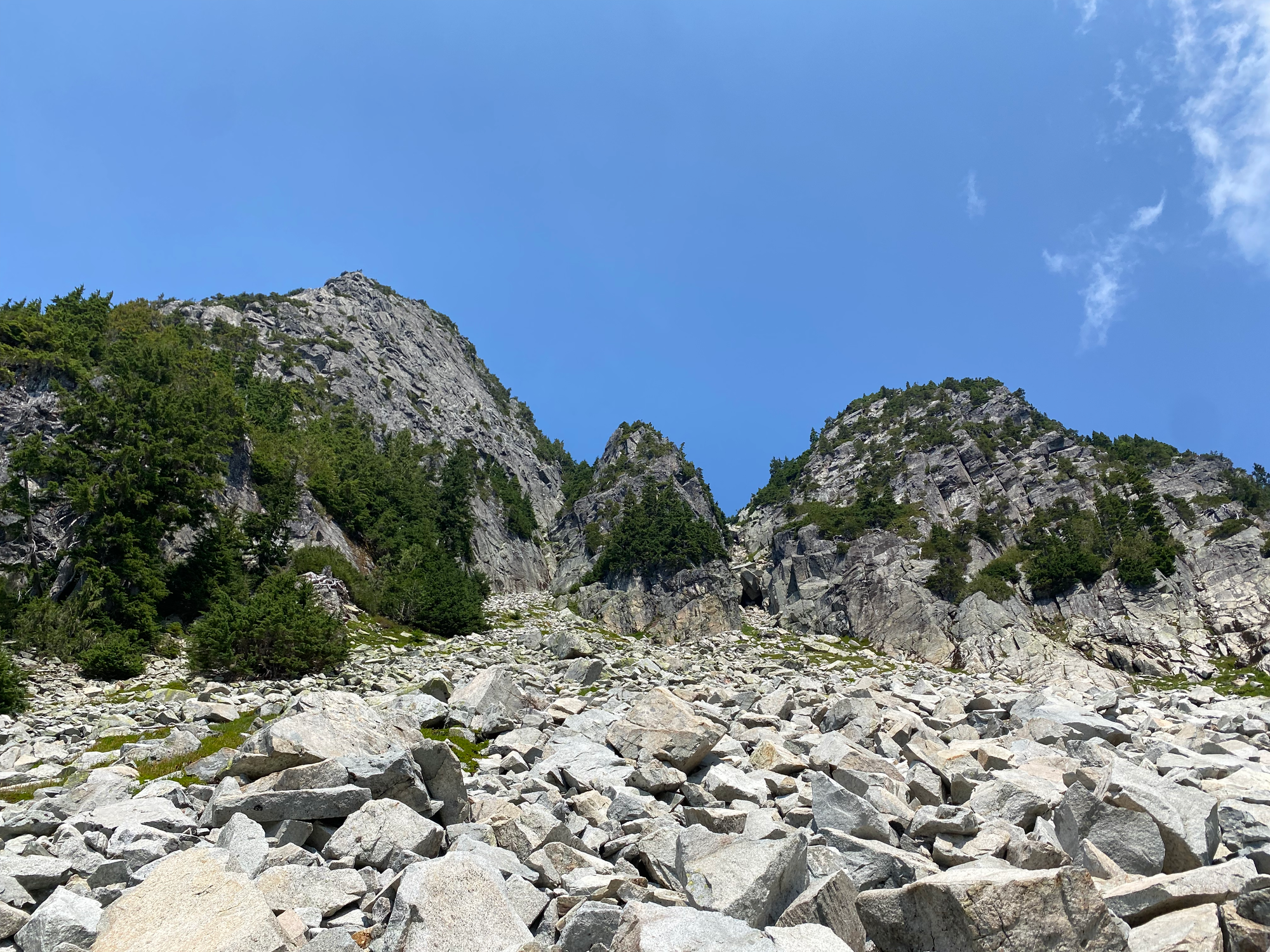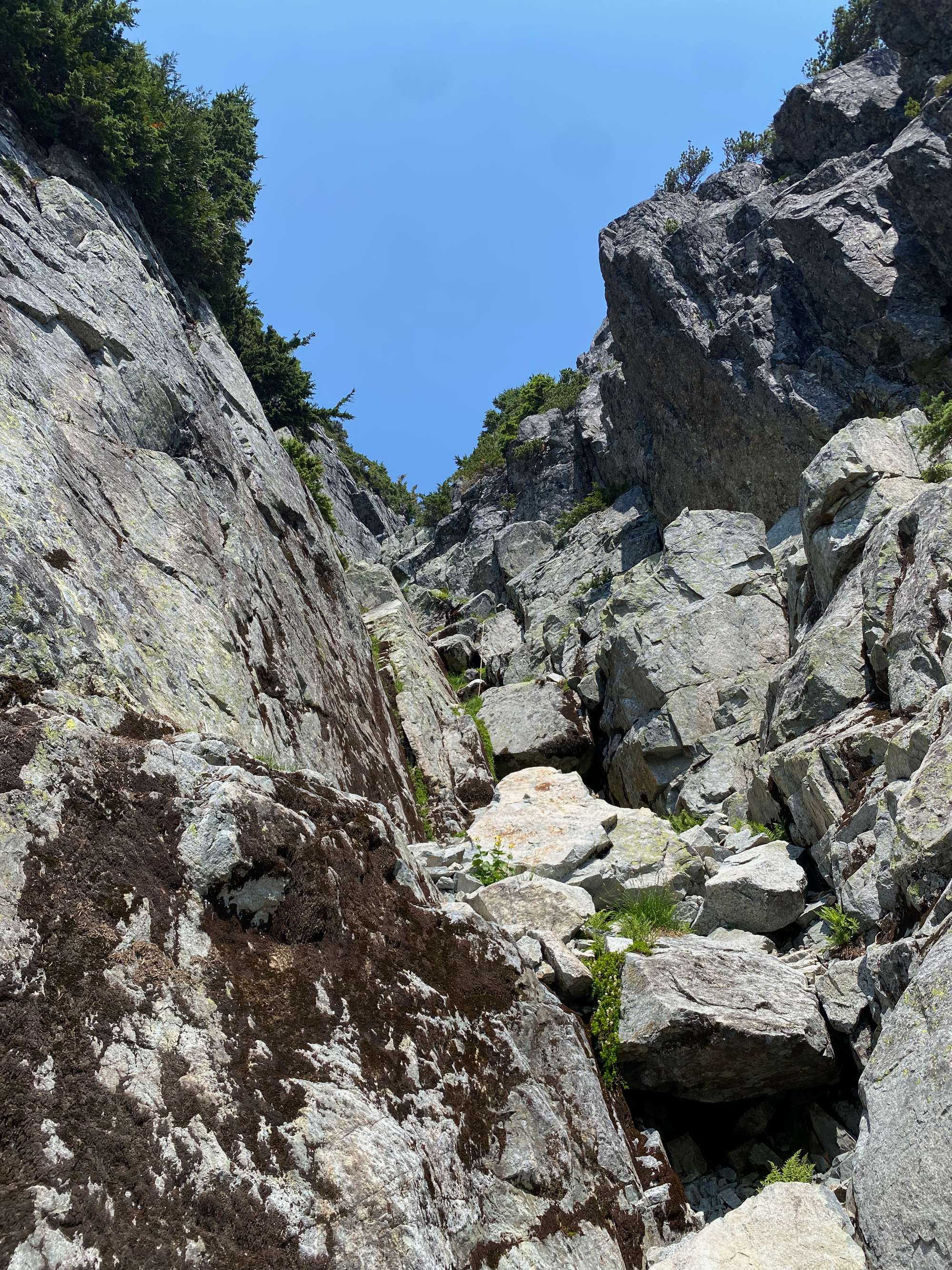 From there, I traversed below some cliffs and waterfalls to reach the boulder field at the base of the gullies. I took the left gully, with lots of fun class 3/4 scrambling moves. The most difficult section was the first major scramble step. A fixed rope has been installed here. There were a few more scramble sections past that, then the upper half of the gulley flattens out. The summit had an interesting perspective on Brunswick and nearby mountains.