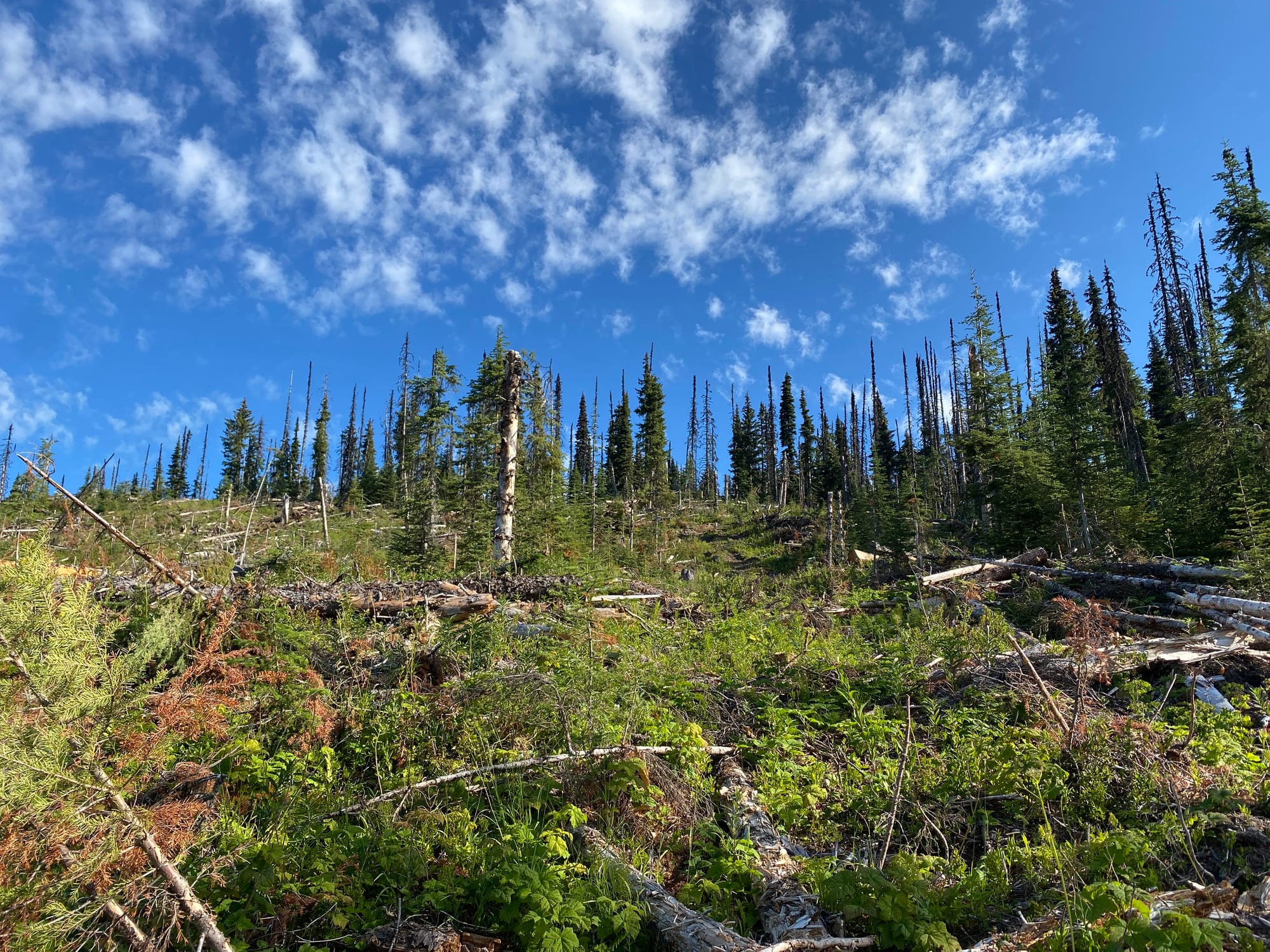 I headed west on a decommissioned spur road. I’d planned to follow the tracks on peakbagger.com, but there was a new cut block to the west, so I went there instead. Skidder tracks made for easy travel.