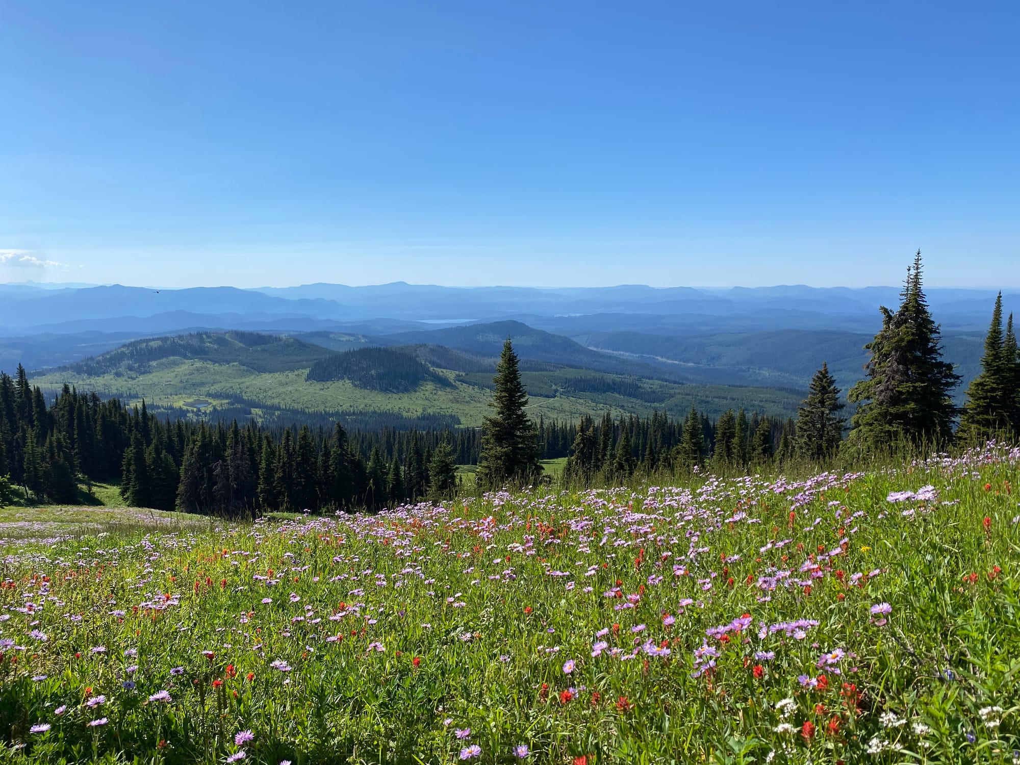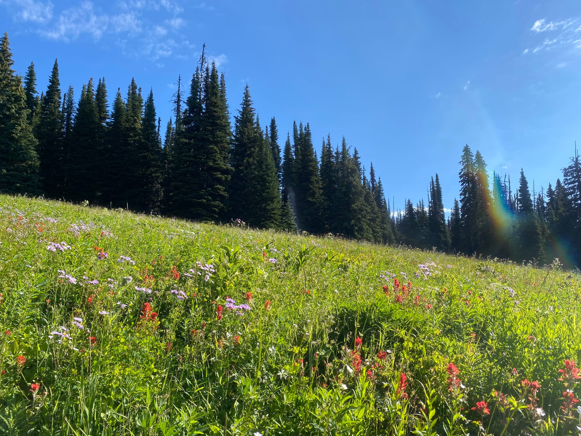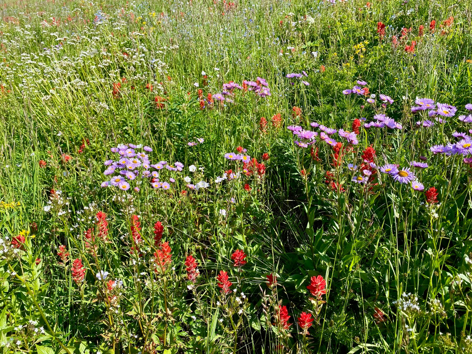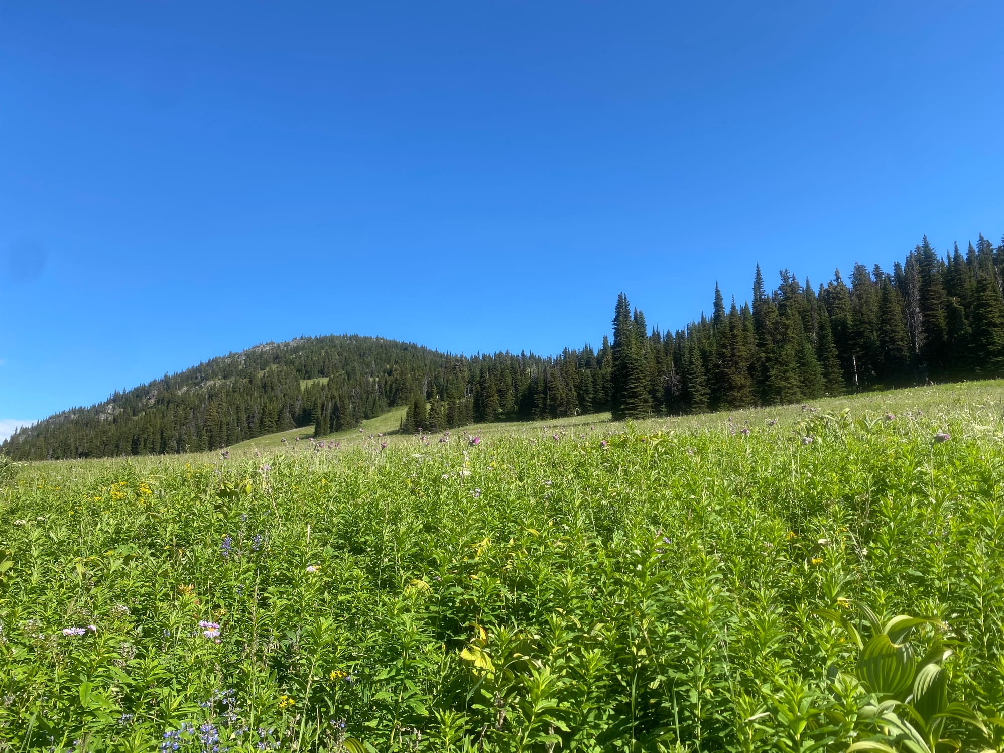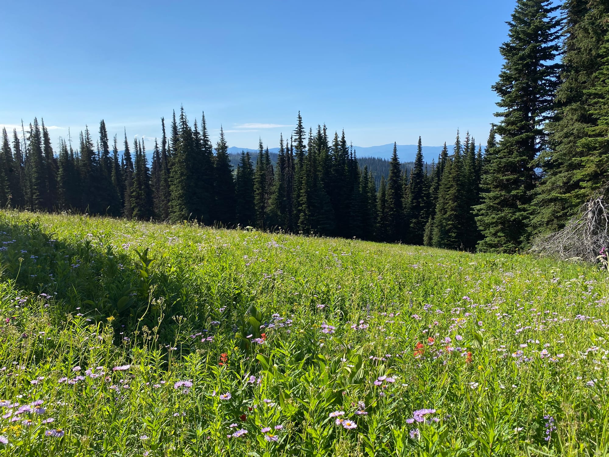 Eventually the forest opened up, and there were sections of picturesque alpine meadows. As on Big Timothy Mountain yesterday, the wildflowers were in full bloom.