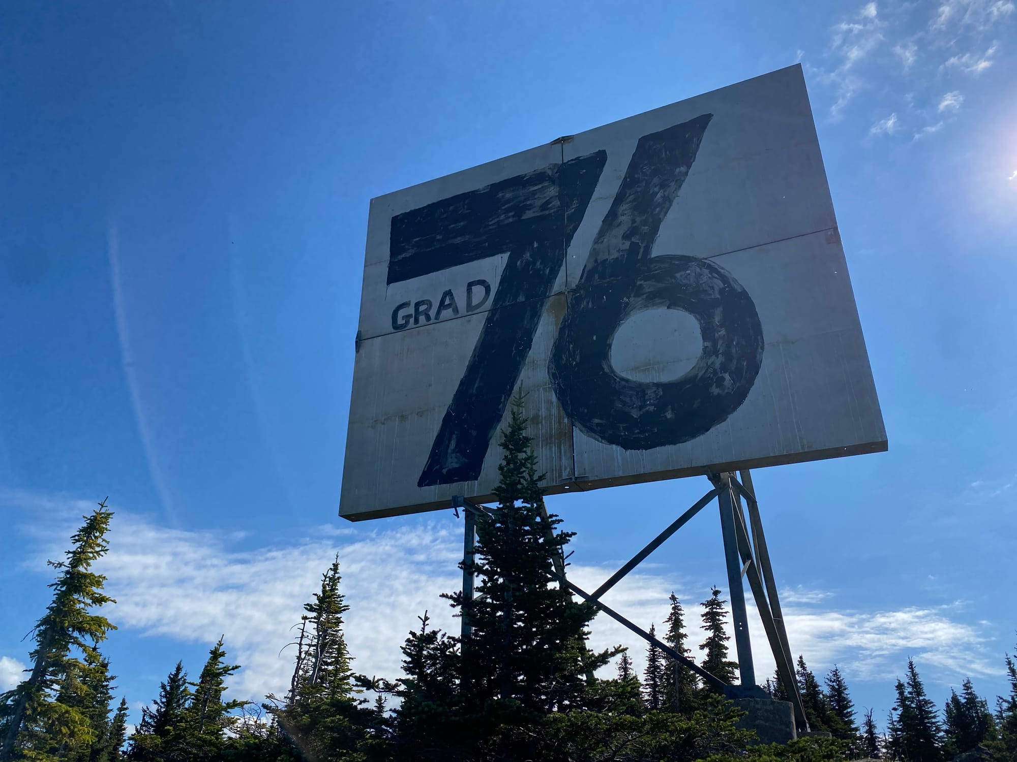The summit is mostly forested, but good views could be found by walking around. There’s a massive sign with “Grad 76” written on it, left by local high schoolers. The sign is visible from the valley.