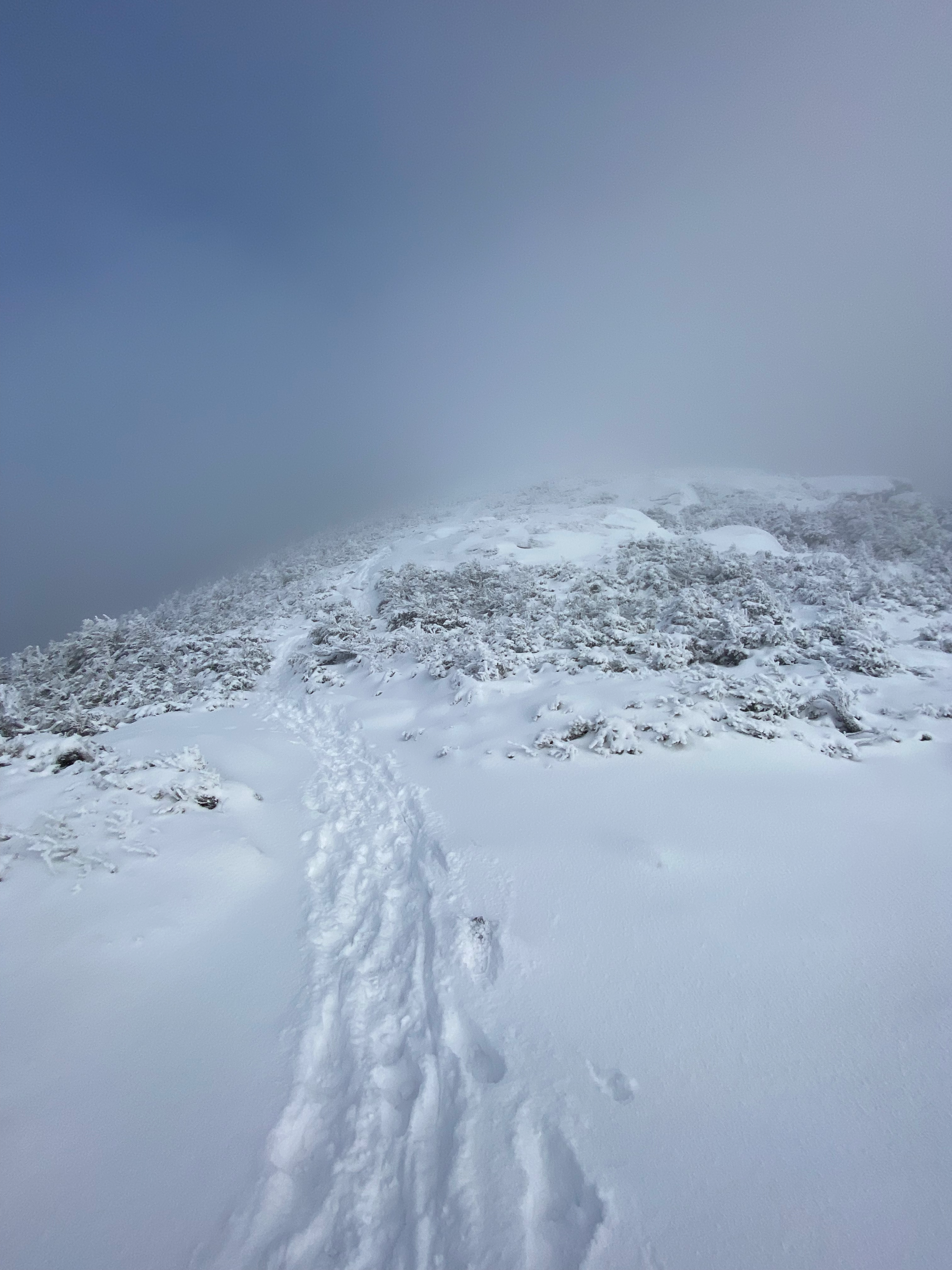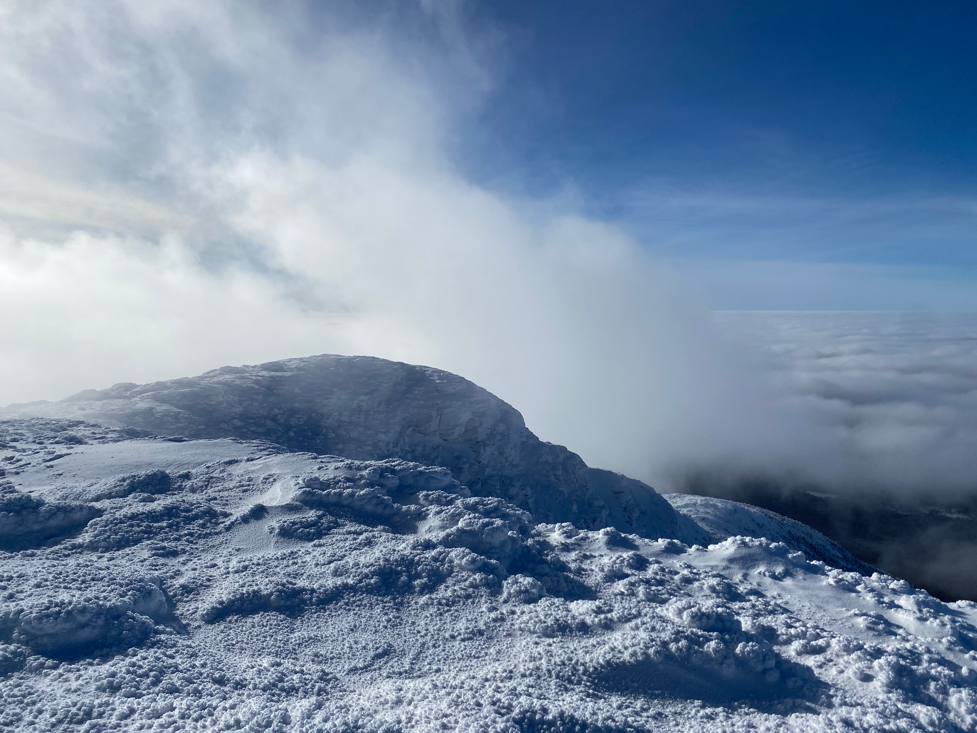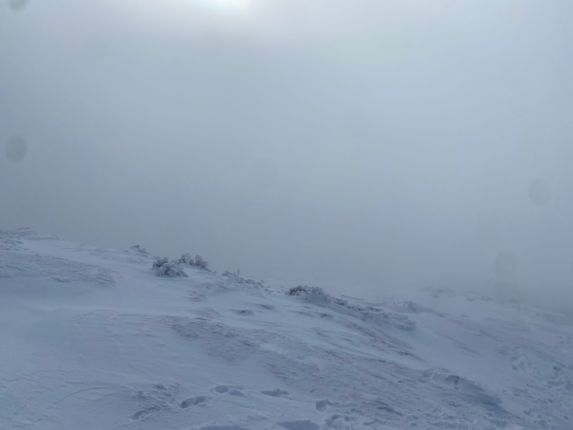 I continued 200m north to the summit. This section was extremely windy and cold. Snow had gathered around the stunted trees, creating a scene out of a Star Wars movie set. I hung out on the summit for about five minutes, walking around to stay warm, before heading down. On the way down, the clouds started to clear.