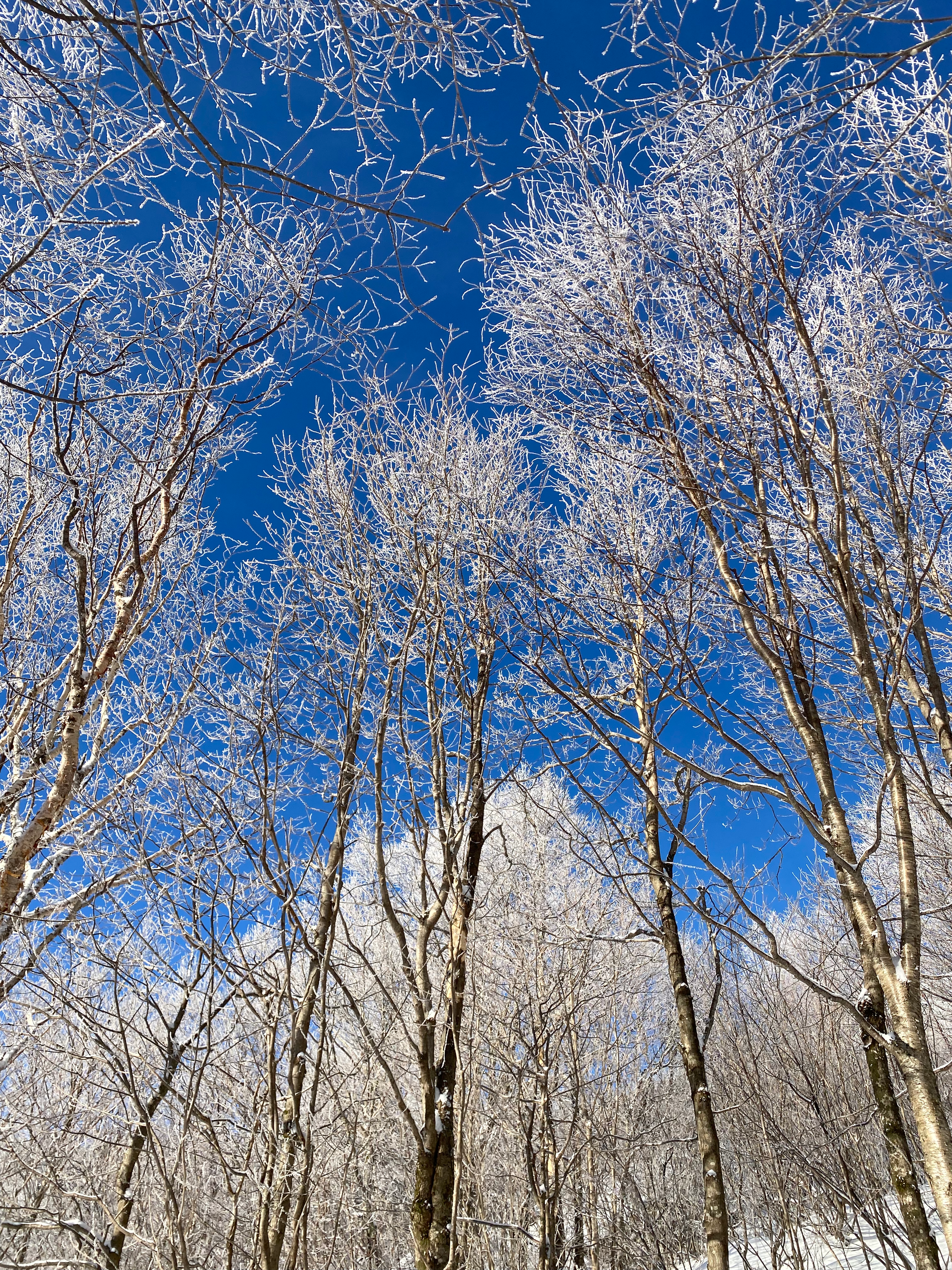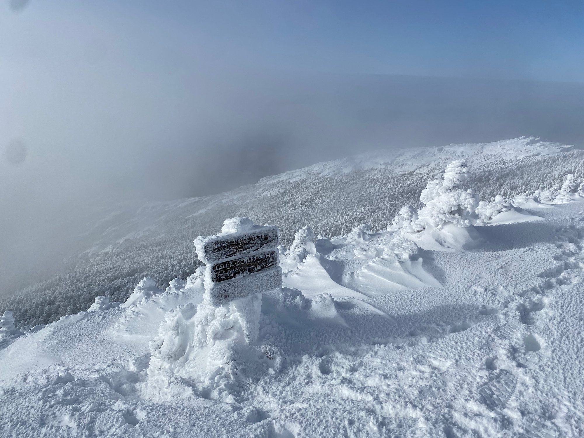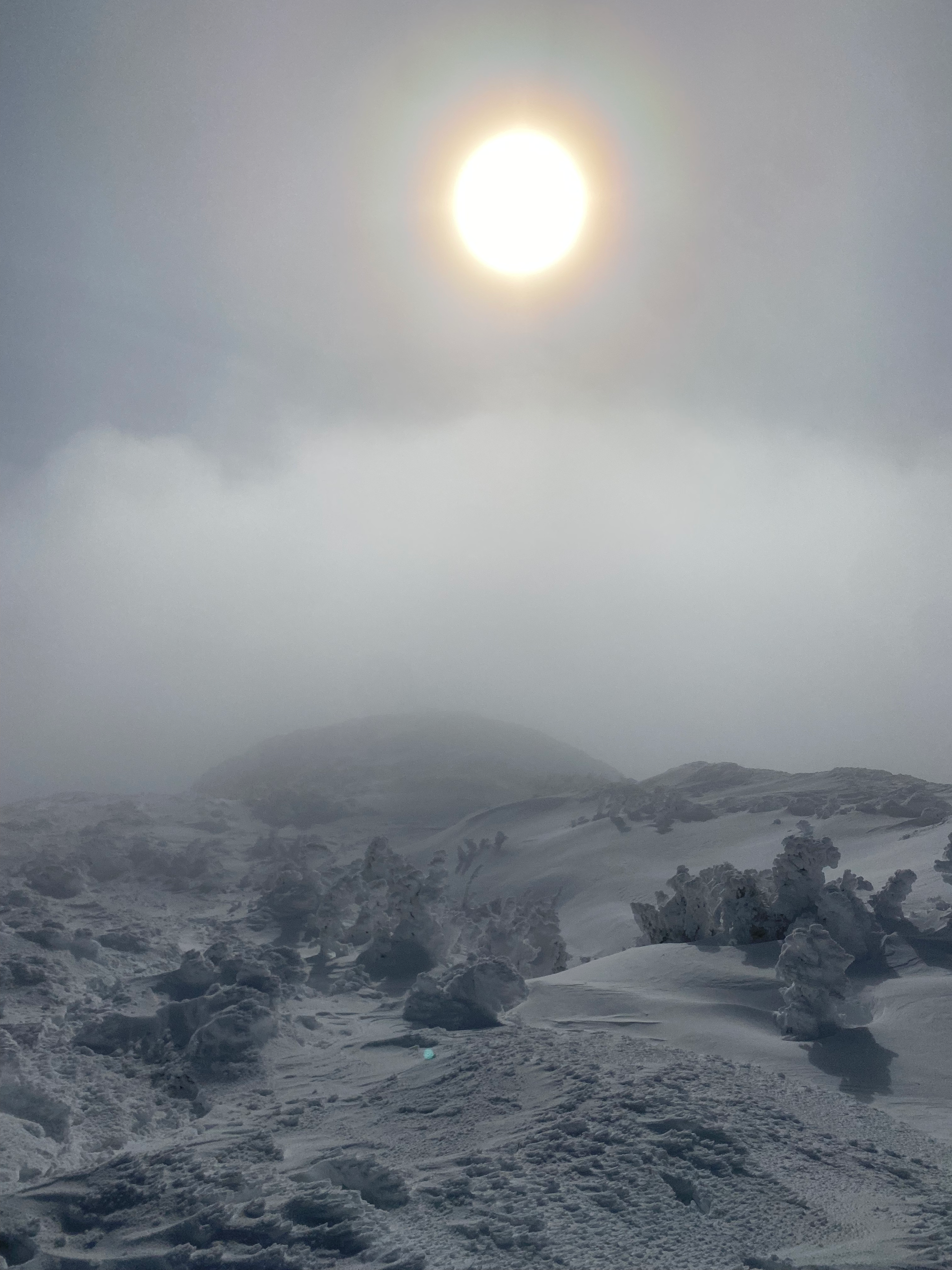 I continued 200m north to the summit. This section was extremely windy and cold. Snow had gathered around the stunted trees, creating a scene out of a Star Wars movie set. I hung out on the summit for about five minutes, walking around to stay warm, before heading down. On the way down, the clouds started to clear.