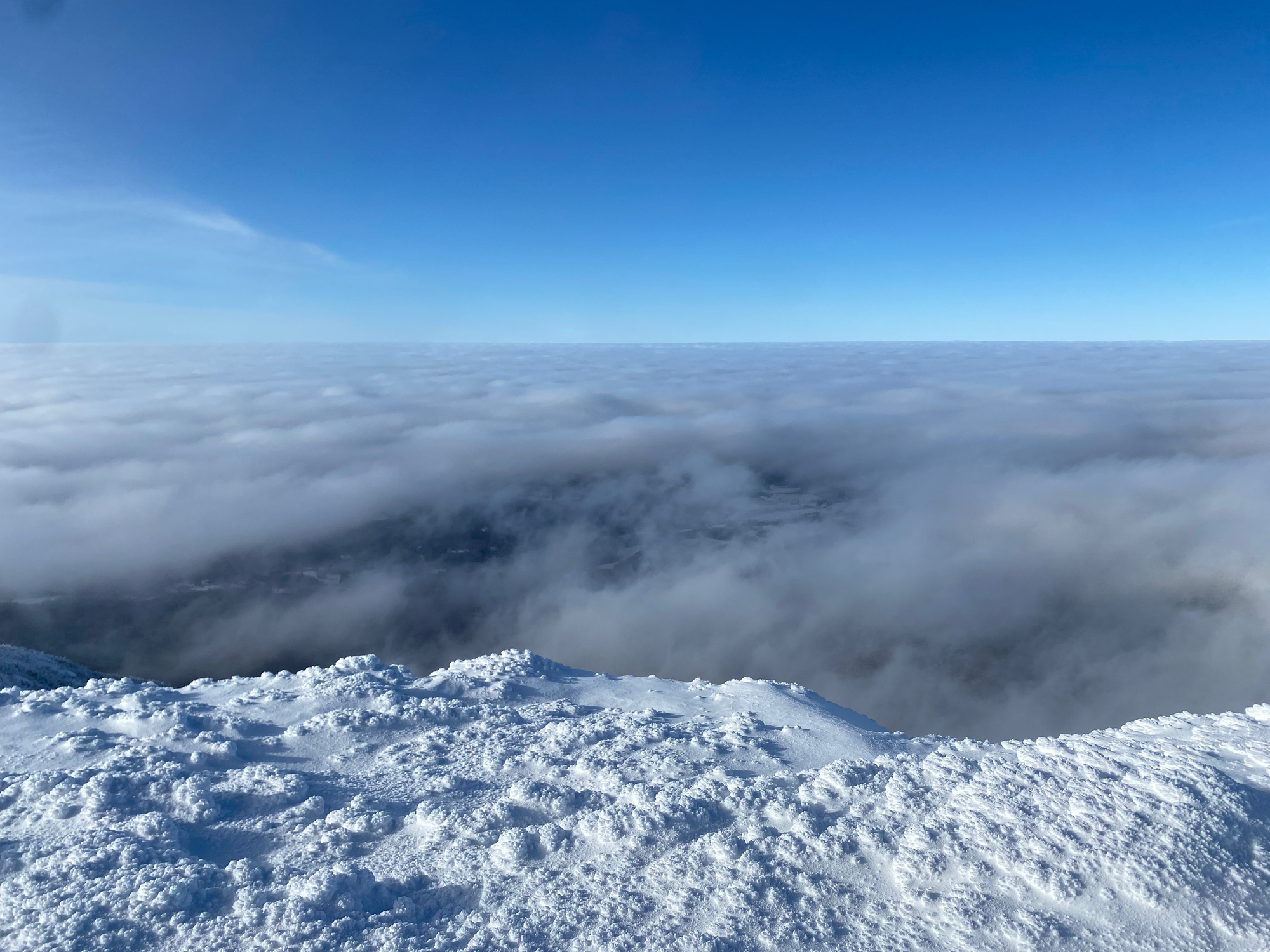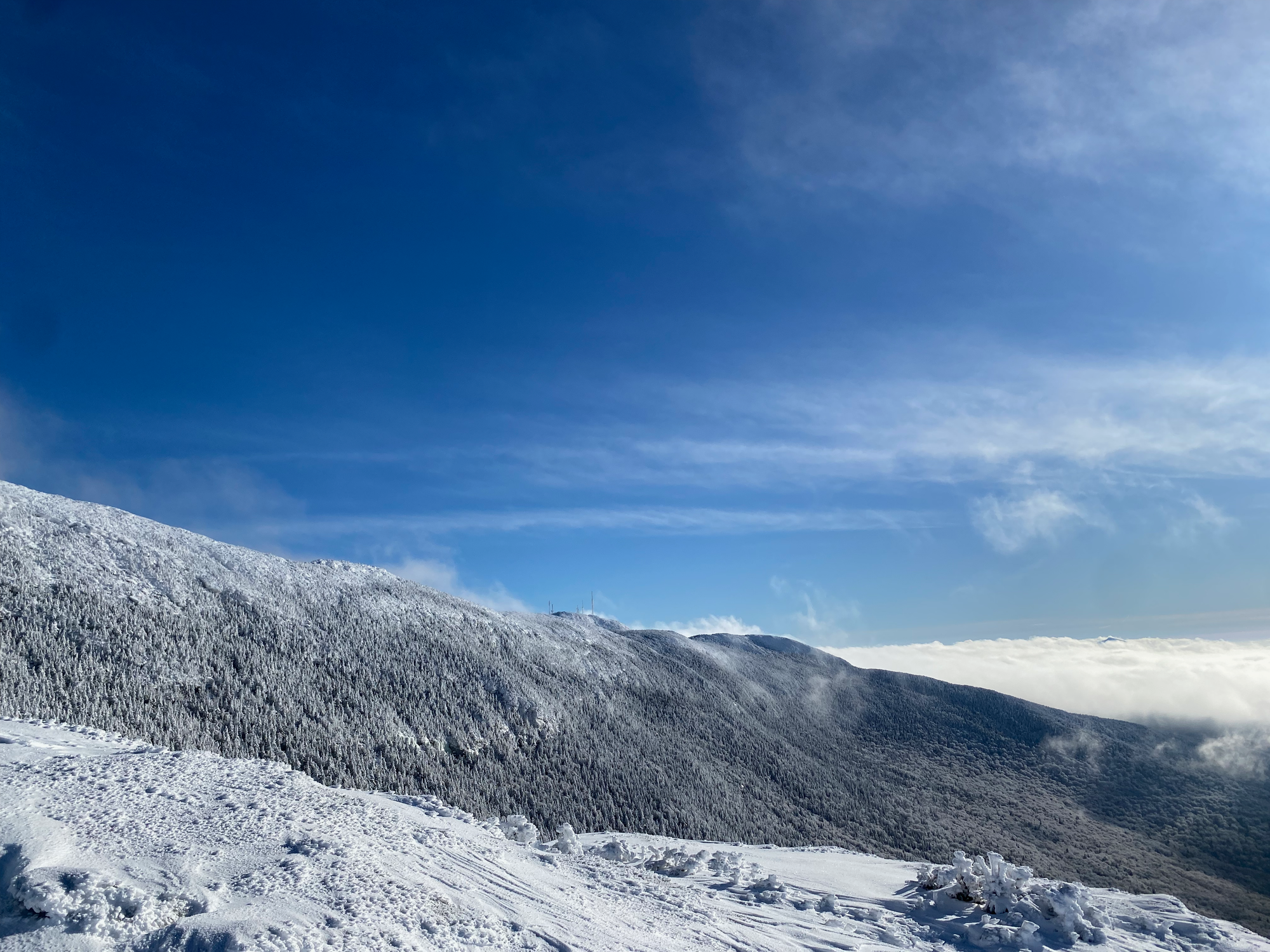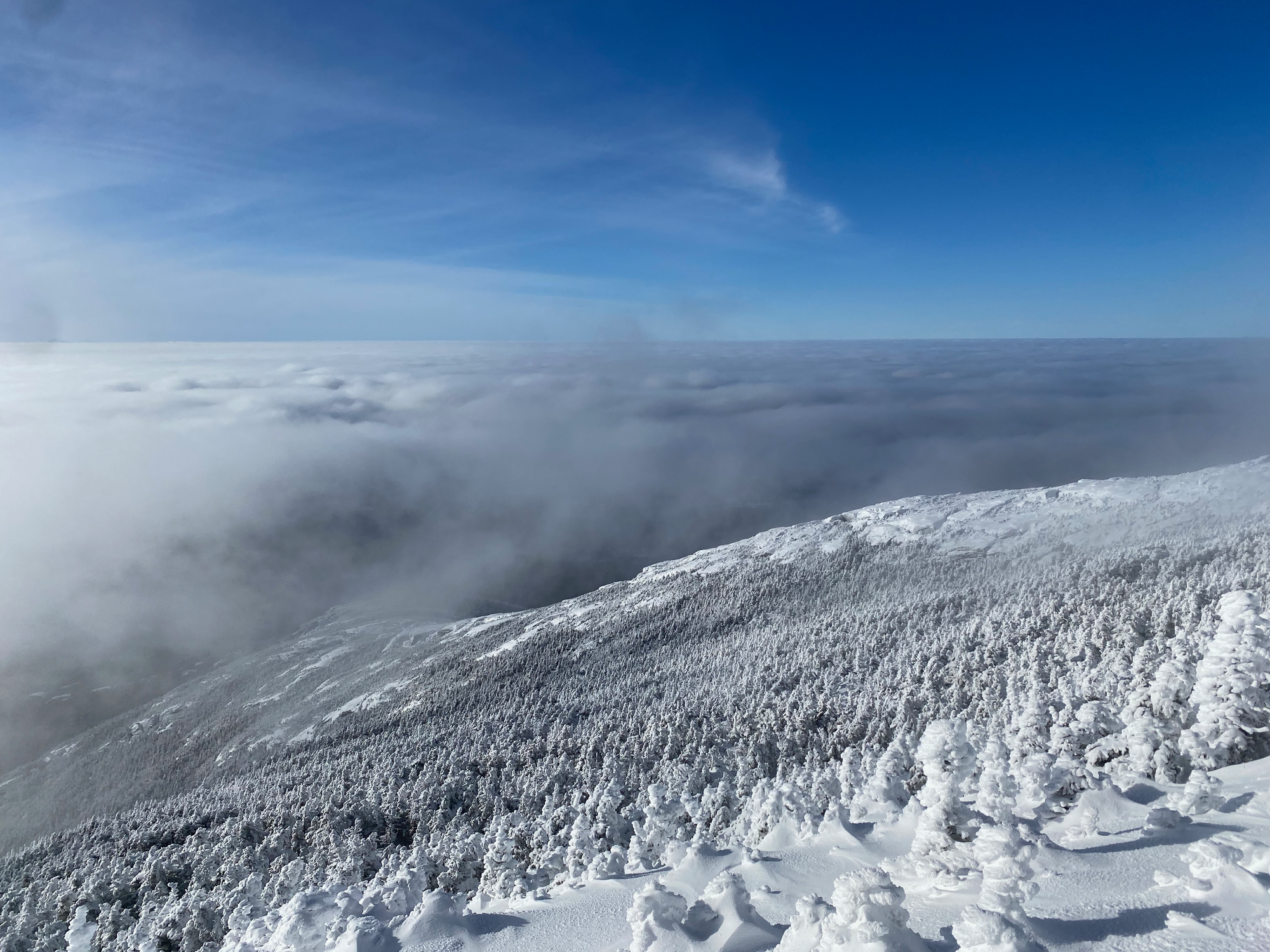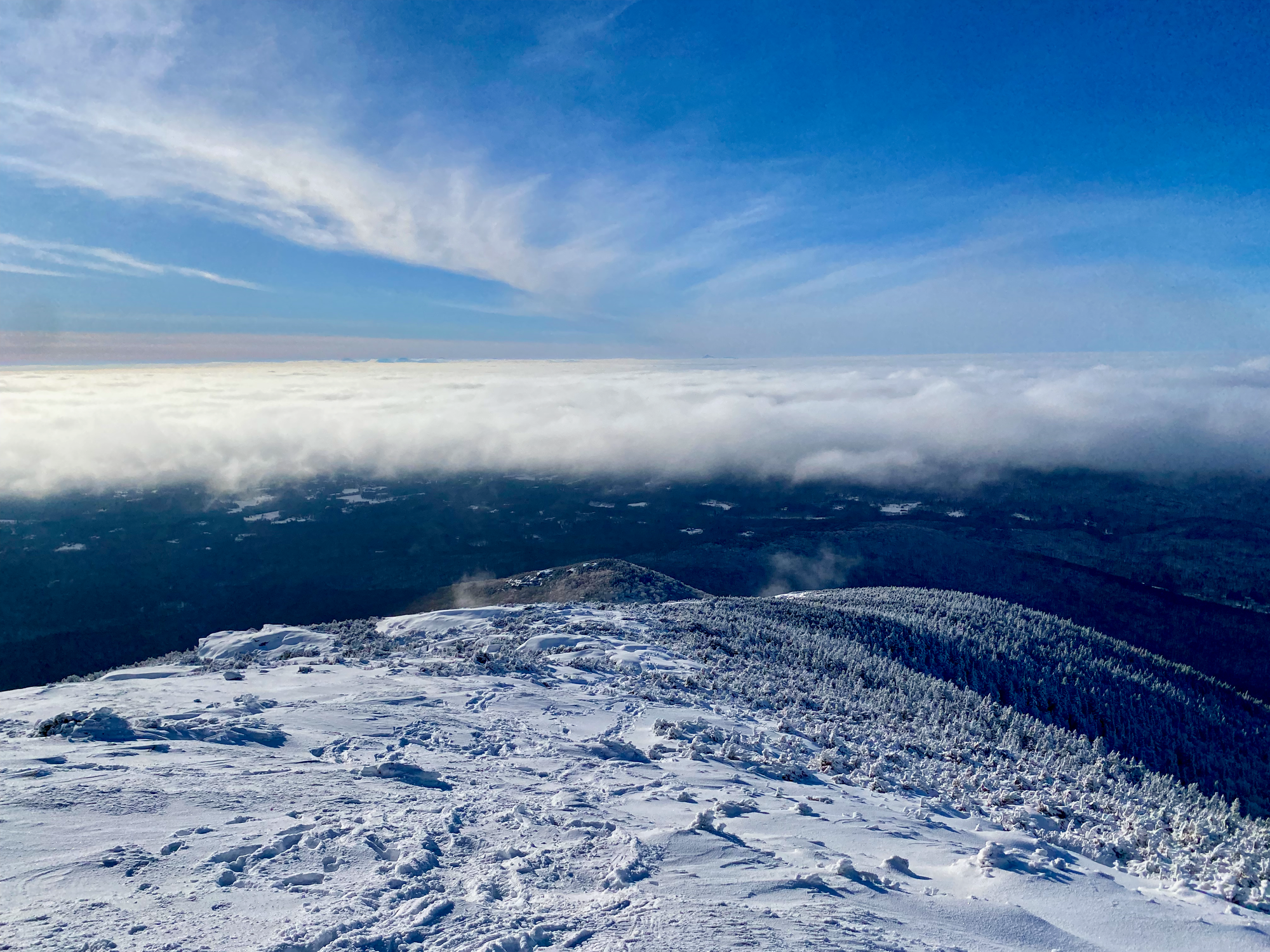 By the time I reached the ridge, the upper clouds had cleared, leaving a sea of fog stretching as far as I could see. In the distance, the higher peaks of the Adirondacks and the Whites rose above the cloud ocean. I’ve only seen this a couple times, and this was my first time seeing it outside British Columbia. It was stunning.