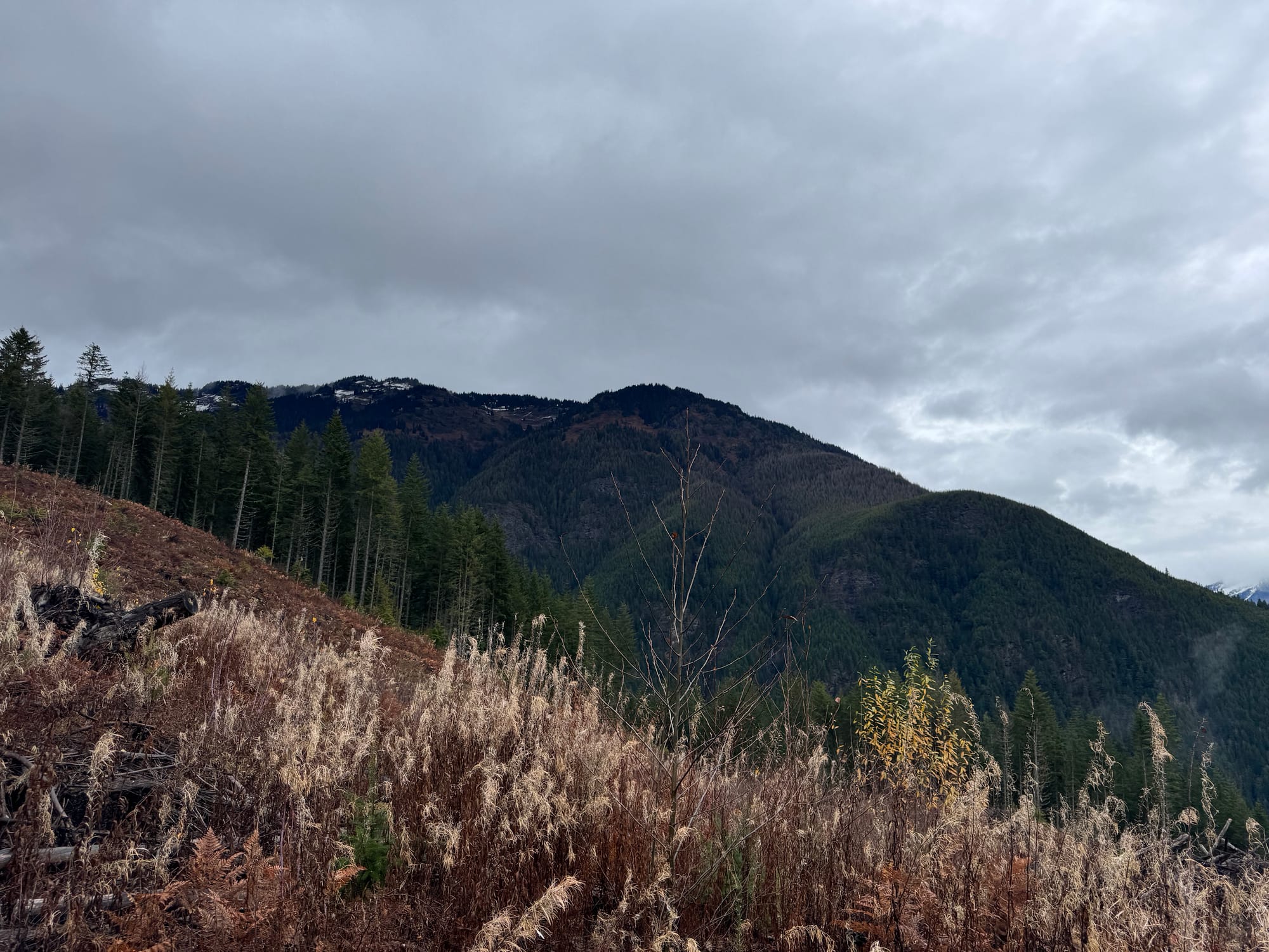 We continued through the forest to another cut block at 1000m. On the way up, we followed the logging road to its end, then walked up the cut block. There’s a faint flagged trail on the other side of the cut block, which is marked on Gaia. Instead of this route, I’d recommend our down track (north), which follows an actual trail for longer.