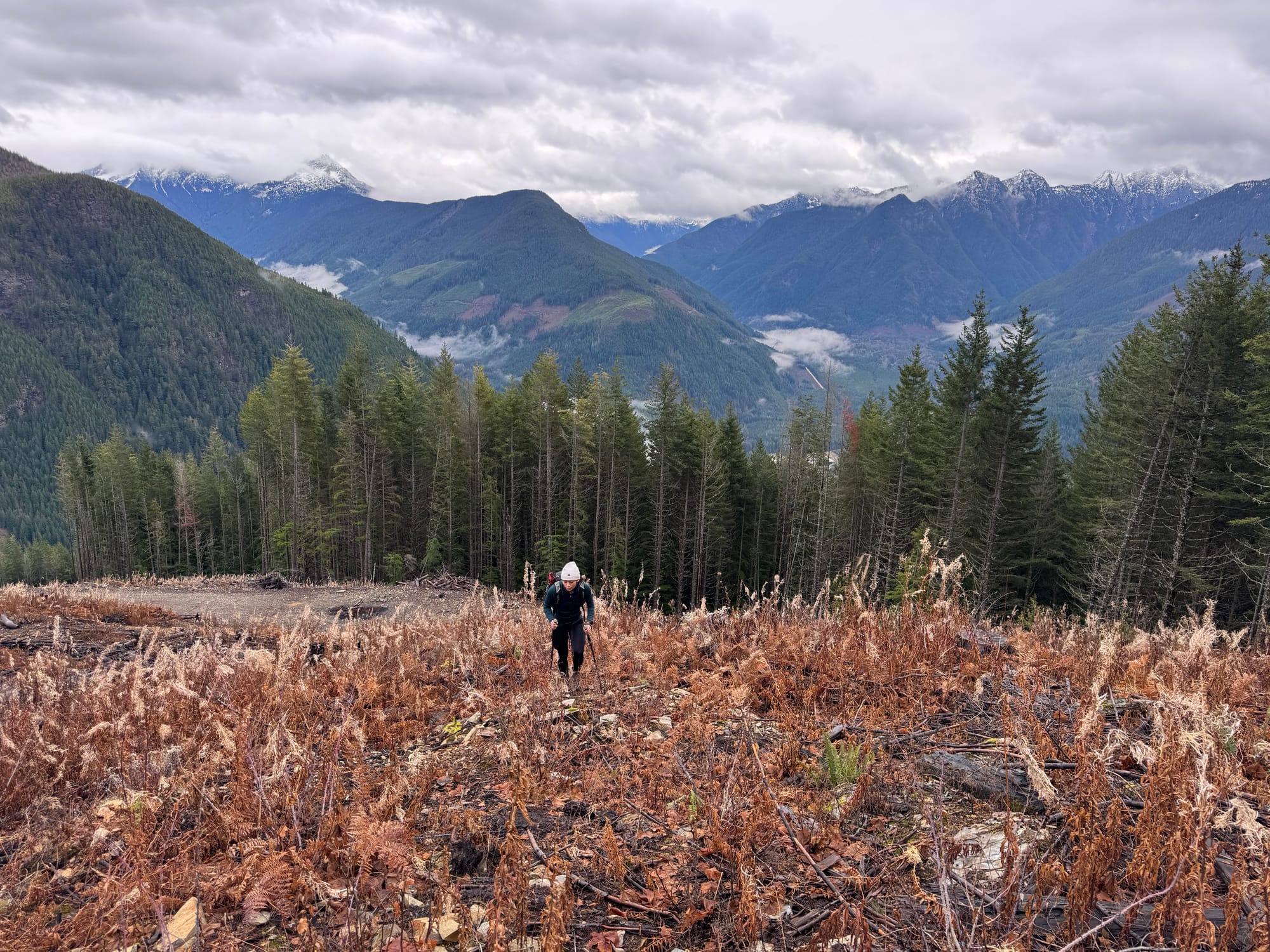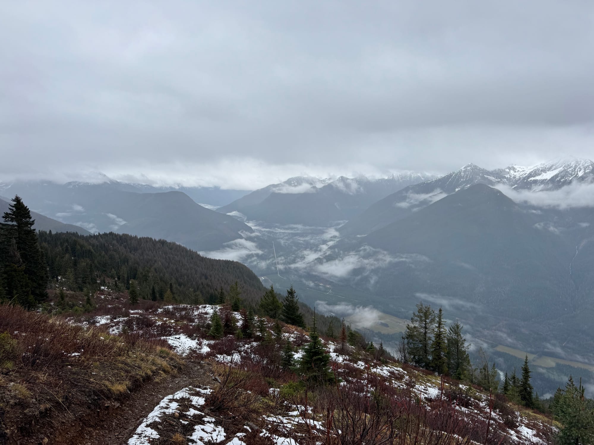 Eventually we reached the well-defined Mercer Parkway, which follows the ridge through forested and subalpine terrain to the summit. When the clouds parted, alpine meadows provided good views across the Chilliwack River Valley and north to the Cheam range. We brought snowshoes but ended up not needing them.