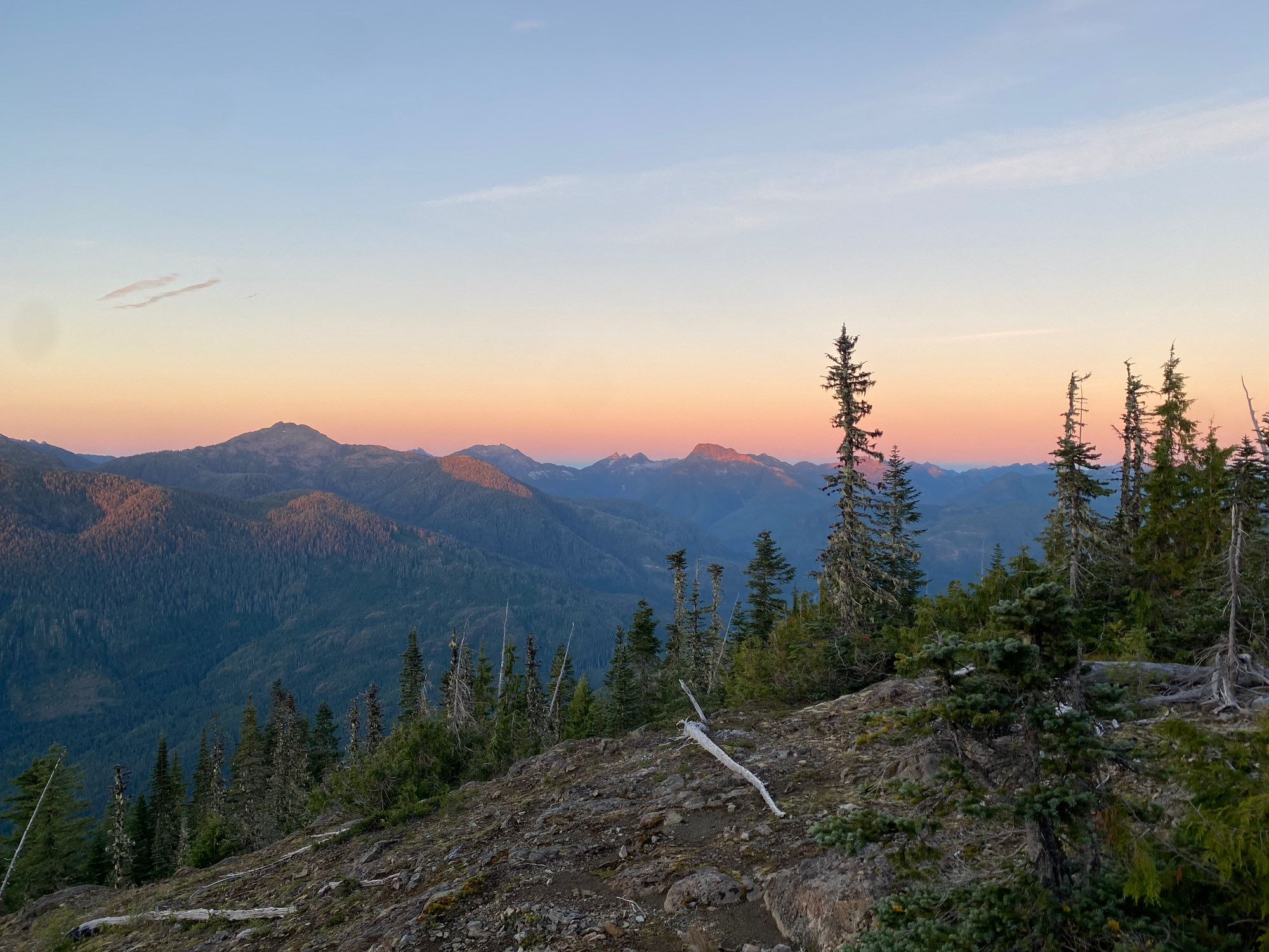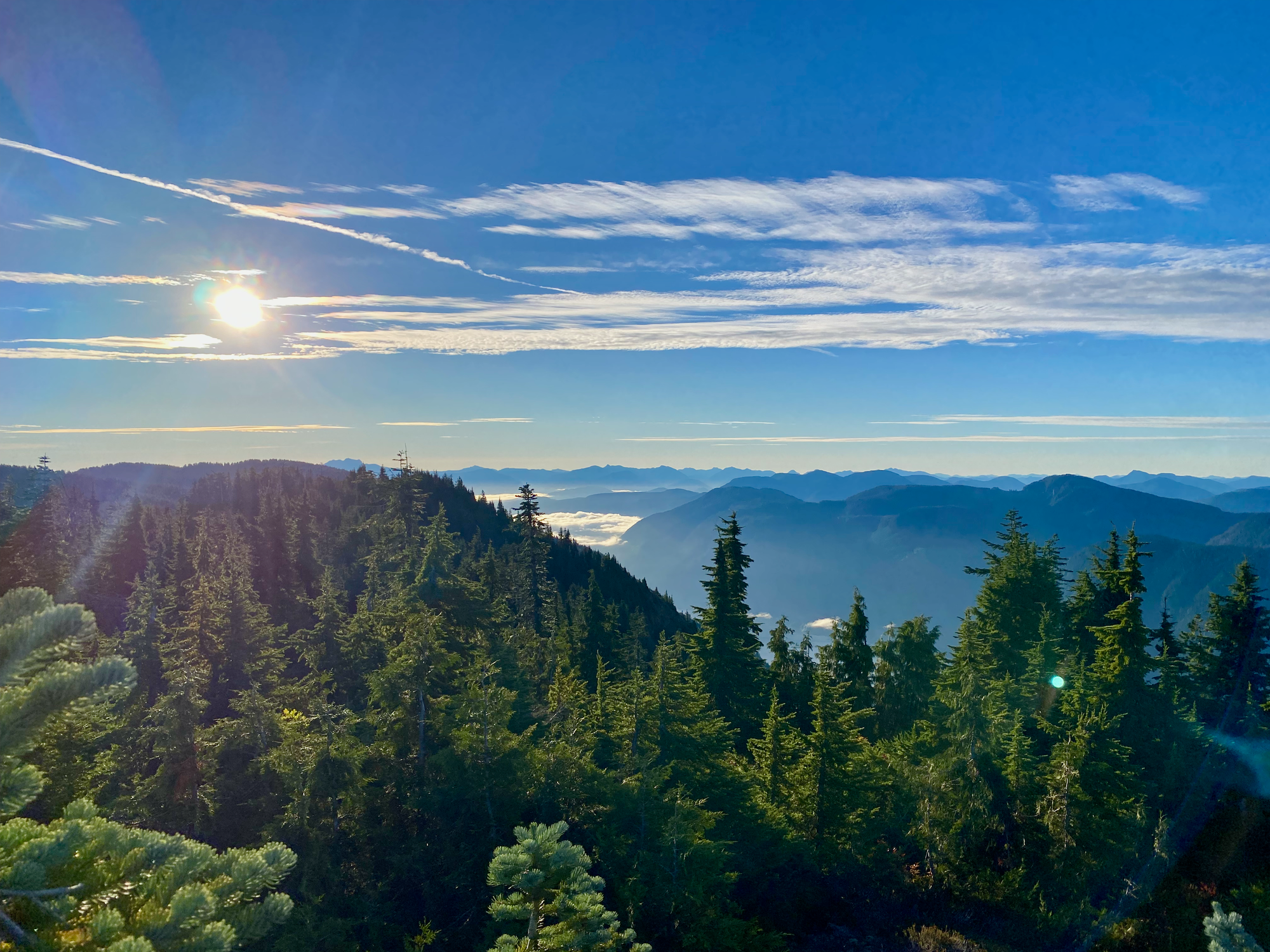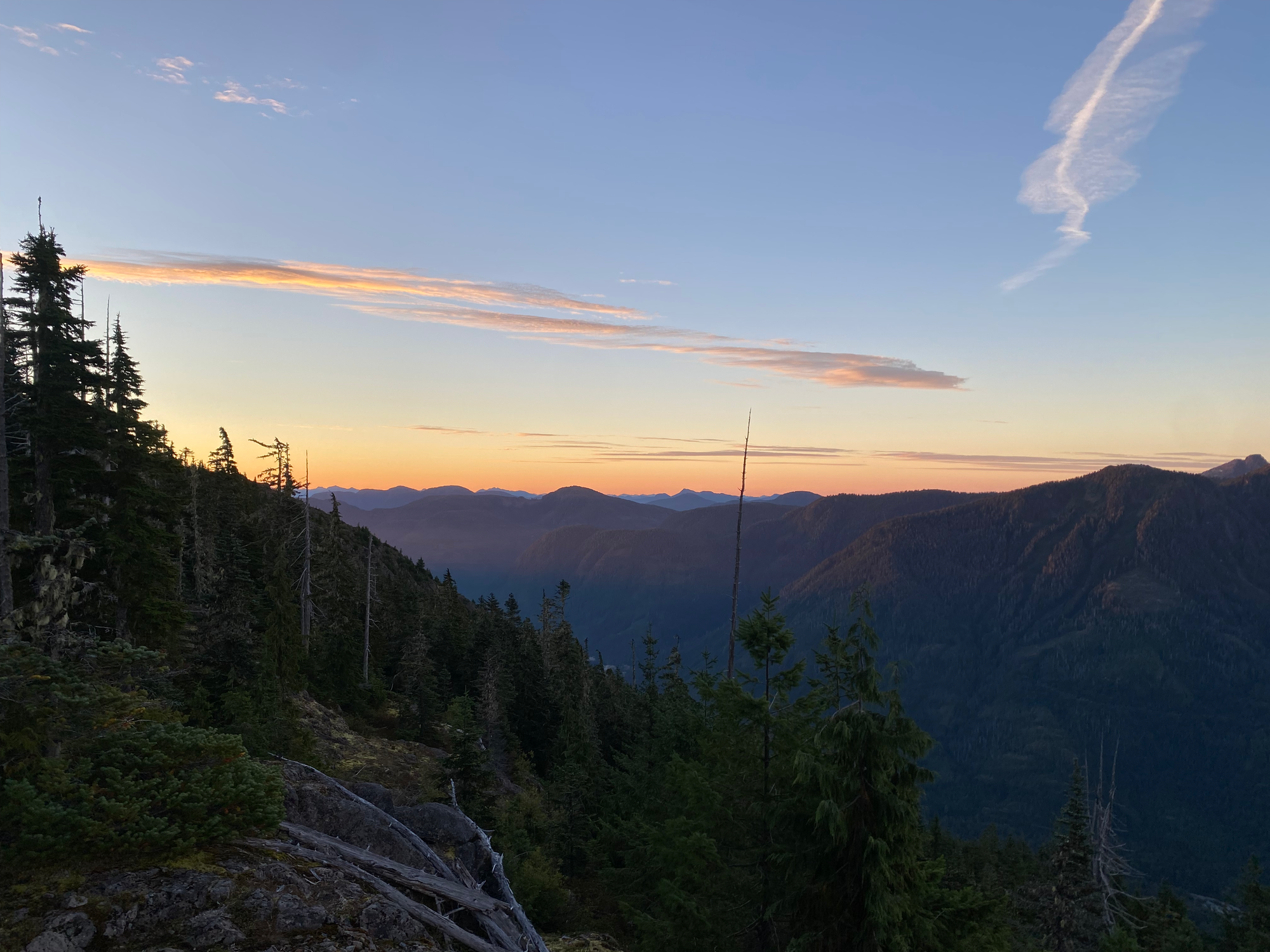 I car camped at the furthest drivable point and began hiking early in the morning. After leaving the logging road, the trail climbs to the ridge through the forest. It’s extremely well marked and is maintained by local volunteers (thanks!). Most of the ridge is old-growth forest. I caught the last remnants of sunrise at the first of many bluffy viewpoints.