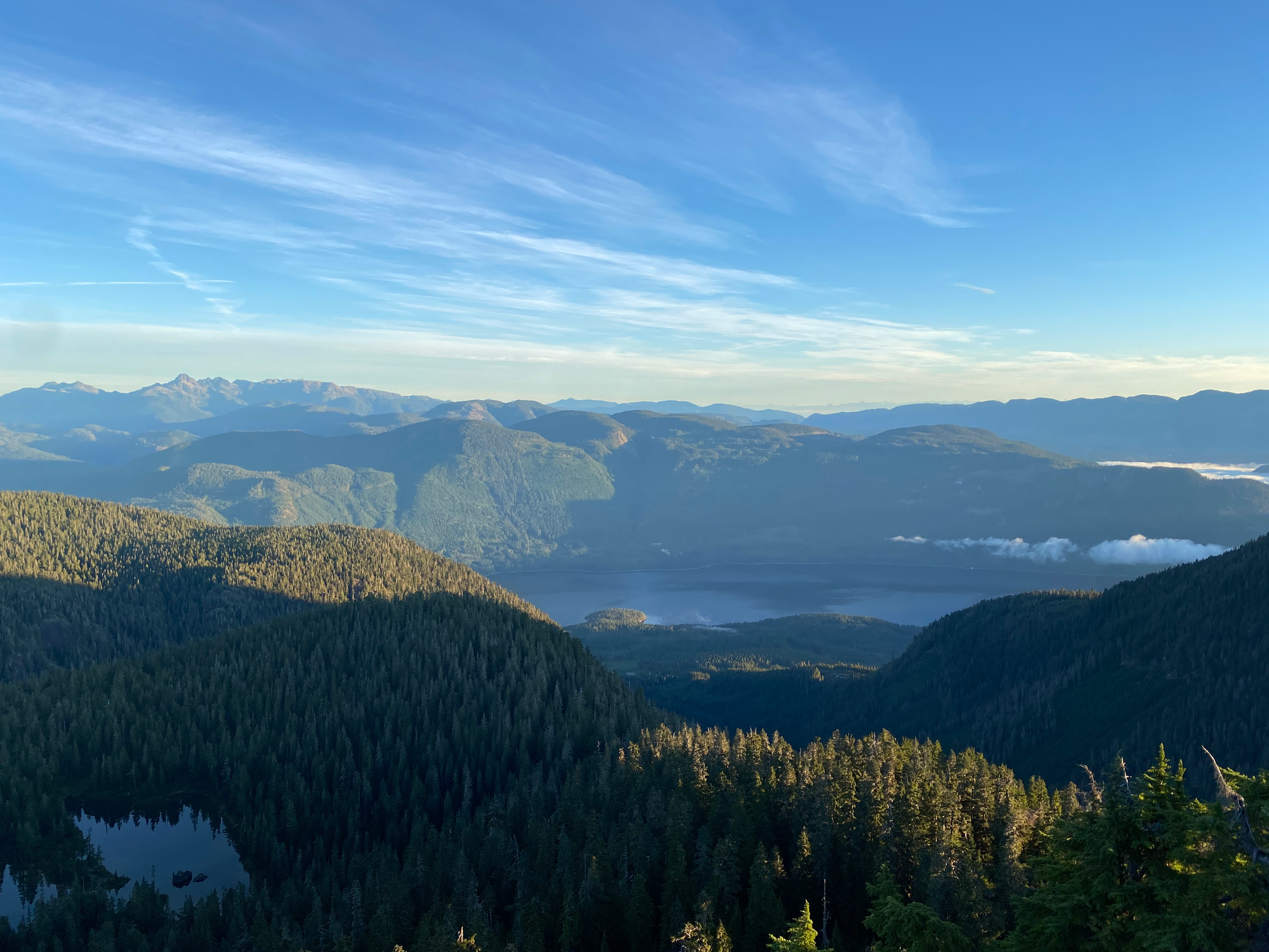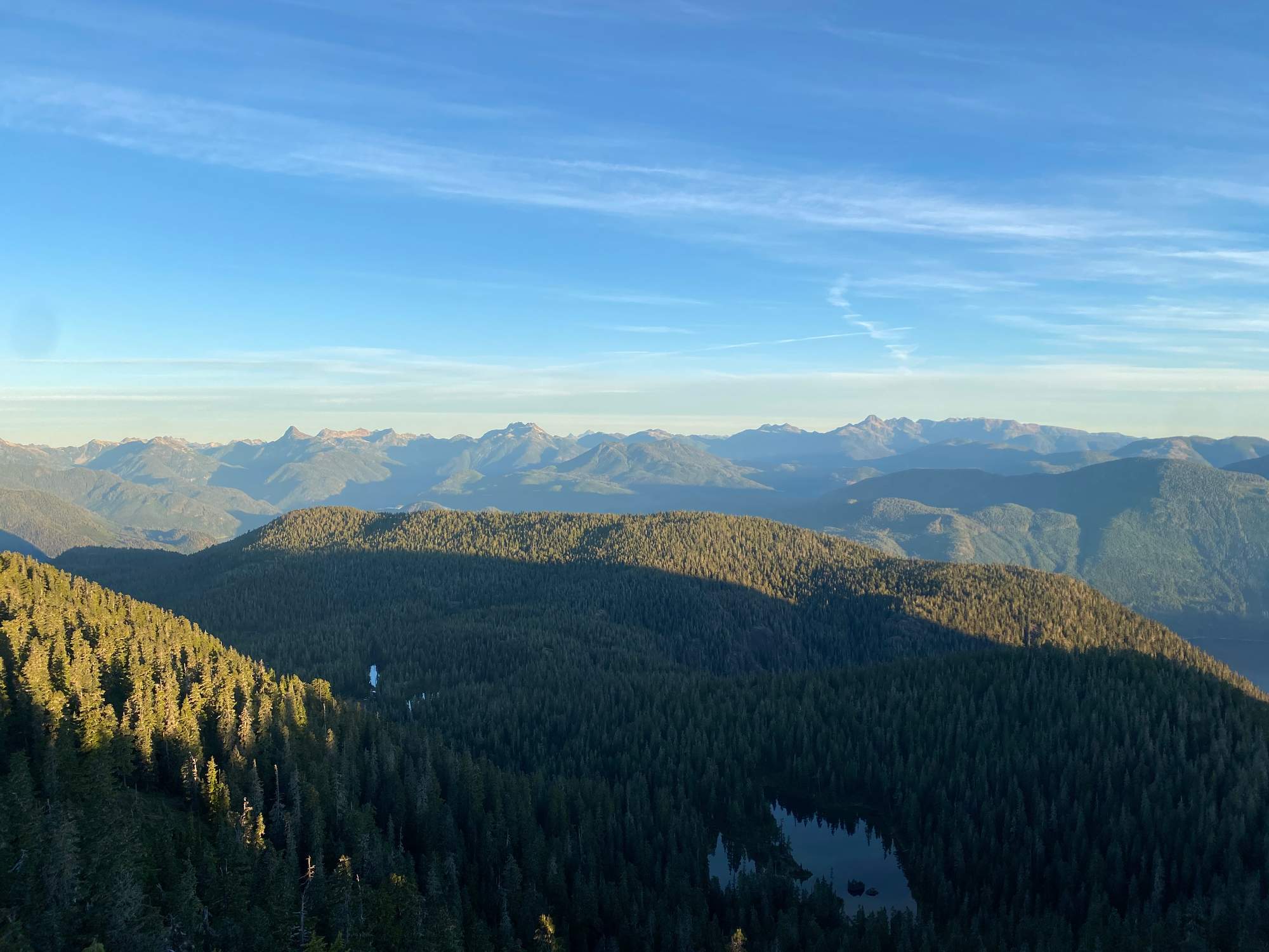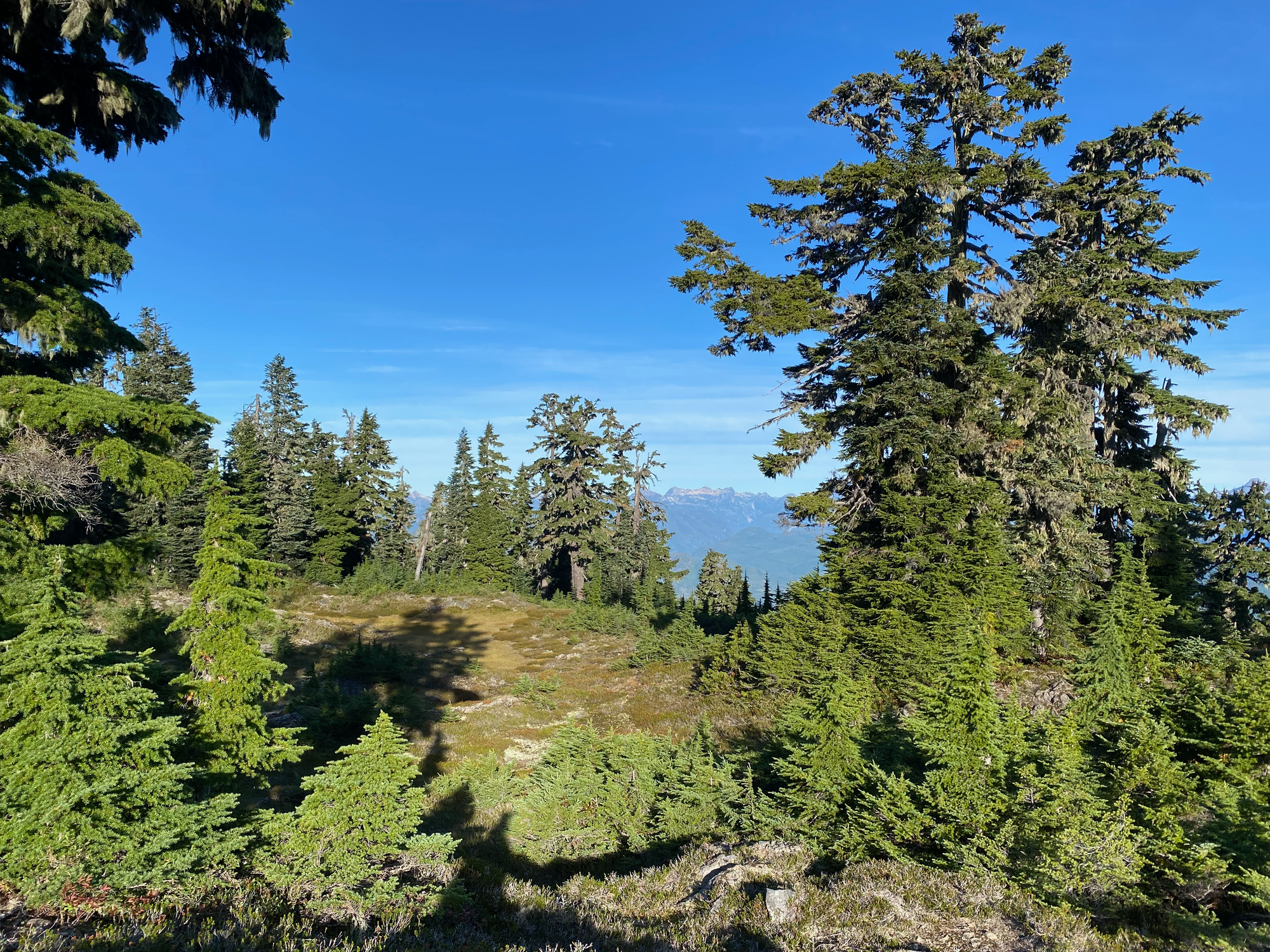 The name “Great Central Peak” conjures up an image of a massive rocky mountain towering over the island. In fact, this peak is unofficially named after the nearby Great Central Lake, and it’s a small forested bump only a couple metres higher than Porter. I bushwhacked north along the gentle, wide ridge that led towards the peak. The forest is old-growth, and a small fire burned much vegetation recently, so the bushwhack was pretty mild by coastal BC standards. At times I followed a very faint trail through the vegetation, probably a bear trail judging by the amount of (fresh!) bear scat. No scrambling was needed (or even possible) except for a very short mossy class 2 section that could easily be bypassed. The summit was a large flat area covered in forest and meadows, with the highpoint marked by a rock cairn. Views were limited but the forest was pleasant.