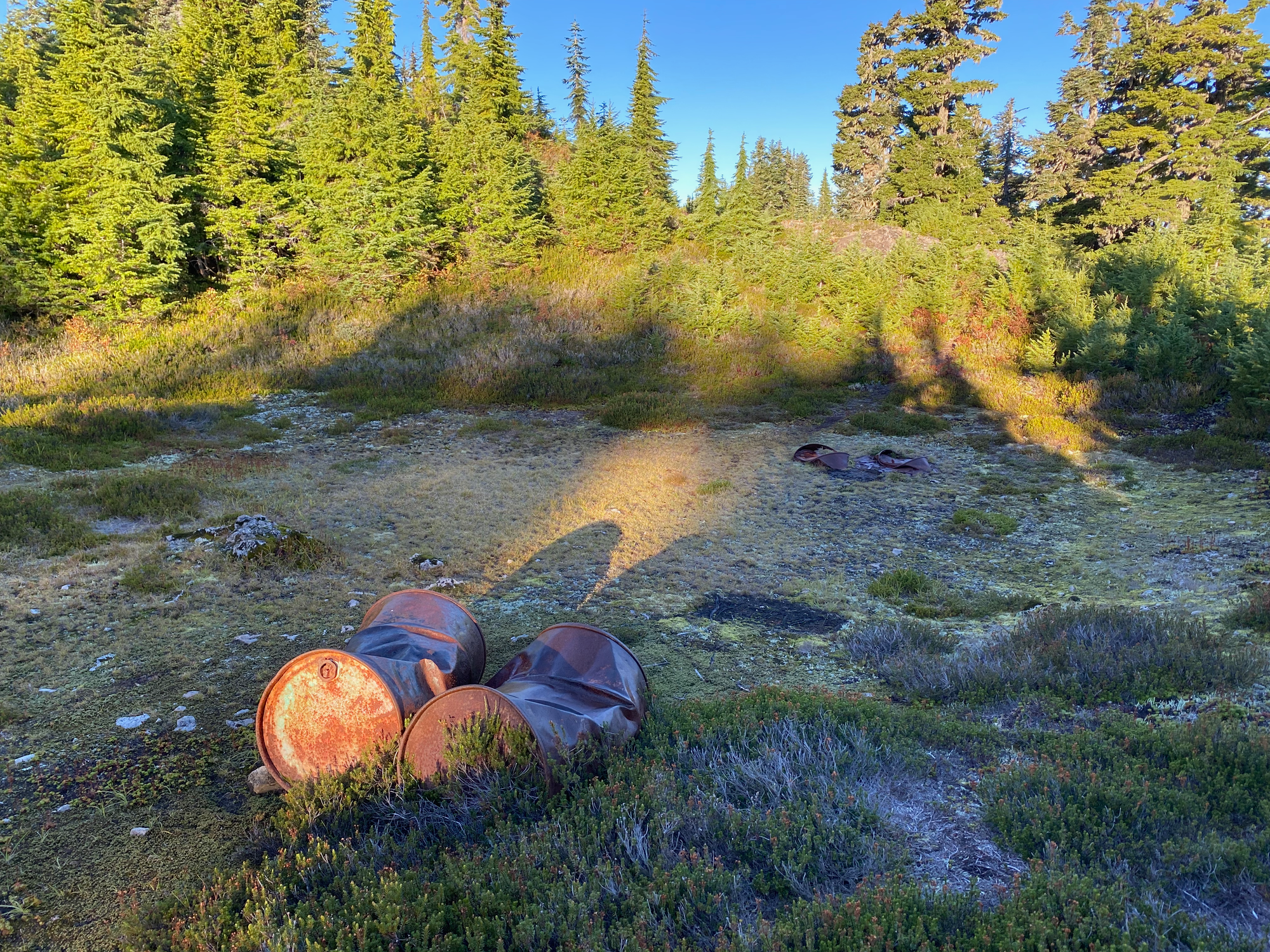 To my surprise, the flagged trail continued to the east. There’s a large clearing a few hundred metres east of Iron’s summit containing several iron barrels, probably the source of the mountain’s name. I wonder if a mining operation was attempted here at some point.