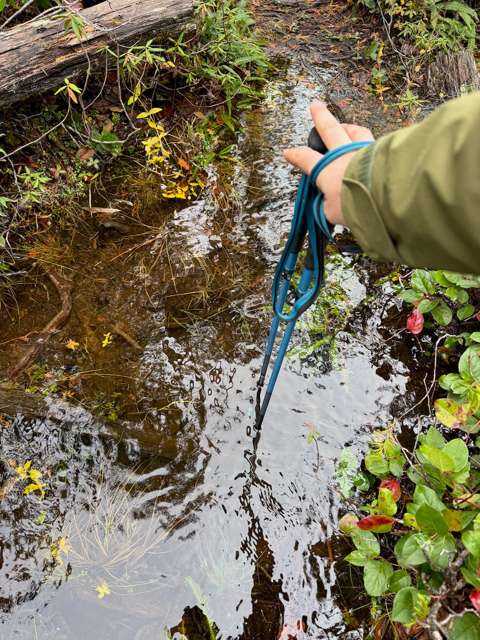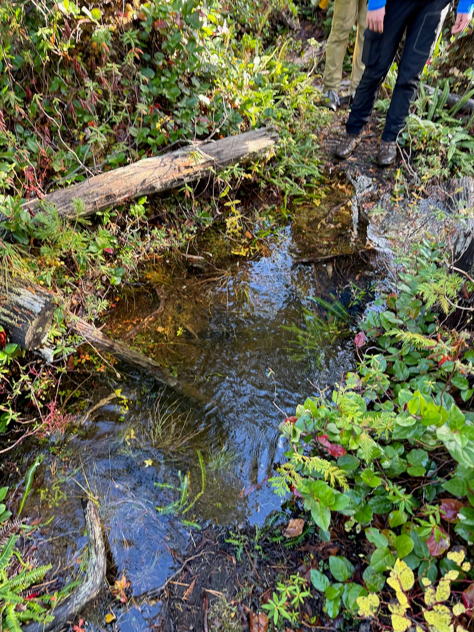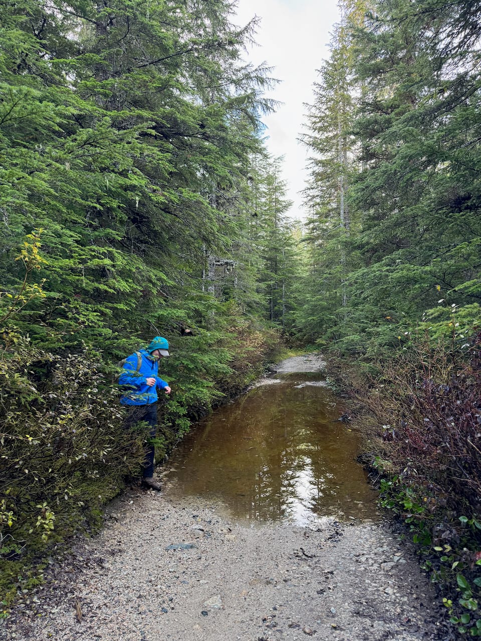 There are a few forks in the road, but the correct route has been marked with extensive flagging tape for most of them. After yesterday’s atmospheric river, there were massive puddles in places. We had to bushwhack around them.