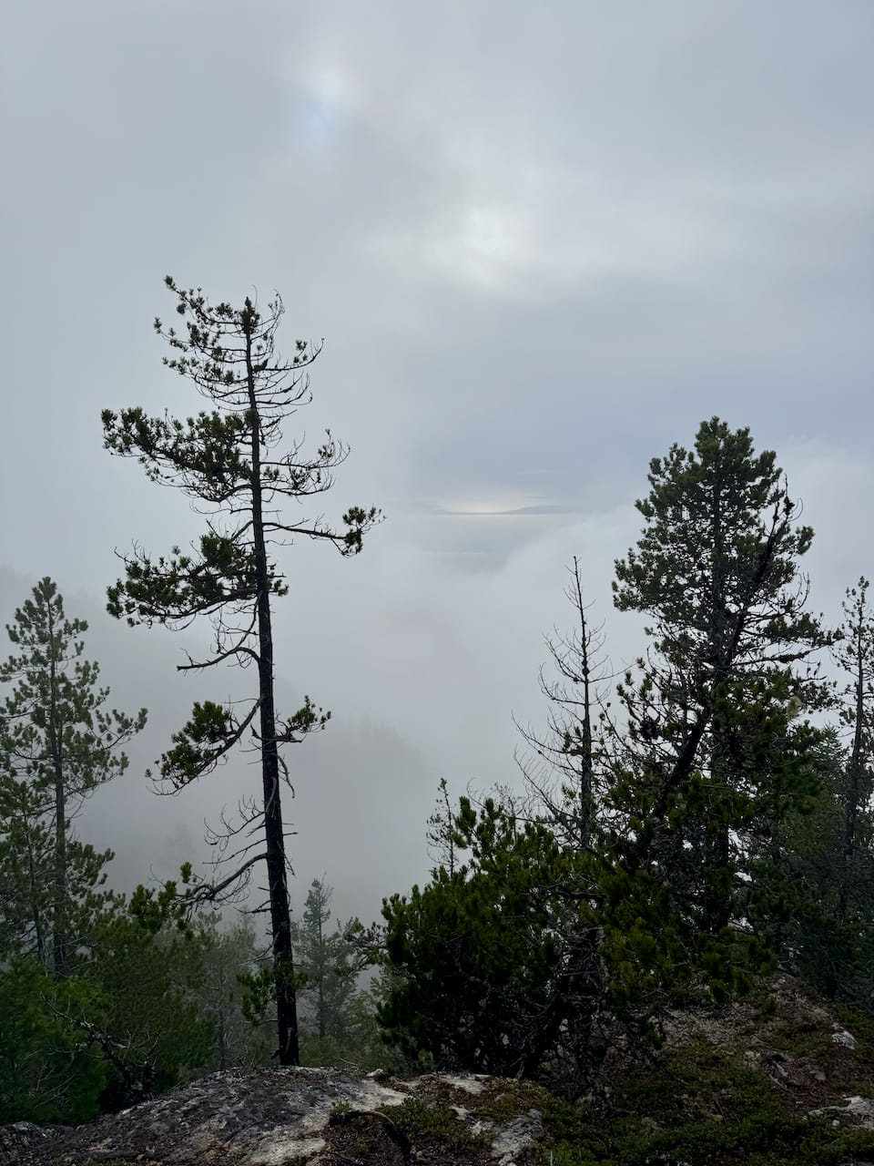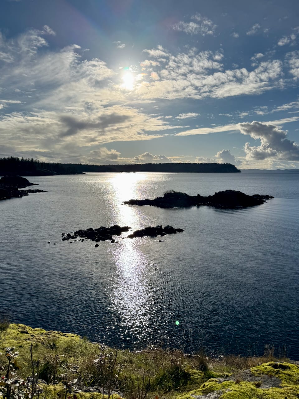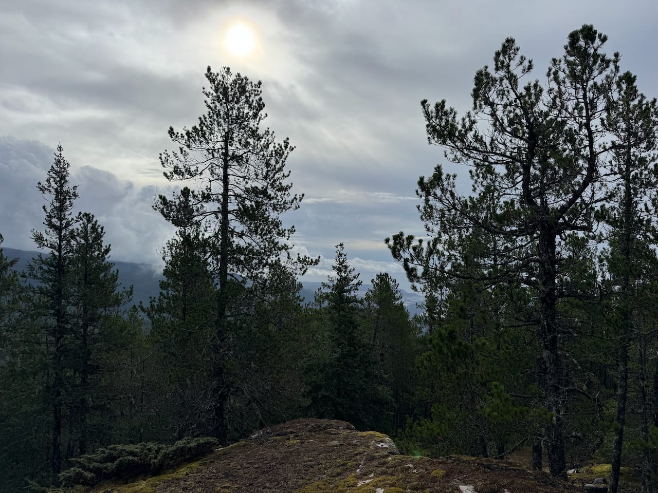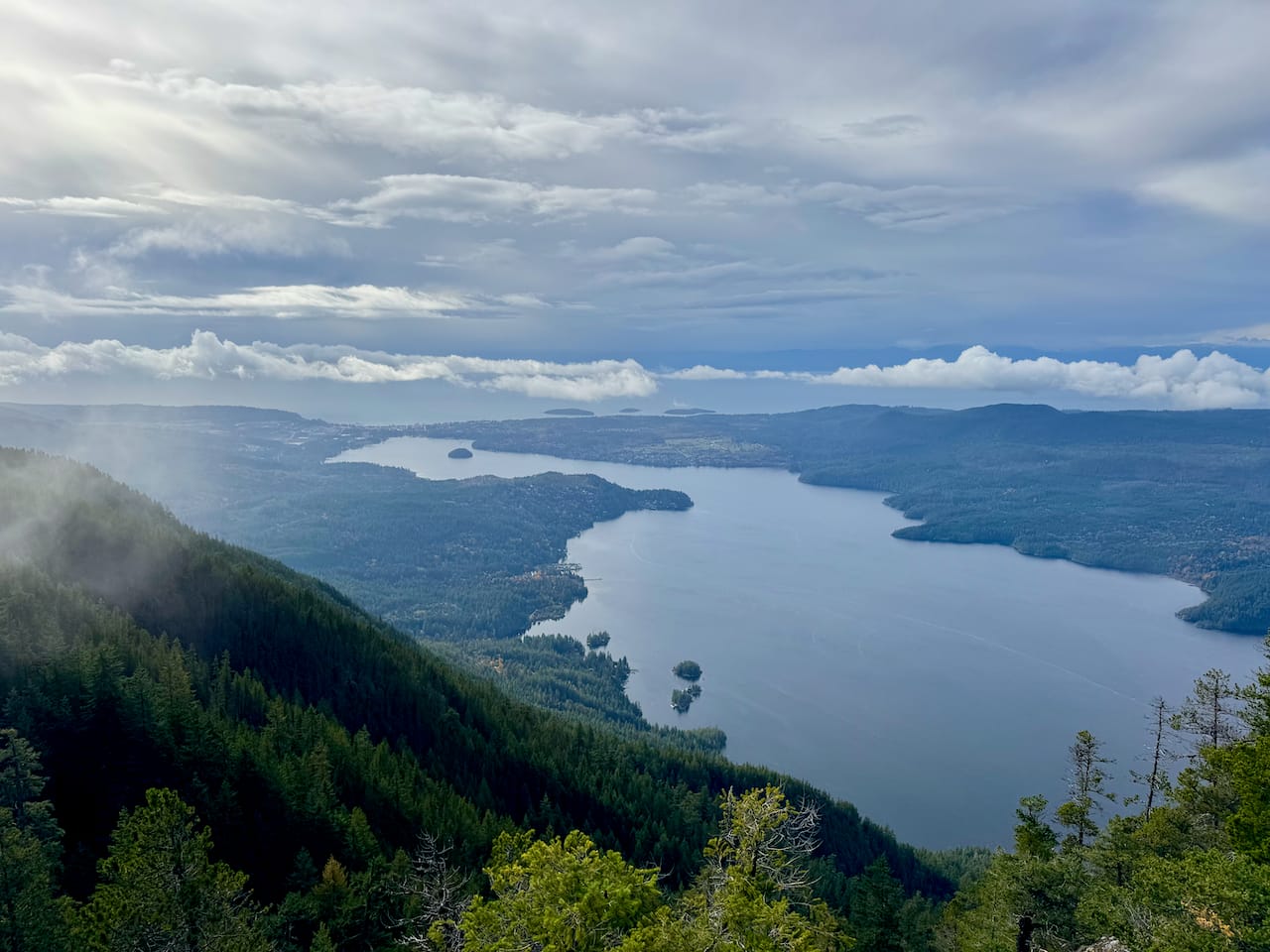 The trail ends at the hiker’s summit, with some views through the trees. The views significantly improved as we scrambled downhill along a bluff. You’re right above Sechelt Inlet and the town of Sechelt. In the distance, shifting clouds provided ephemeral views of Vancouver Island.