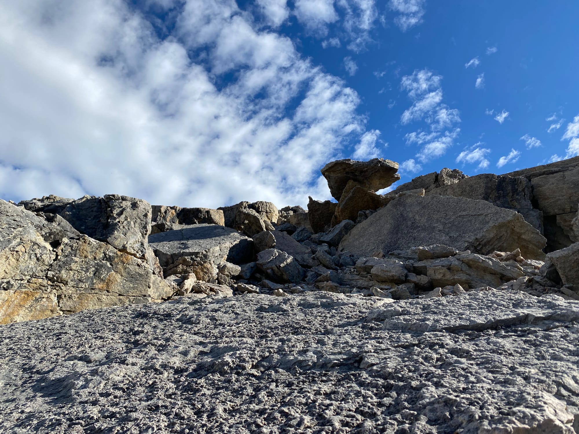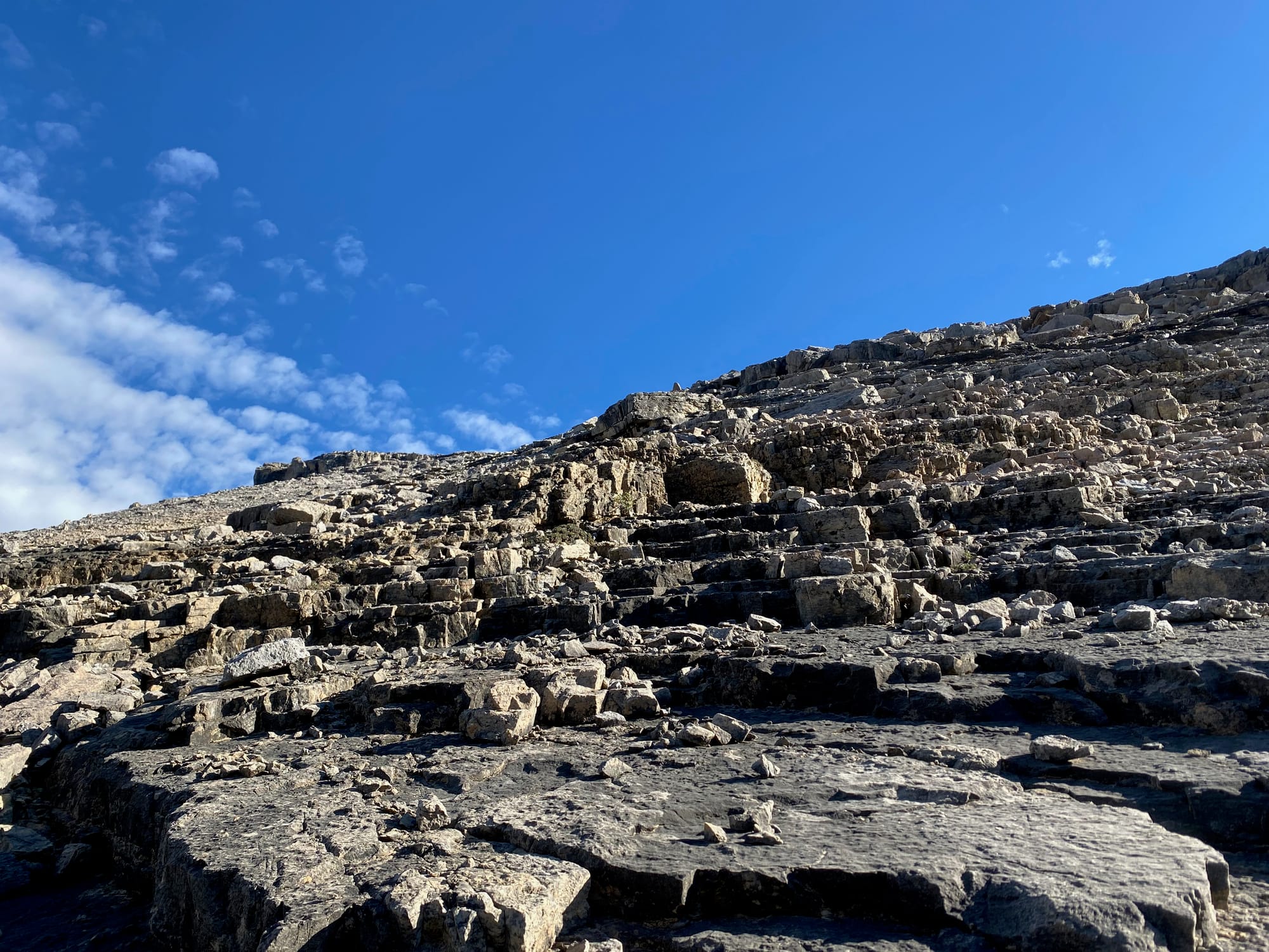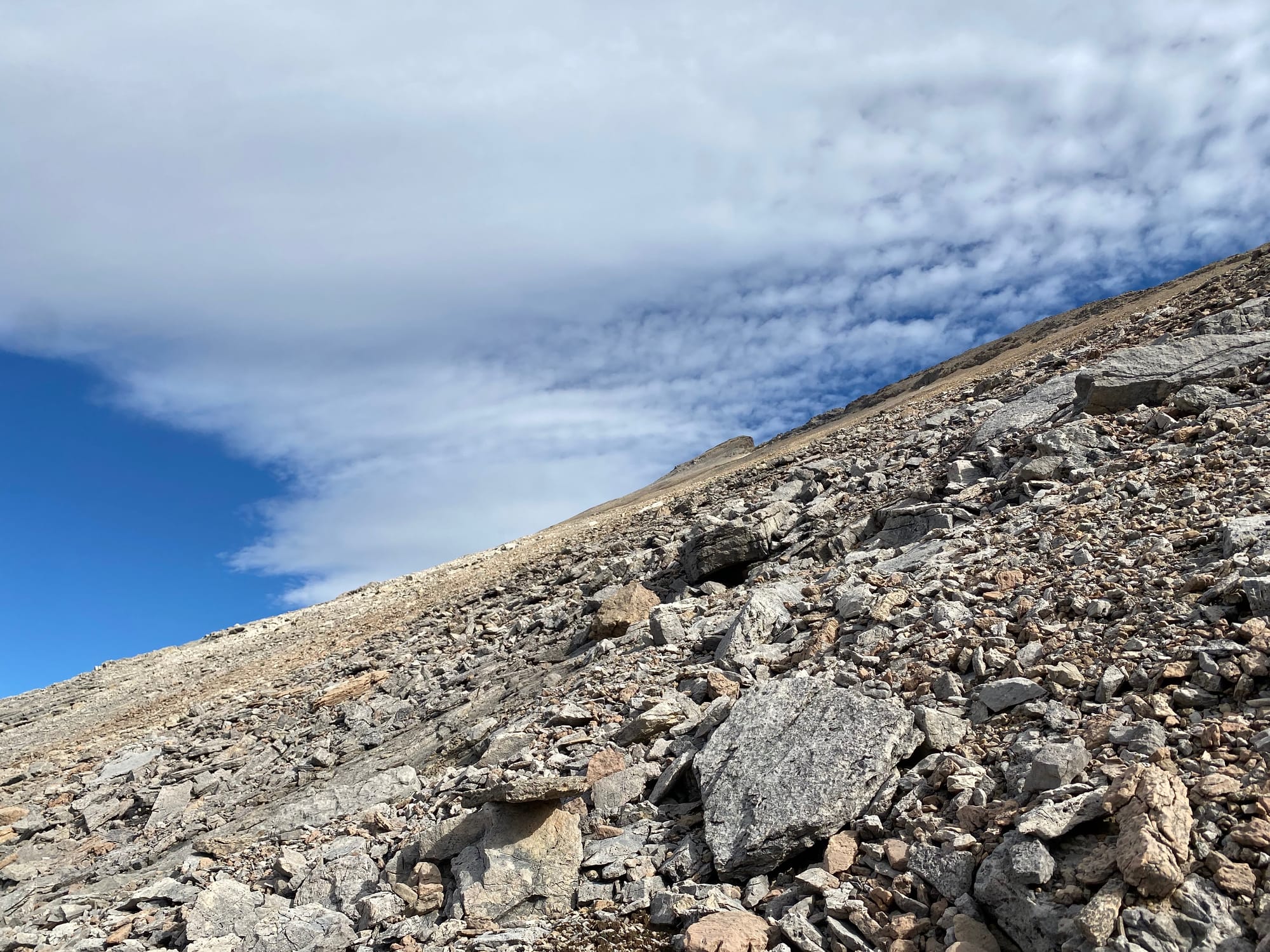 Around 2500m, there was one cliff band, but this could be passed with some class 2 scrambling, maybe Rockies class 3 in places. I kept heading northeast until around 2600m, when I turned northwest towards the summit.