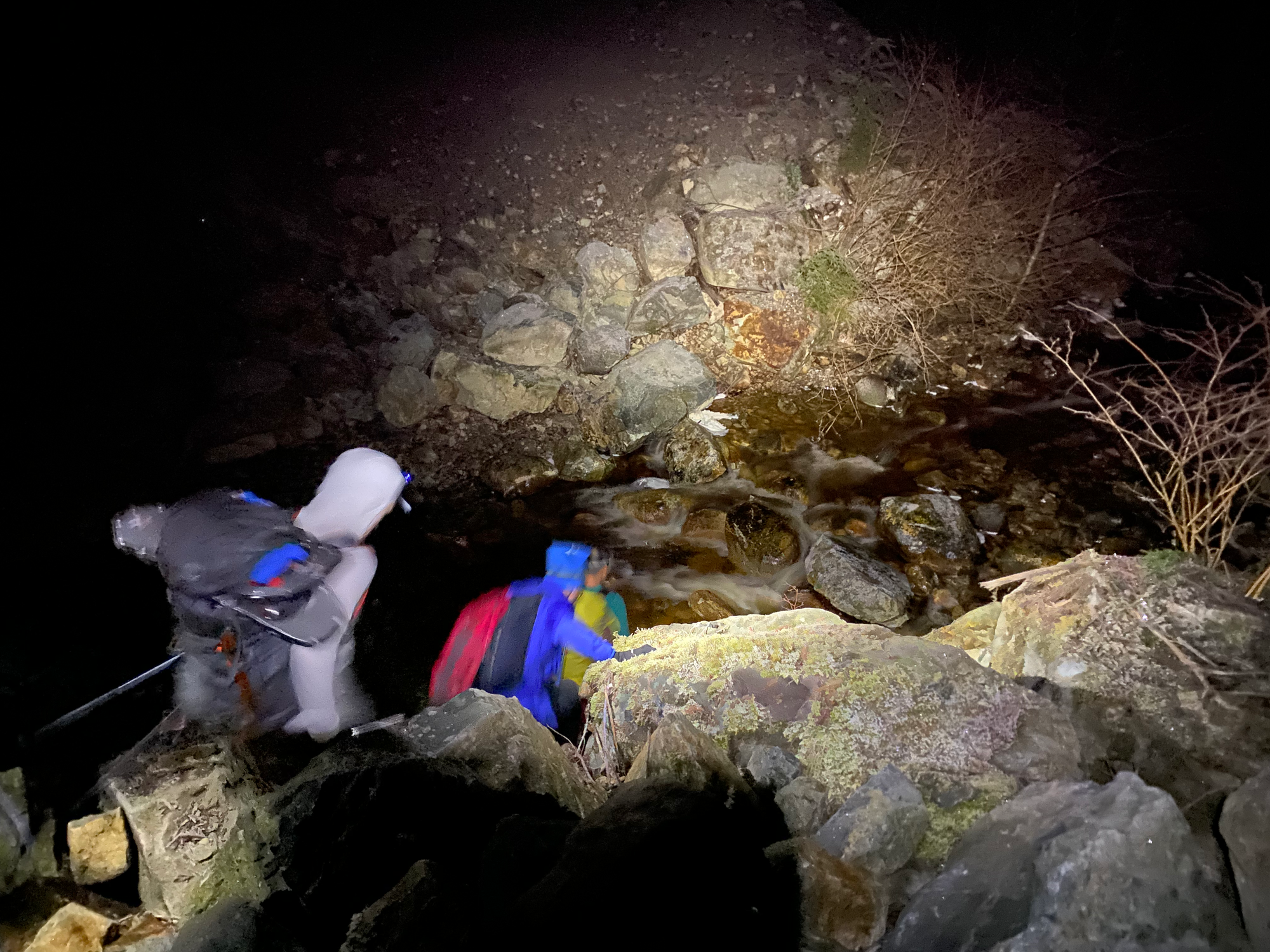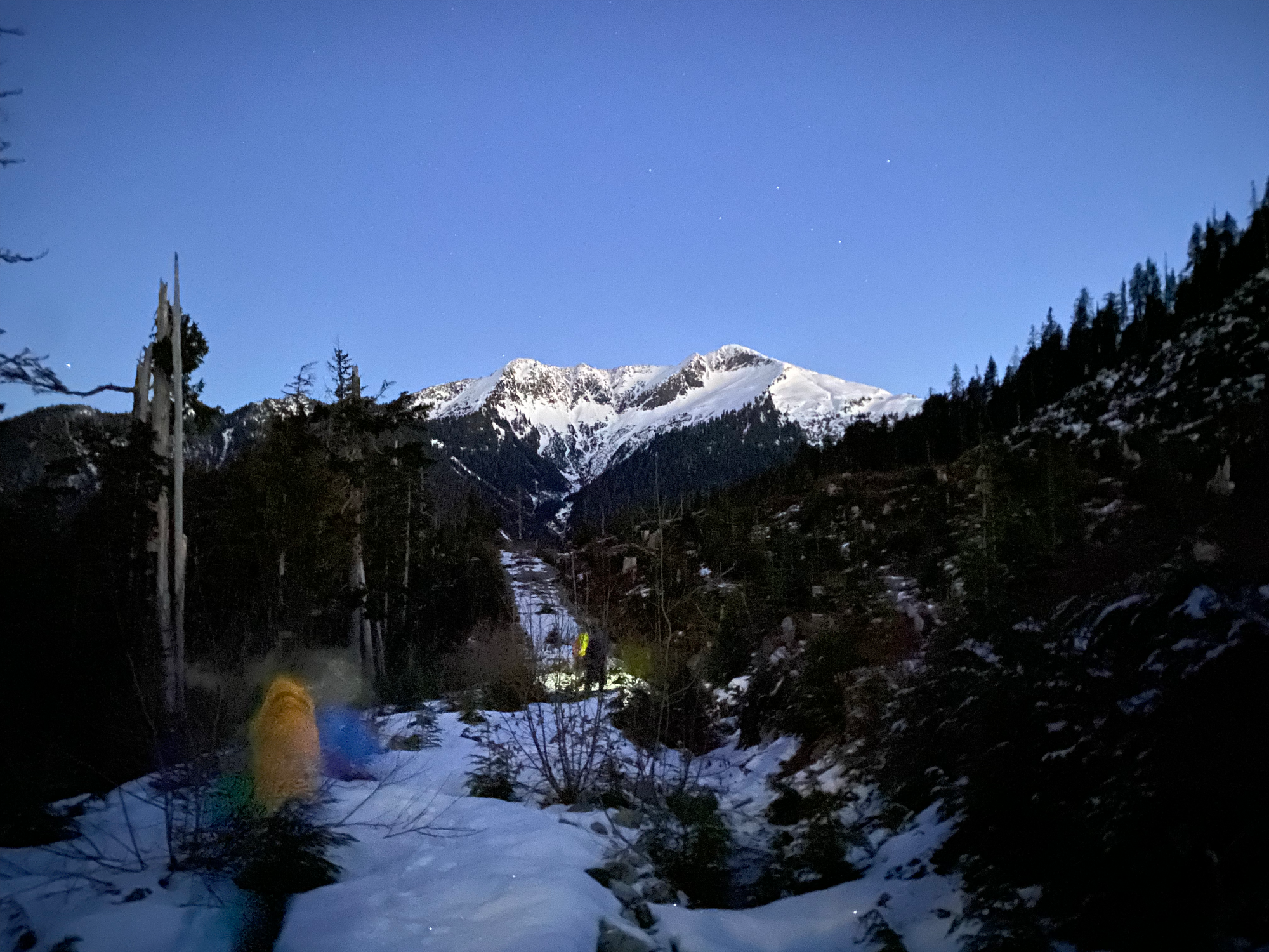 At about 700m we left Matt’s route to avoid something he described as “the swamp”. We took the left branch at a fork in the road, which had some small alders but not enough to impact our travel. As we rounded the corner, we caught our first view of our destination in the dim light.