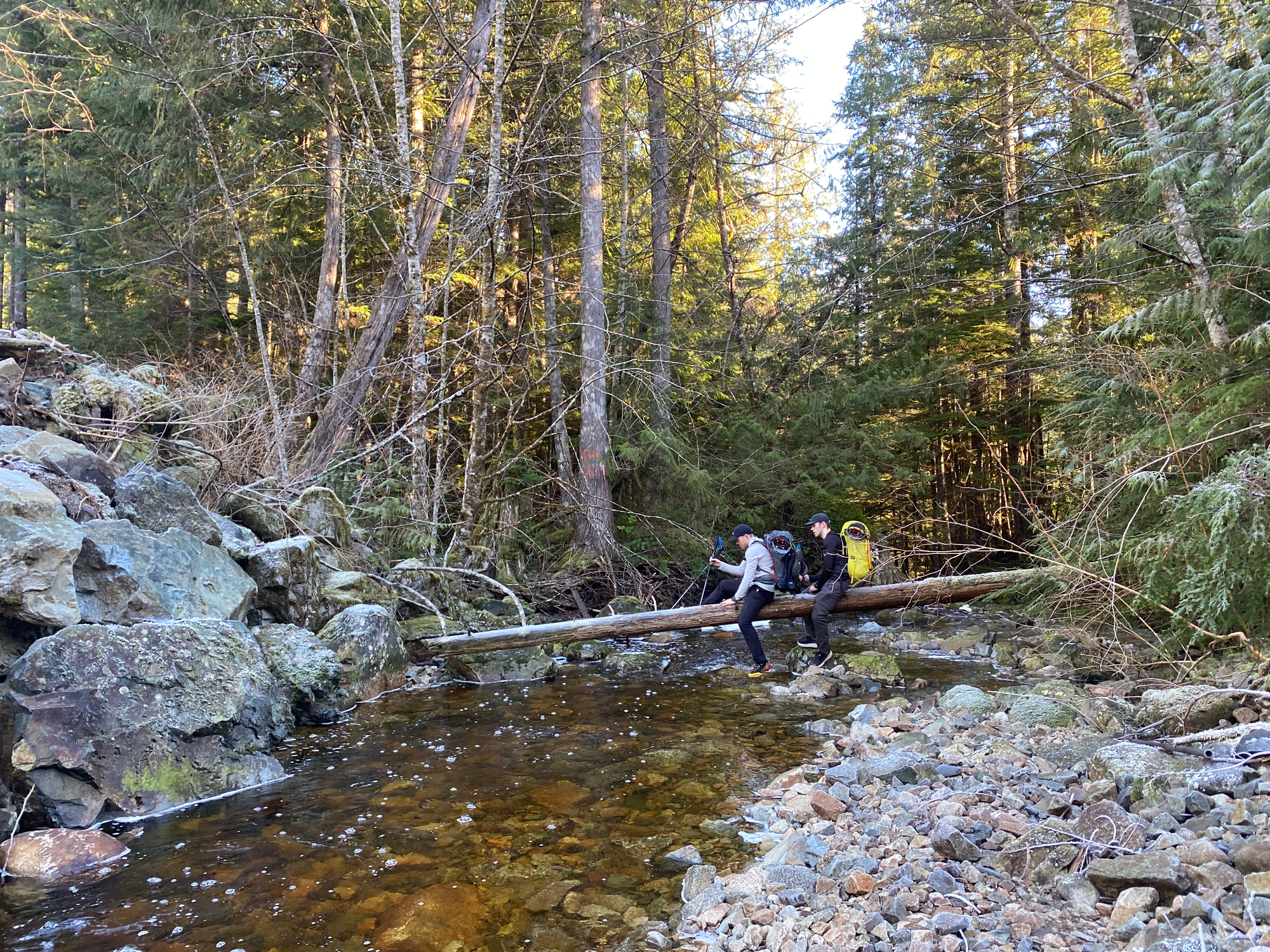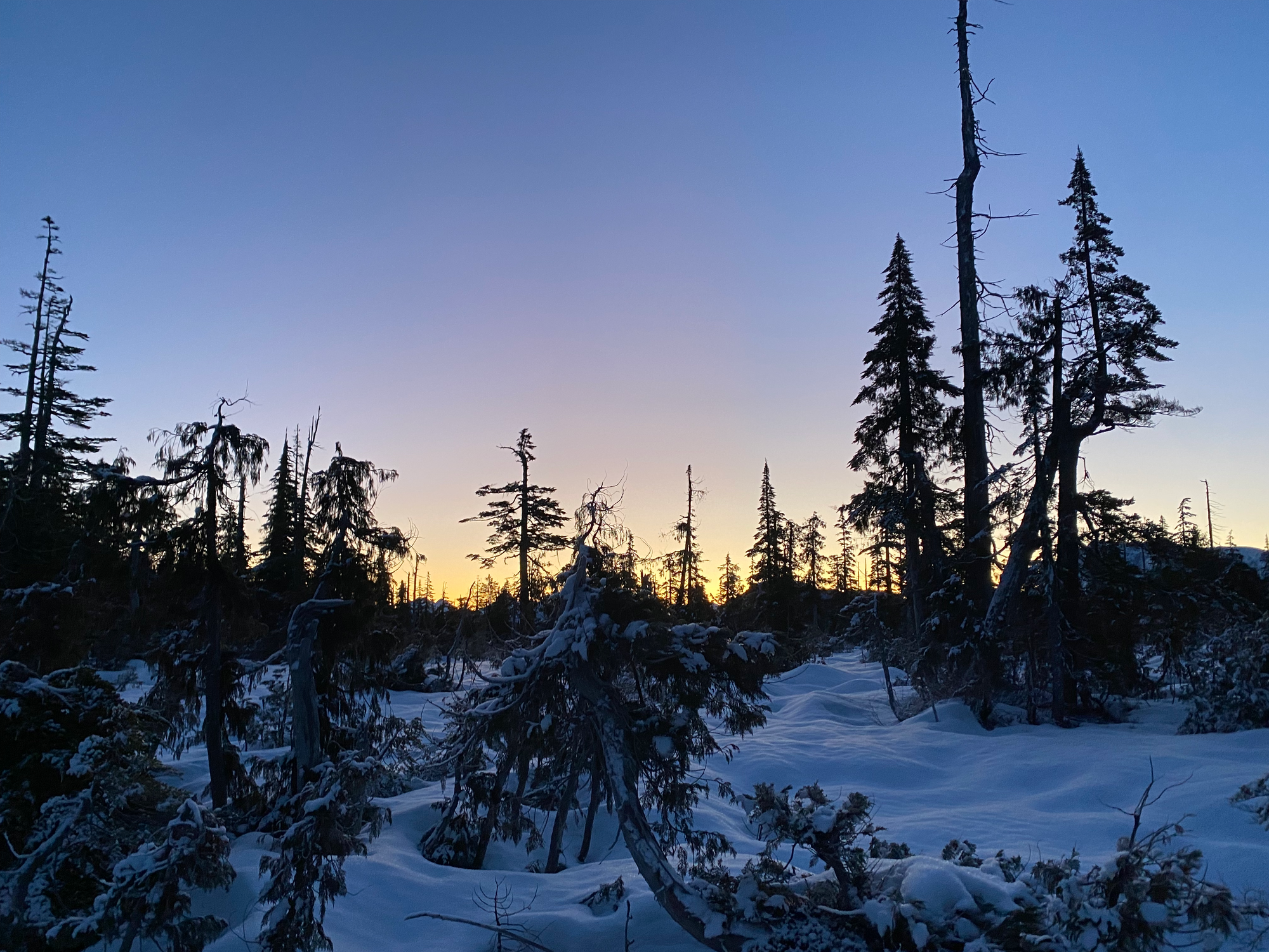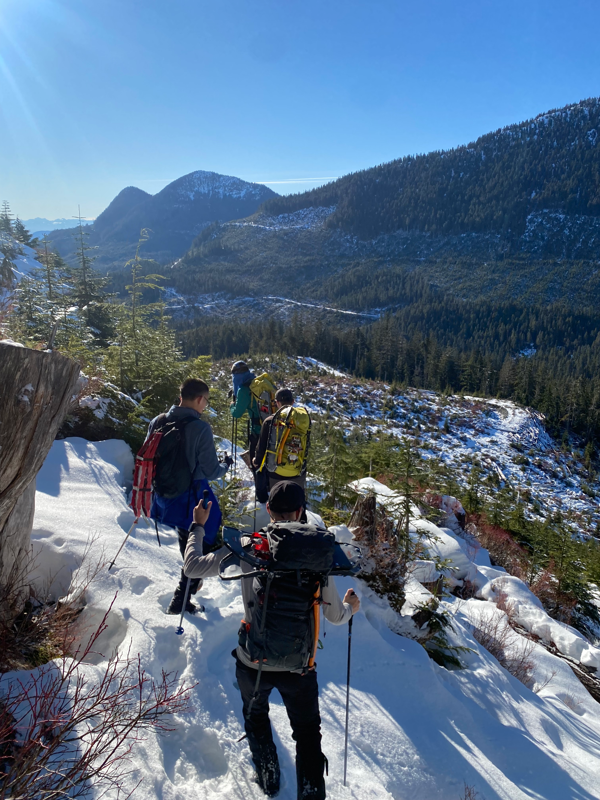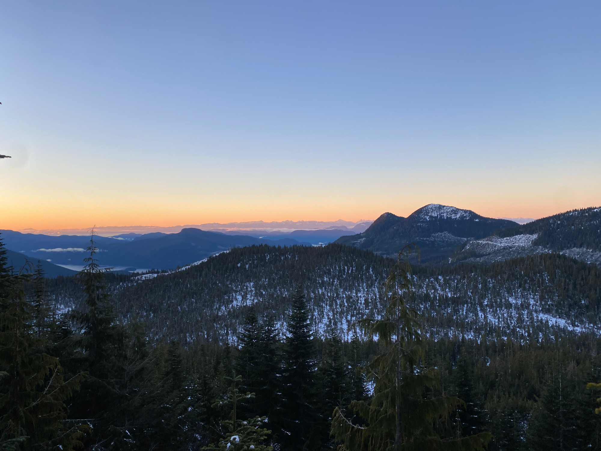 Once above the cut block, we continued through a flat swampy area of ancient forest. There were several small ponds, some of which were frozen over. At one point someone’s foot fell through the ice. The sun rose; through the trees, the distant peaks of northern Vancouver Island were bathed in an orange glow.