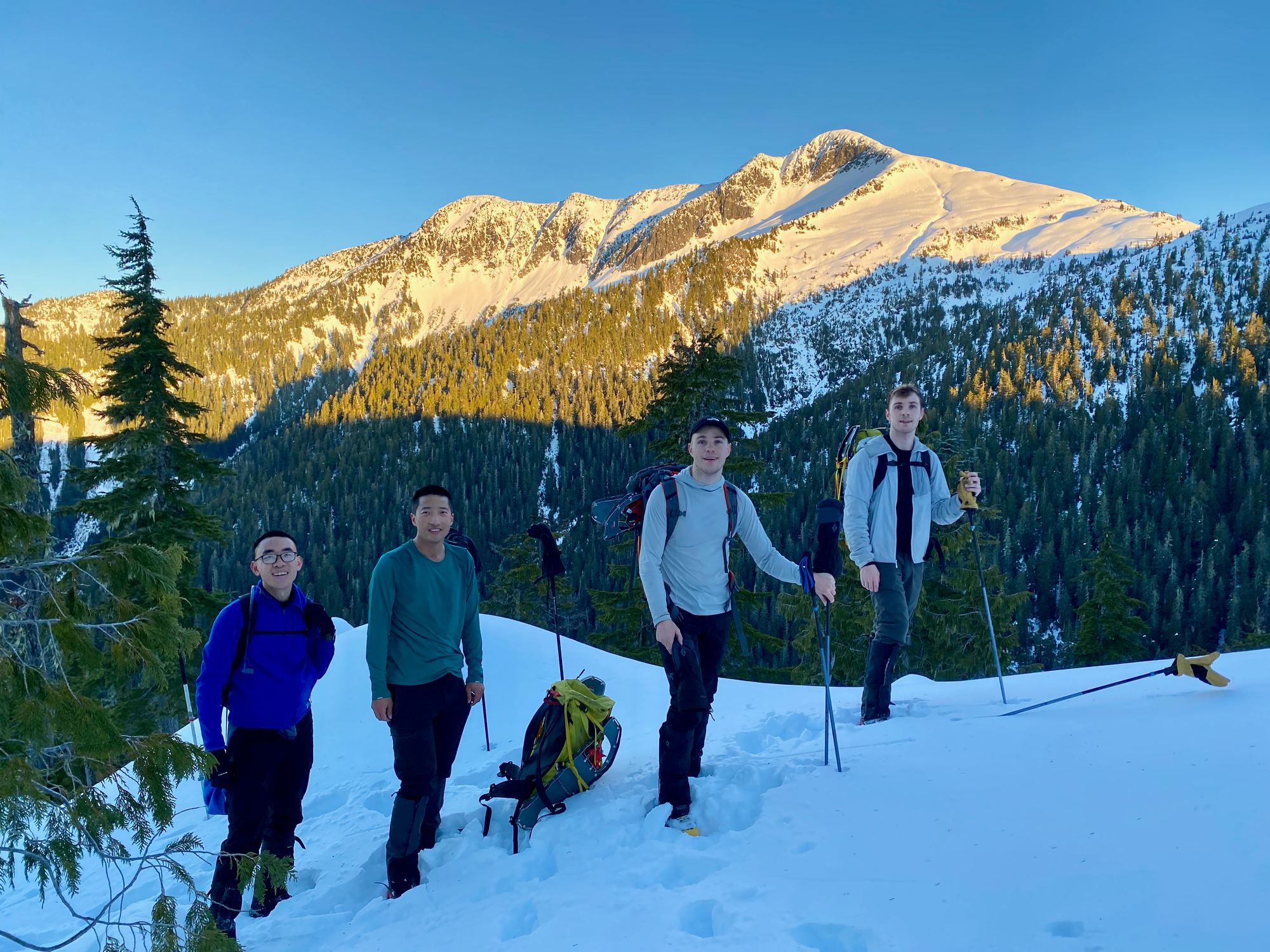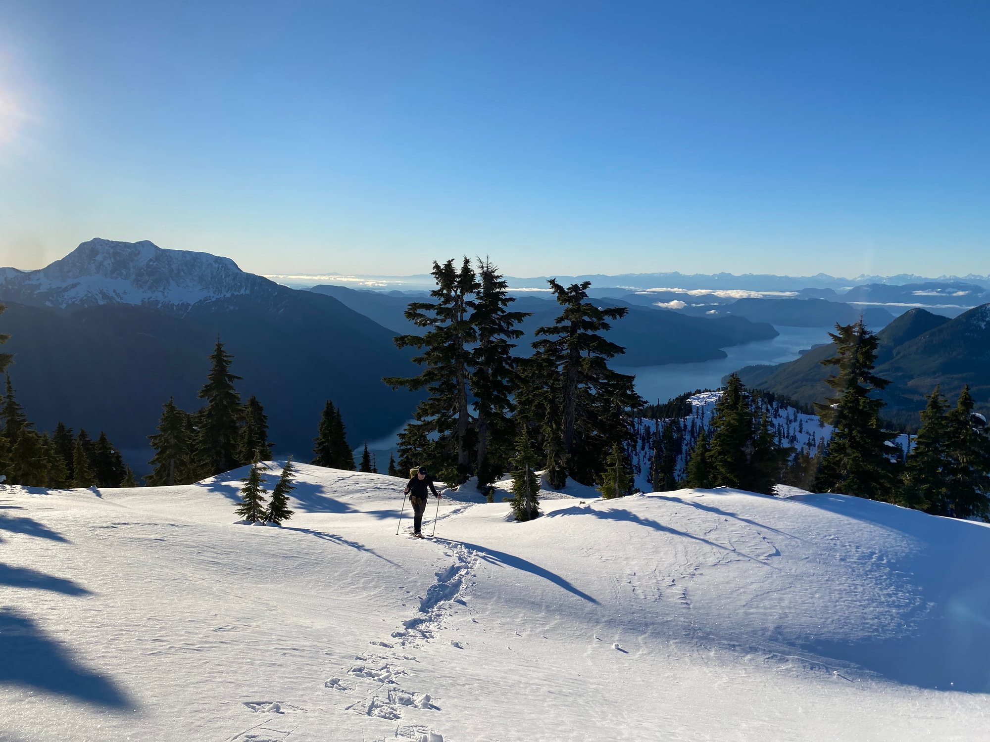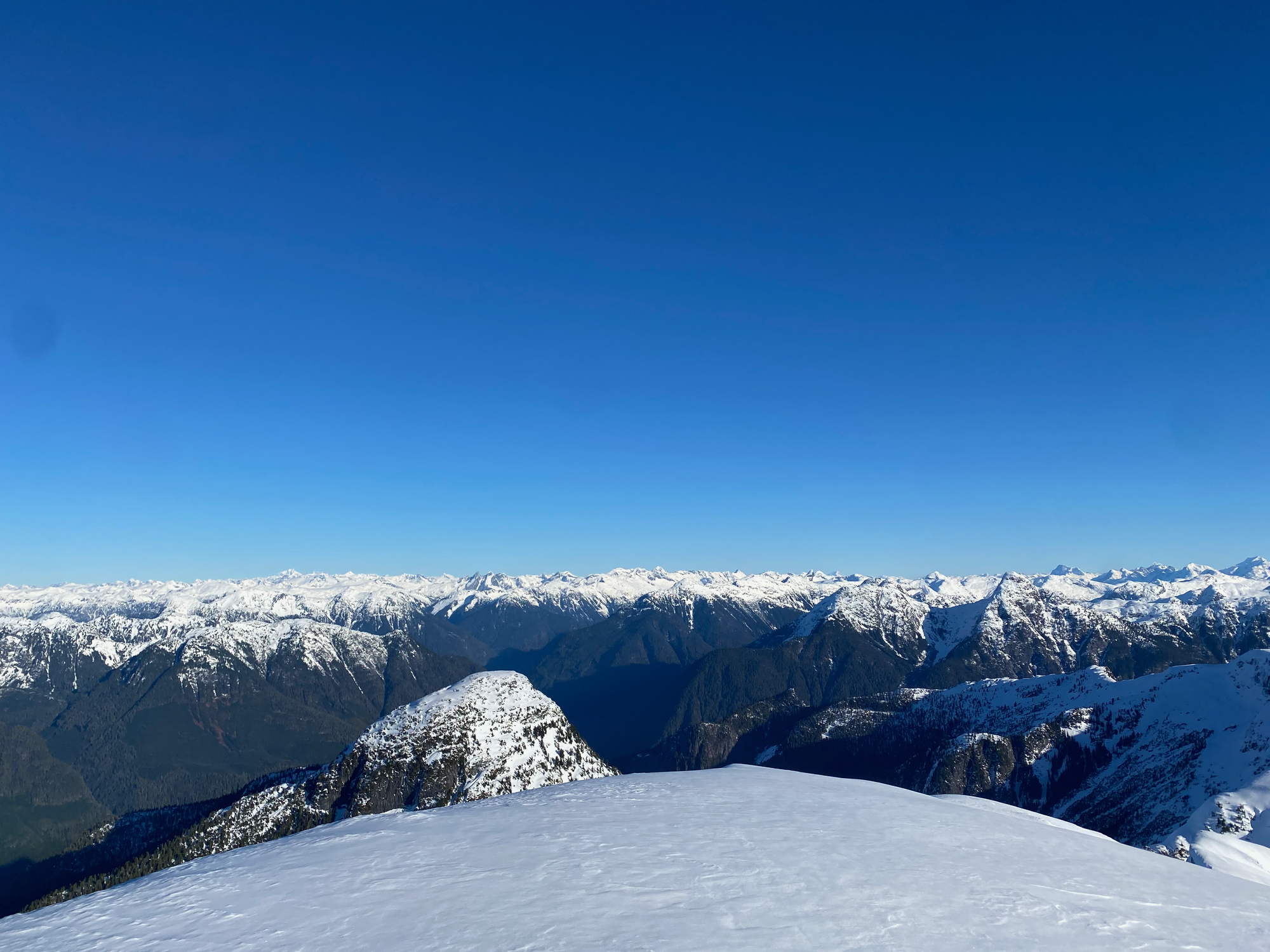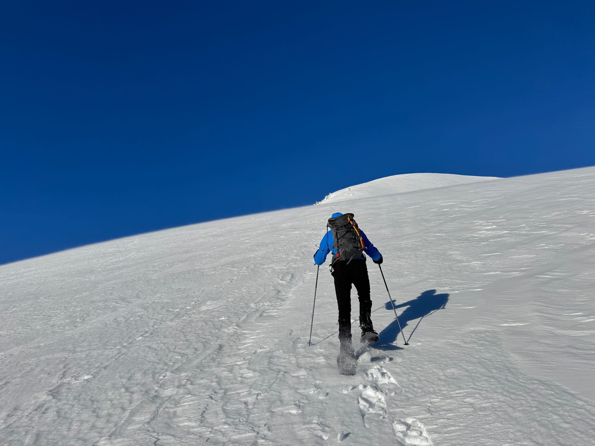 This was followed by a steep climb with one short scrambly section, which led to the tip of the SE Ridge. We left our ice axes and crampons here due to the solid snow quality, but they would be needed in icier conditions.
