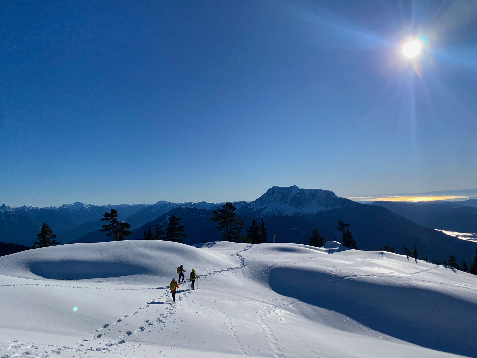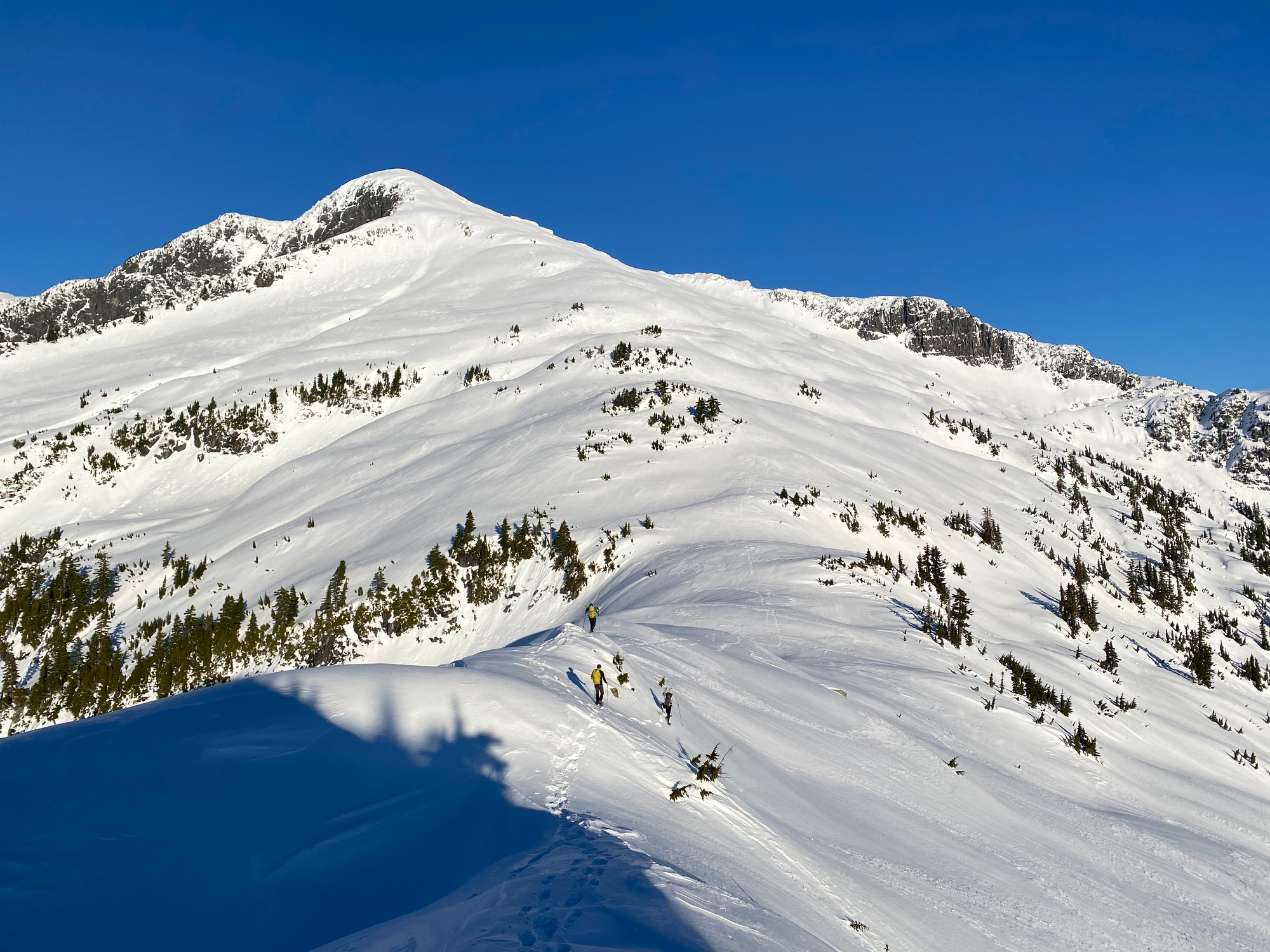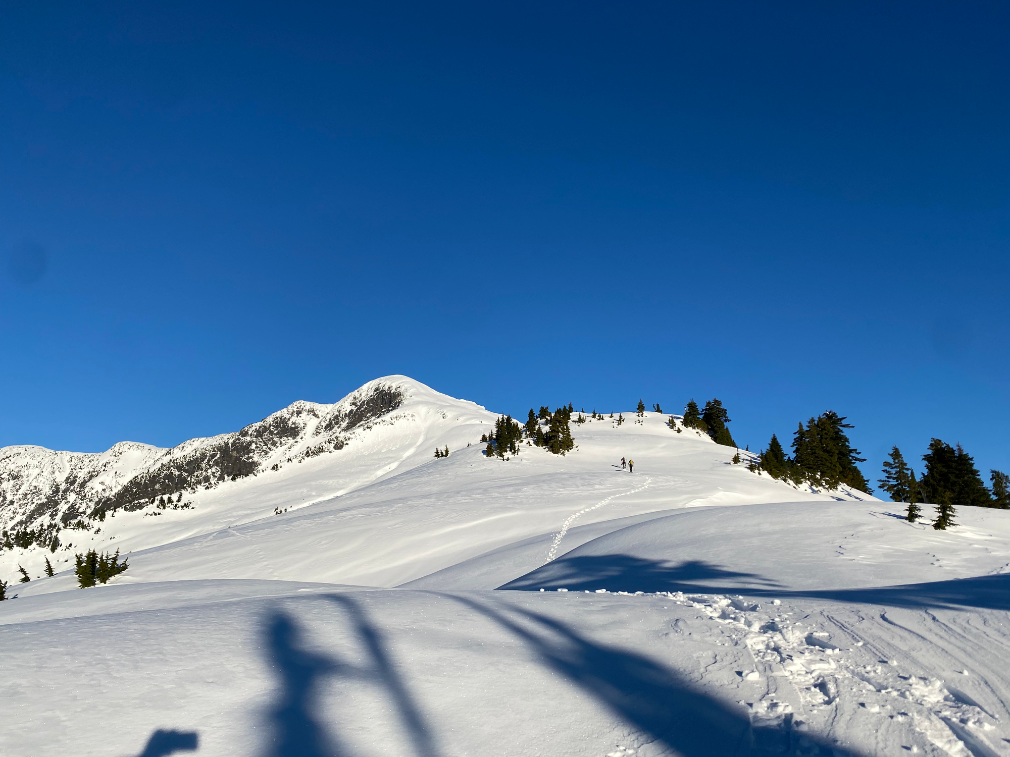 From here we went towards the peak along the ridge. We ascended, traversed, and descended a few small bluffs, but the overall route was obvious. The snow quality was perfect, able to support our weight without being icy.
