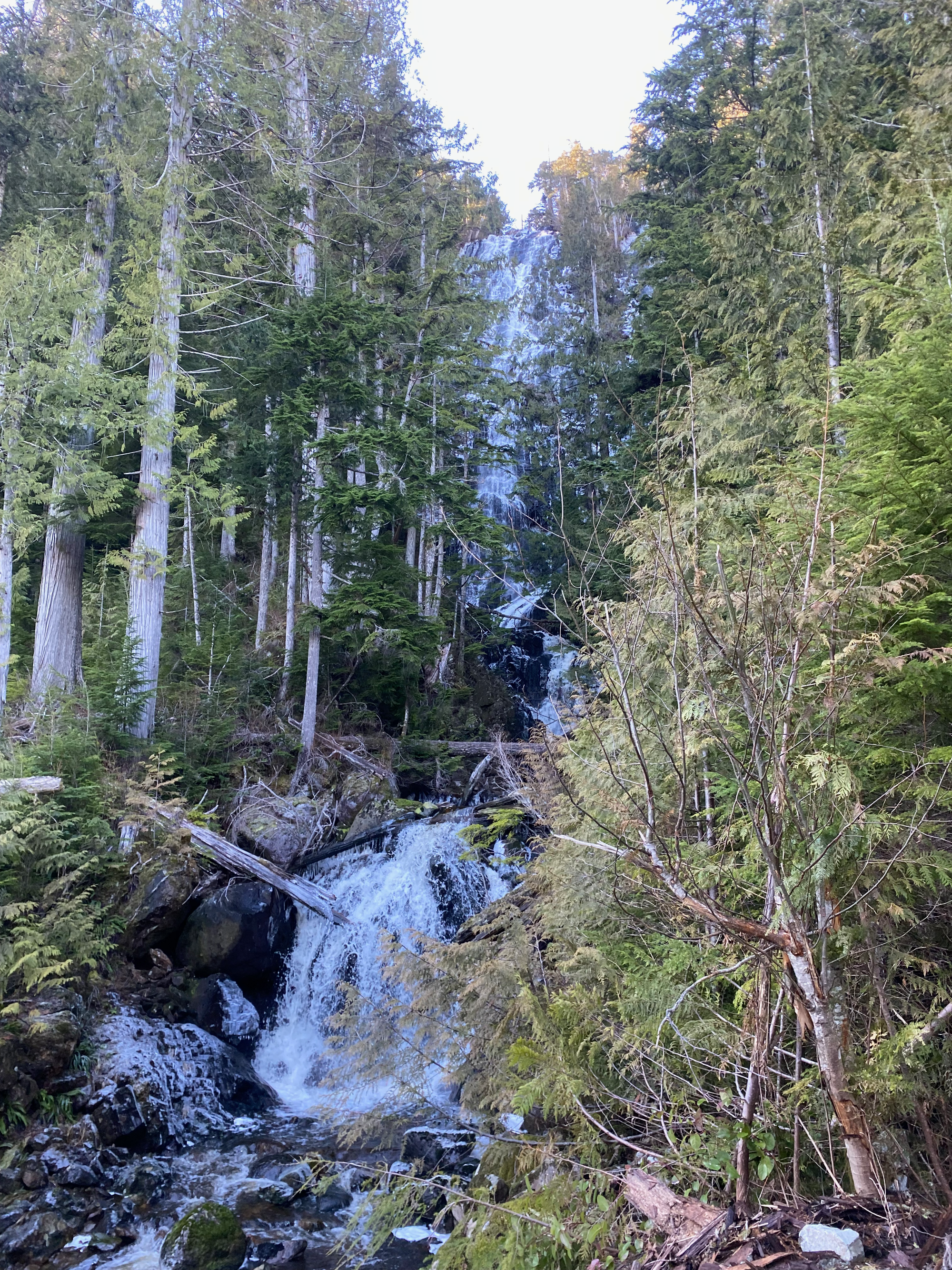 Soon we were back on the road. We jogged/walked down, stopping every few seconds to negotiate another ditch. For most of the descent we could see Estero Peak through the trees and clearcuts. As we crossed the outflow of Anna Lake (about 480m elevation), we noticed a massive waterfall that was also invisible on the ascent. As far as I know it is unnamed, and there’s nothing about it online.